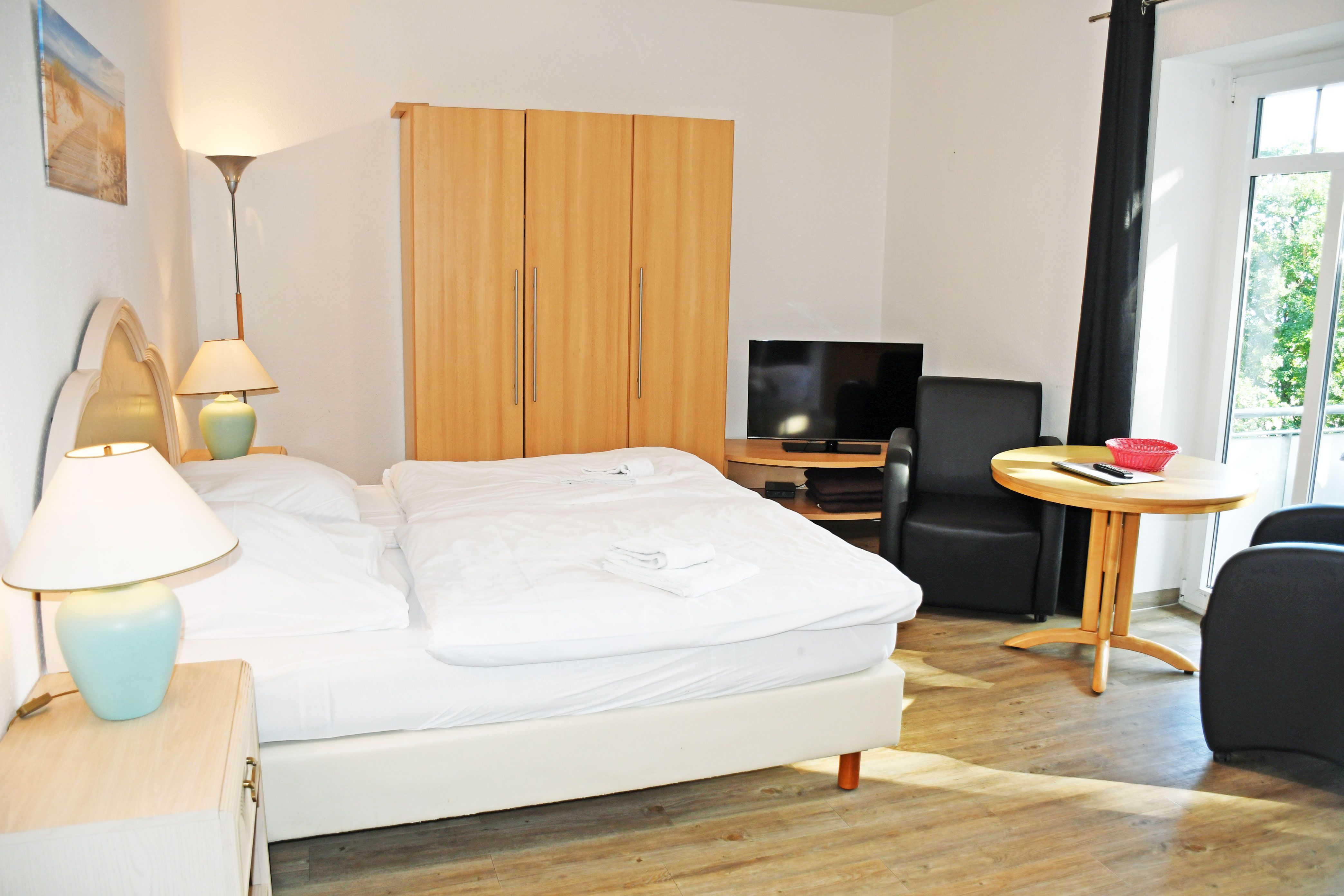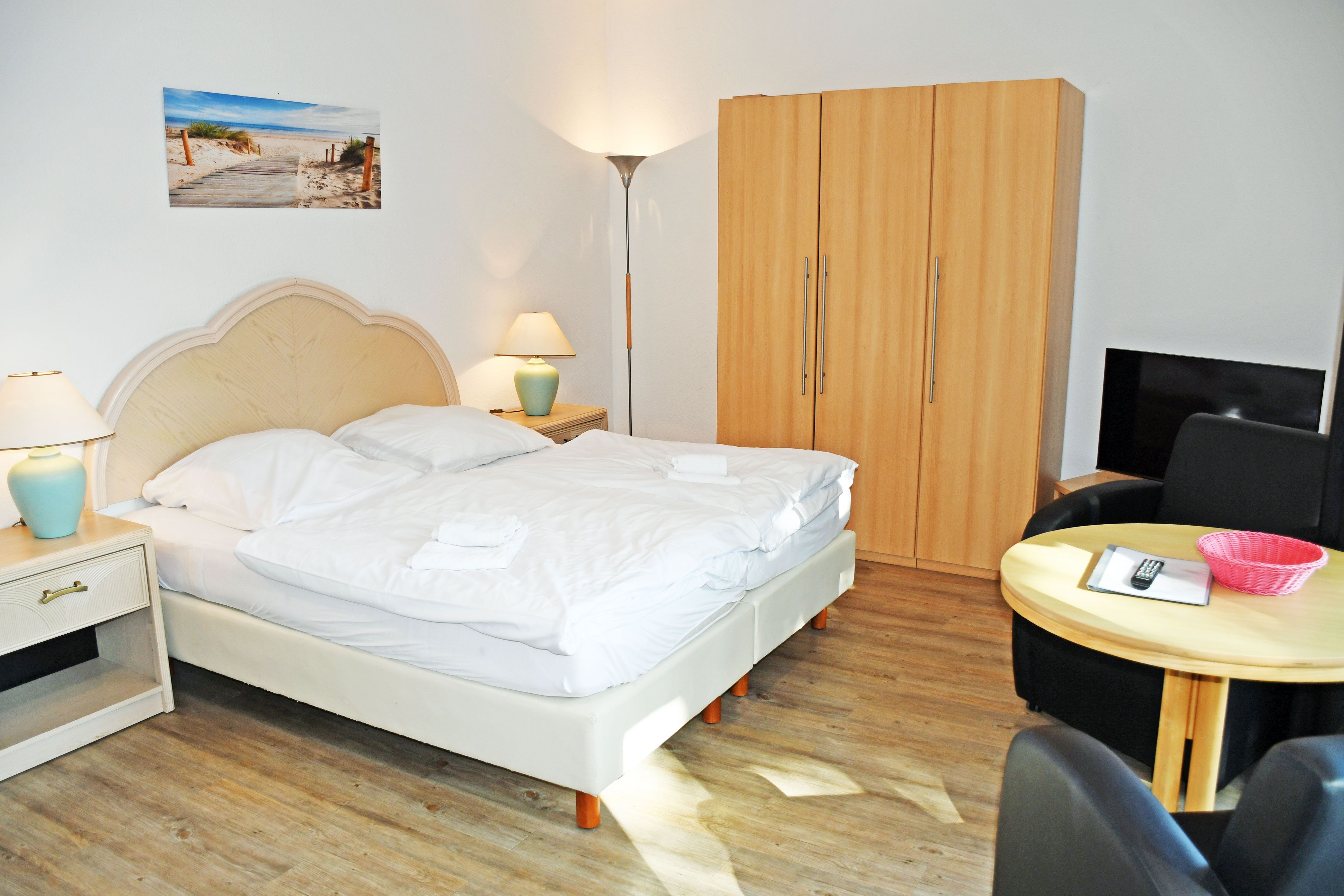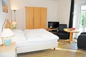 kombinierter Wohn-/Schlafraum mit Doppelbett (180 x 200 cm), Nachttischen, großem Kleiderschrank, Tisch mit 2 Ledersesseln, Anrichte mit TV, Kofferablage