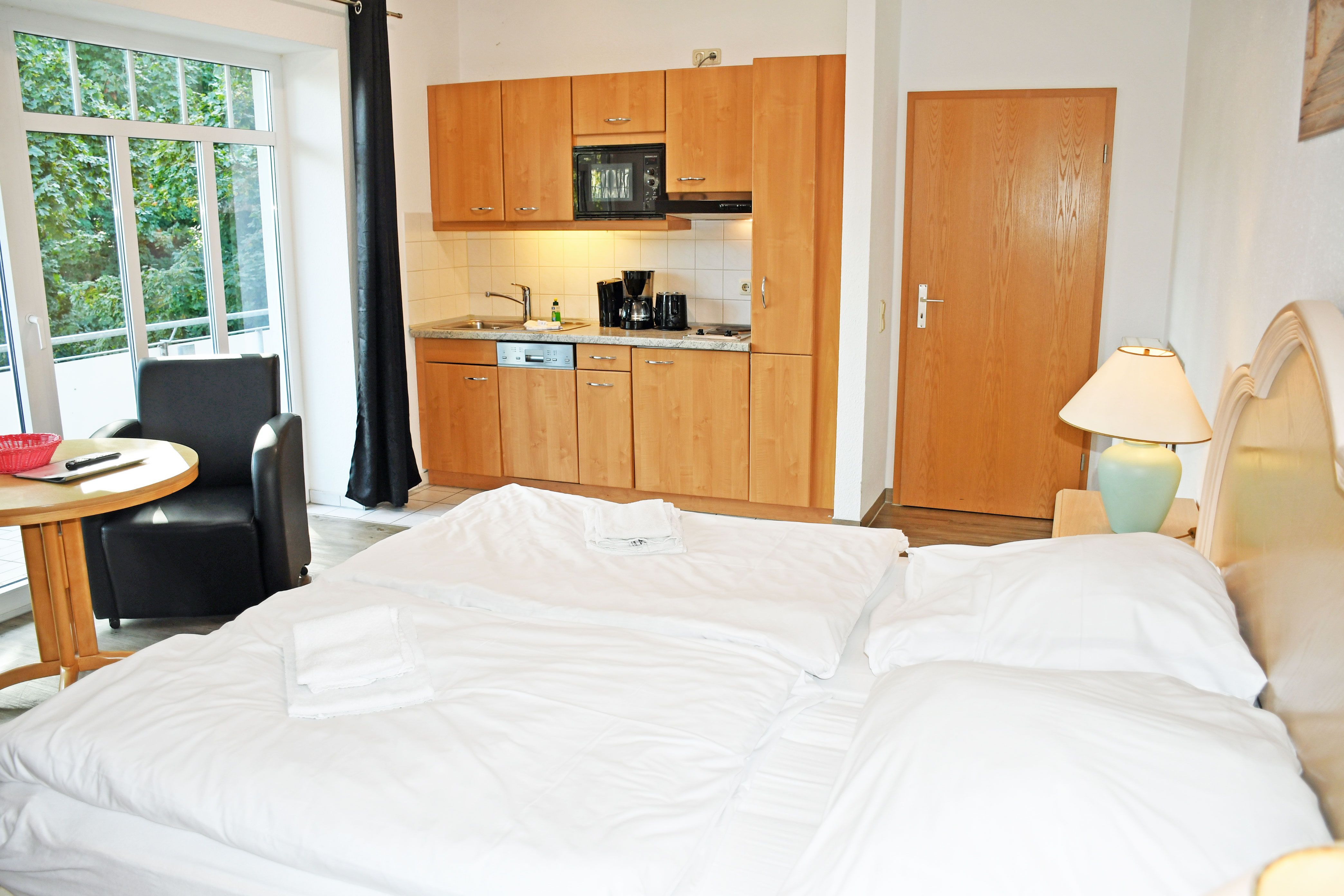 Unsere ruhig gelegenen, hellen und lichtdurchfluteten 1-Raum-Ferienwohnungen mit Balkon oder Terrasse sind wie folgt ausgestattet: