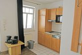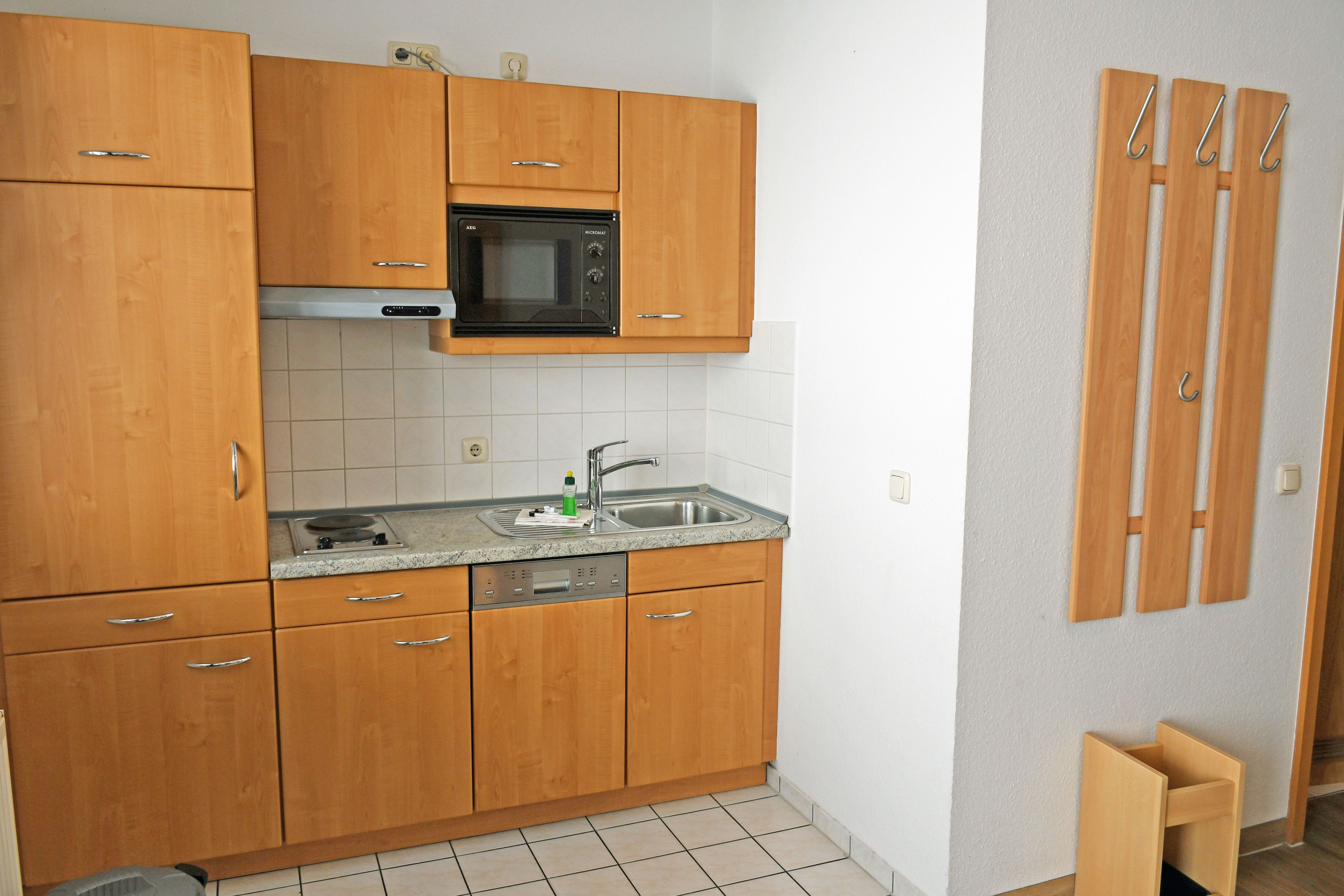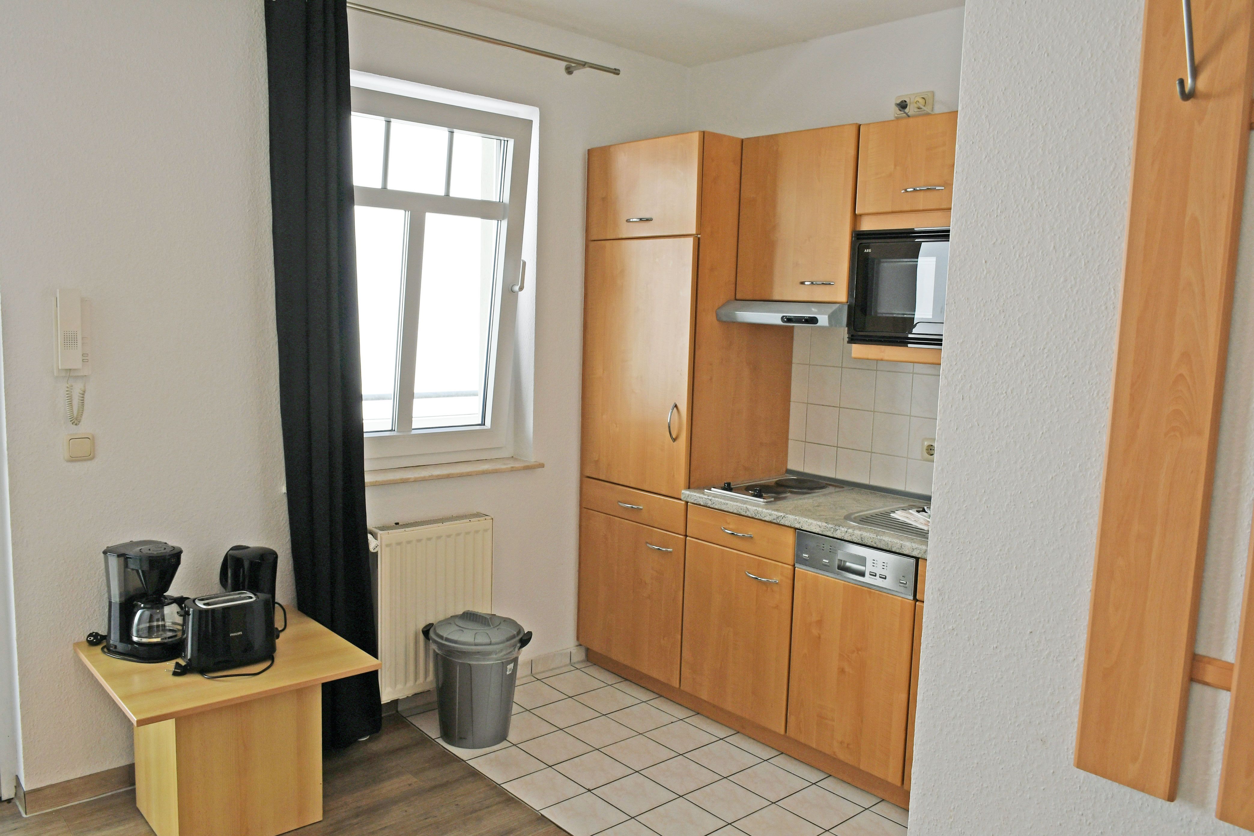Im Wohnraum integrierte Einbauküche, ausgestattet mit: 2-Platten-Kochfeld, Dunstabzugshaube, großer Kühlschrank mit Gefrierfach, Geschirrspüler, Toaster, Kaffeemaschine, Wasserkocher und Küchenutensilien