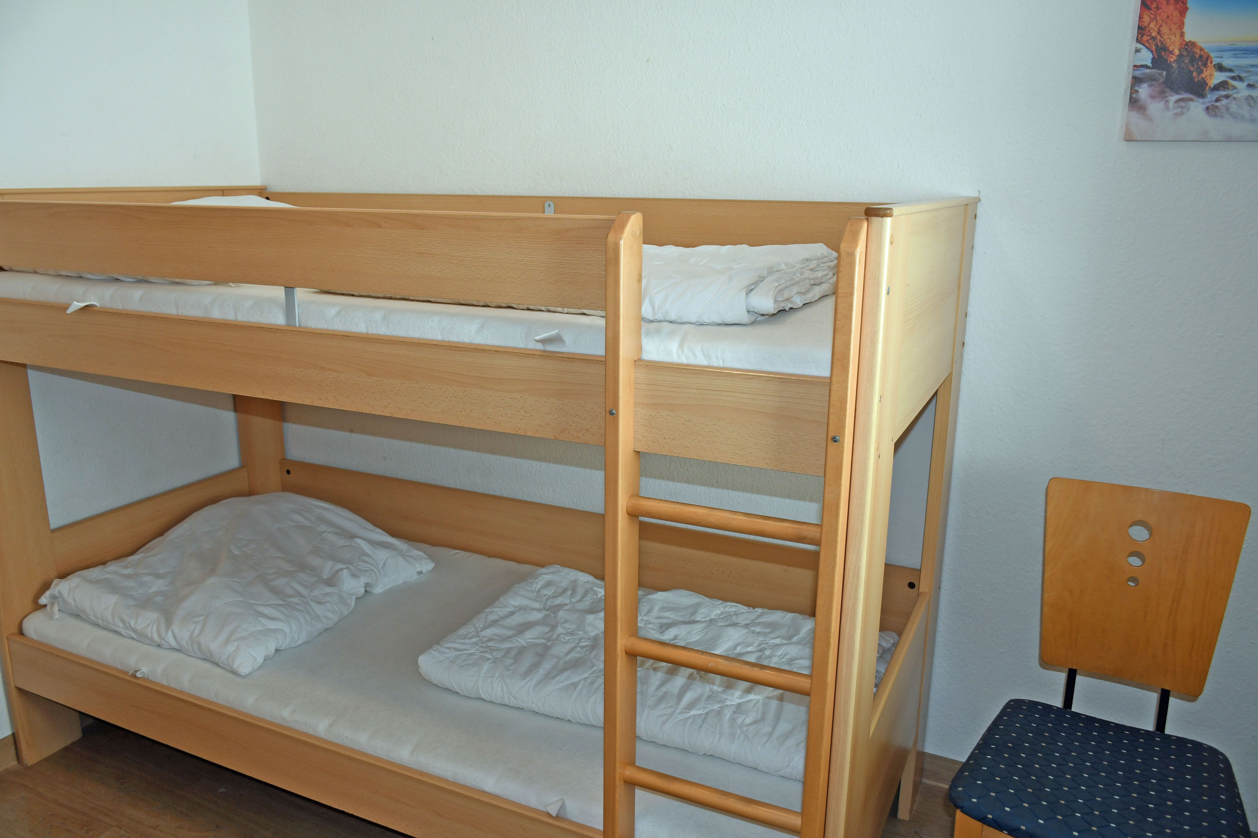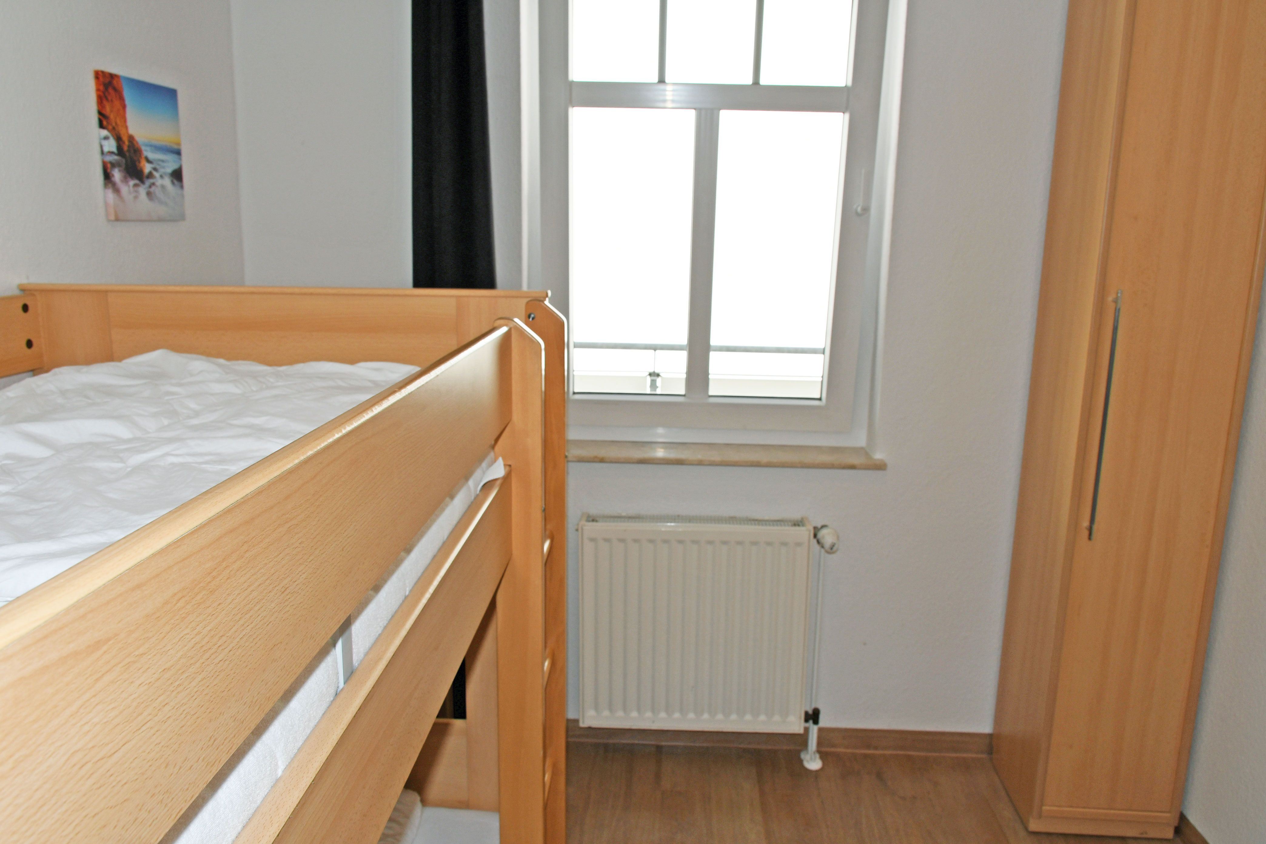 Schlafzimmer mit 2 getrennt stehenden Betten (90 x 200 cm) bzw. Etagenbett und kleinem Kleiderschrank