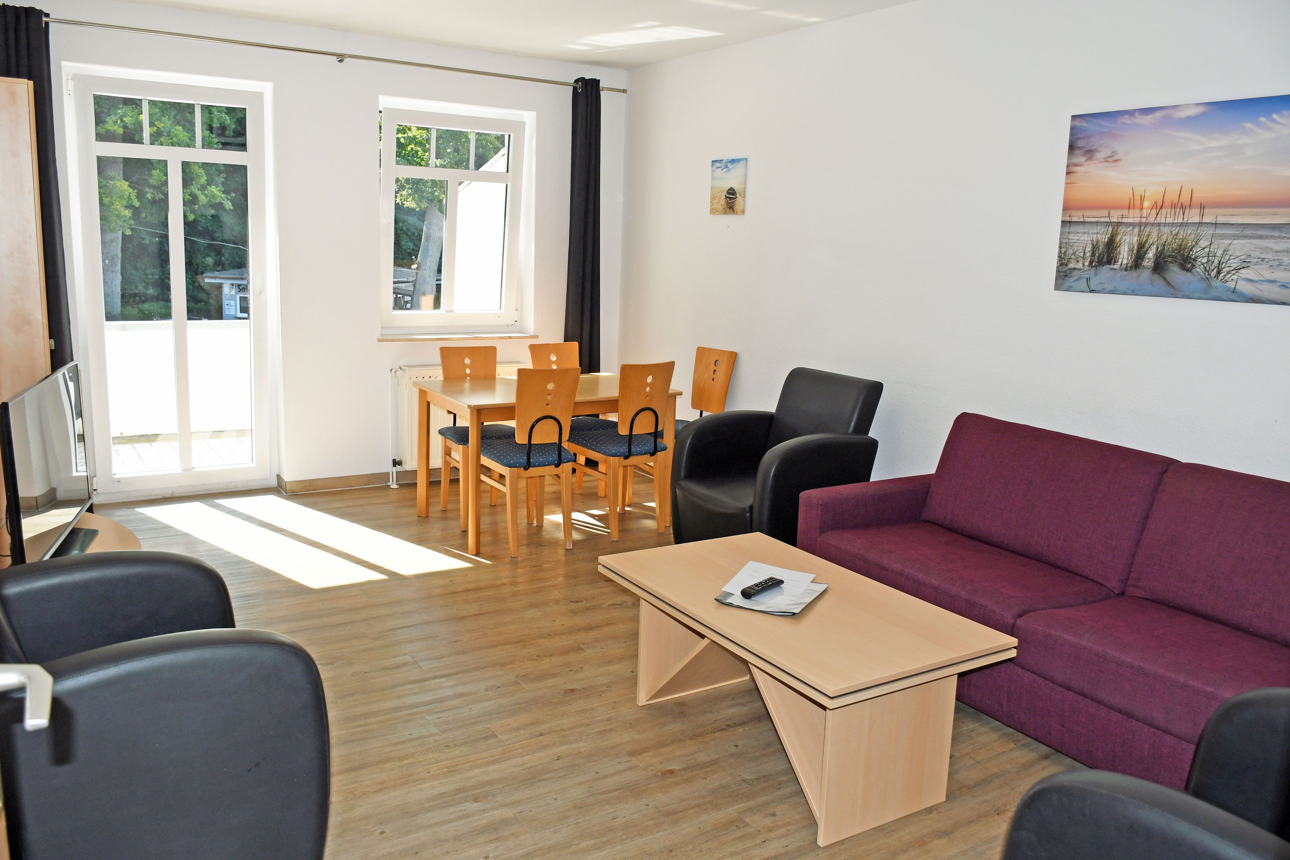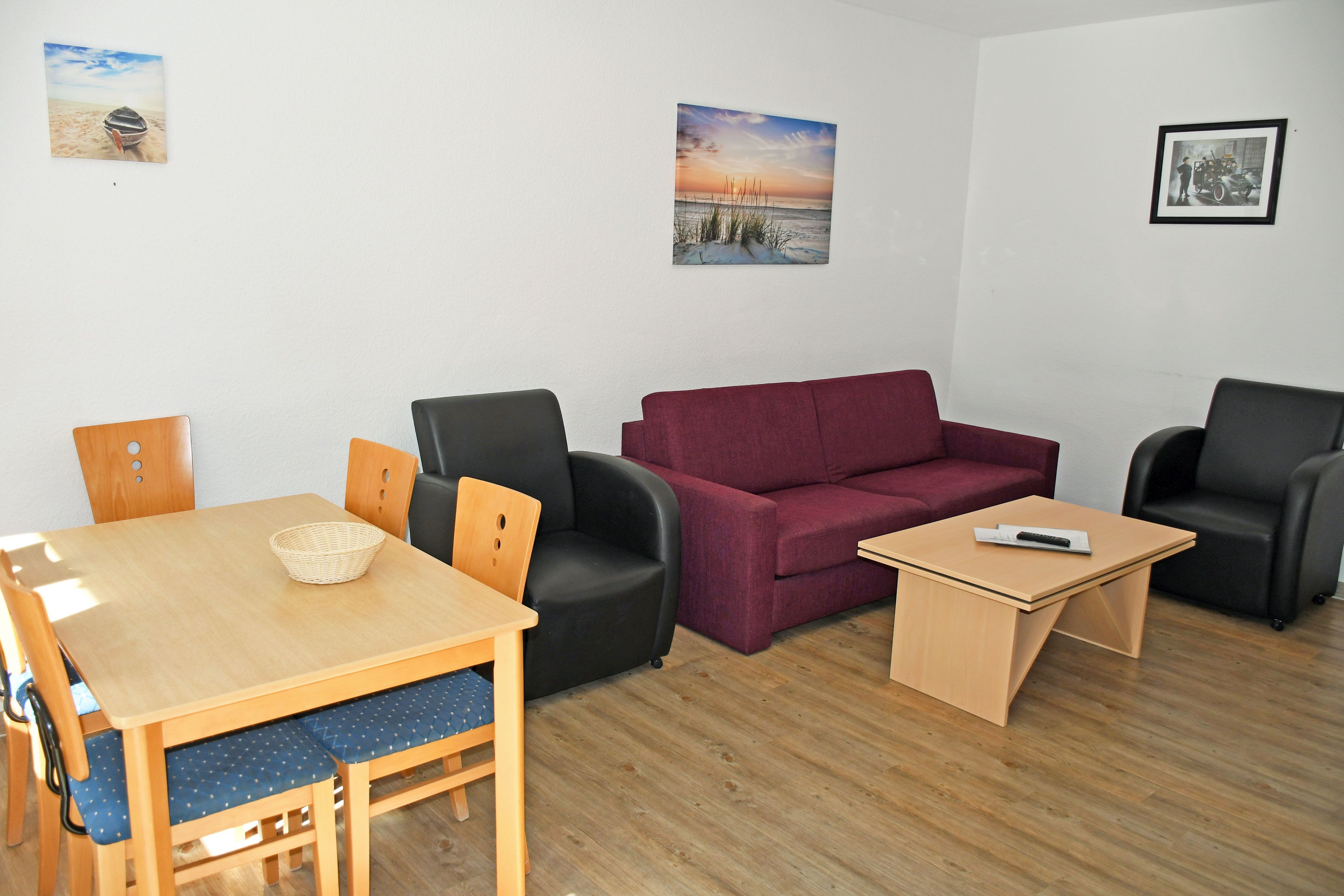 Wohnbereich mit ausziehbarer, moderner Doppelbettschlafcouch (168 x 200 cm), 2 Sesseln, Couchtisch, Anrichte mit Flat-TV (integr. Radiofunktion) und Esstisch mit 6 Stühlen