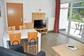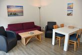 Wohnbereich mit ausziehbarer, moderner Doppelbettschlafcouch (168 x 200 cm), 2 Sesseln, Couchtisch, Anrichte mit Flat-TV (integr. Radiofunktion) und Esstisch mit 4 Stühlen