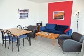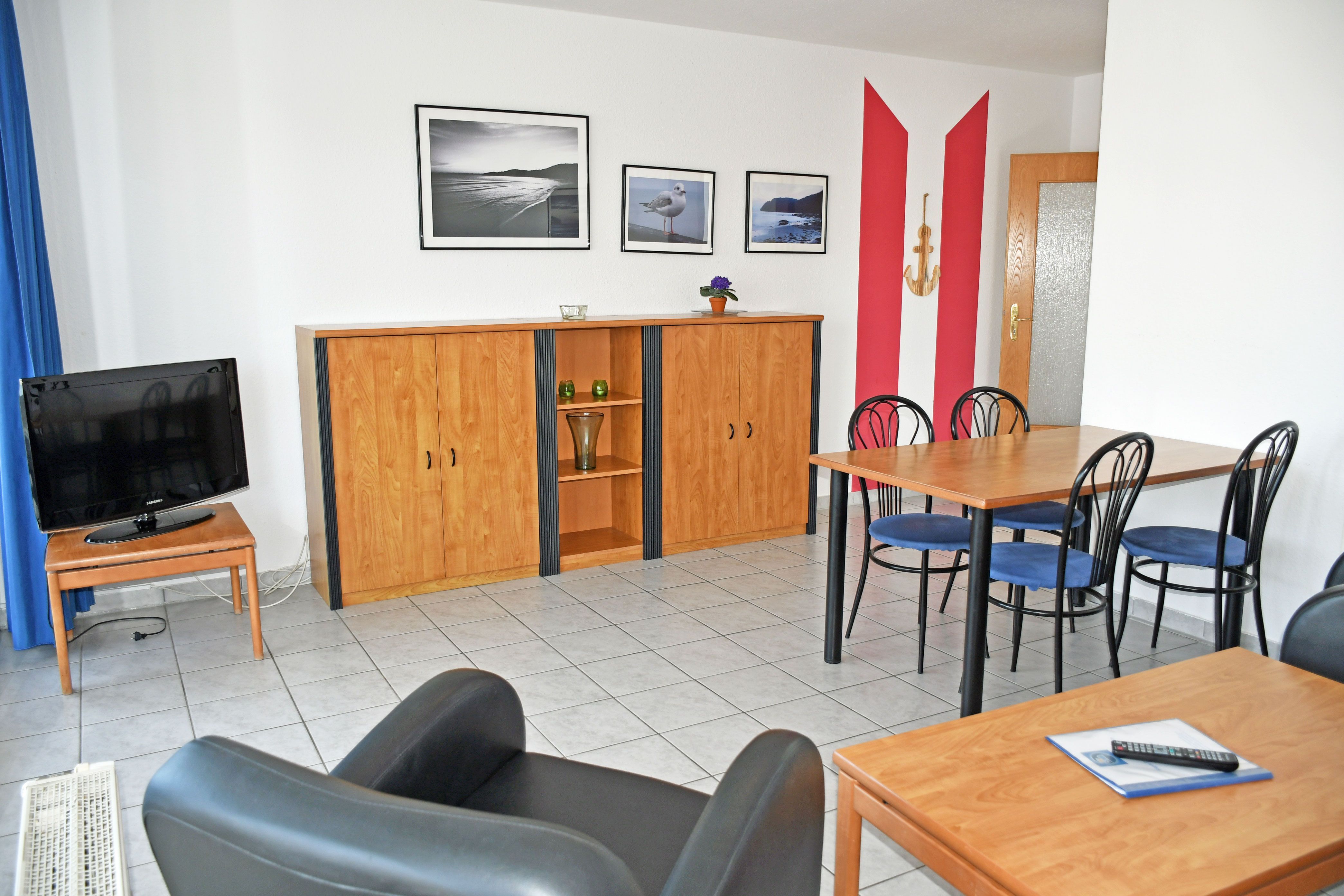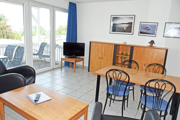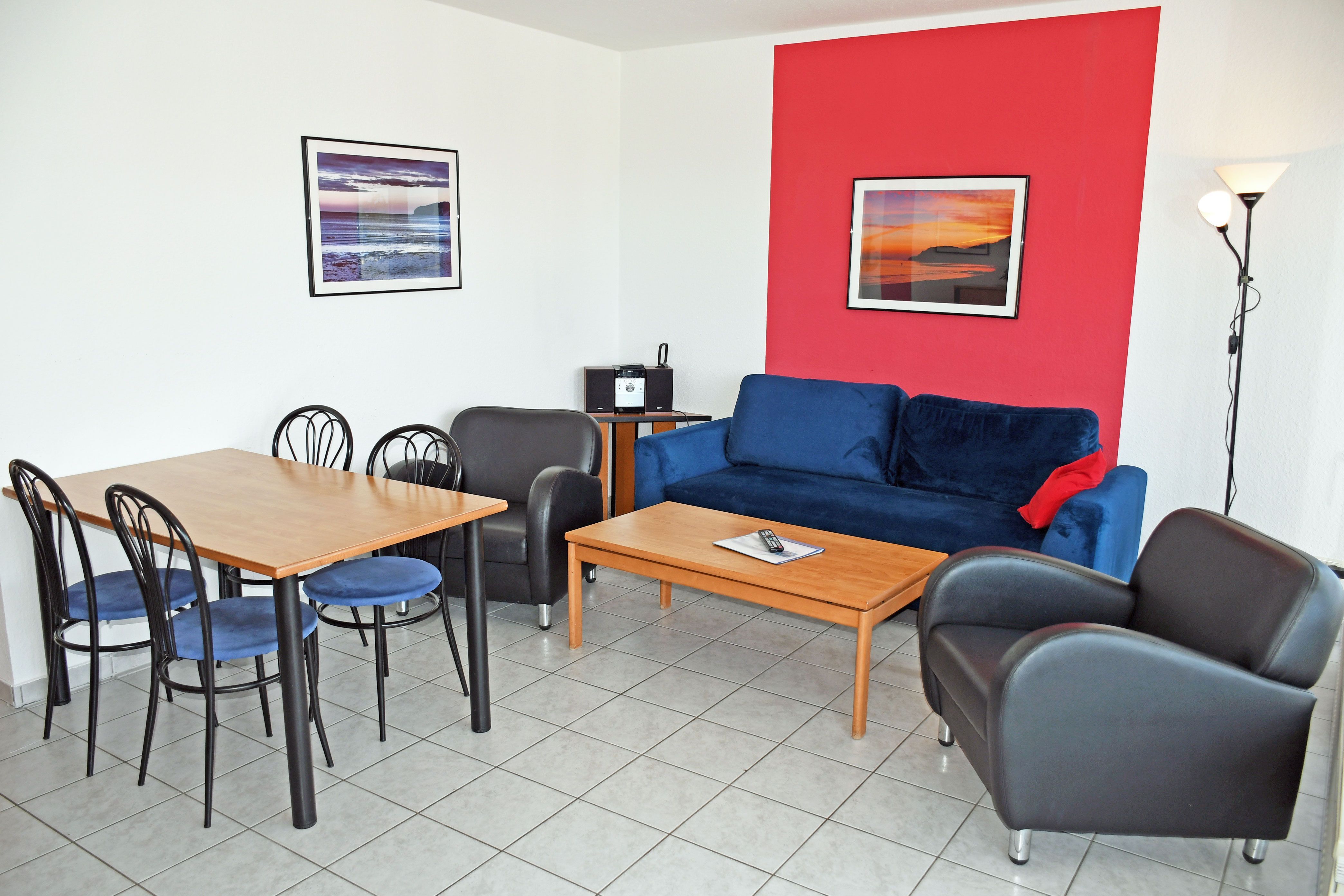 · Wohnbereich mit ausziehbarer, moderner Doppelbettschlafcouch (150 x 200 cm), 2 Sesseln, Couchtisch, Anrichte, Flat-TV, Radio und Esstisch mit 4Stühlen