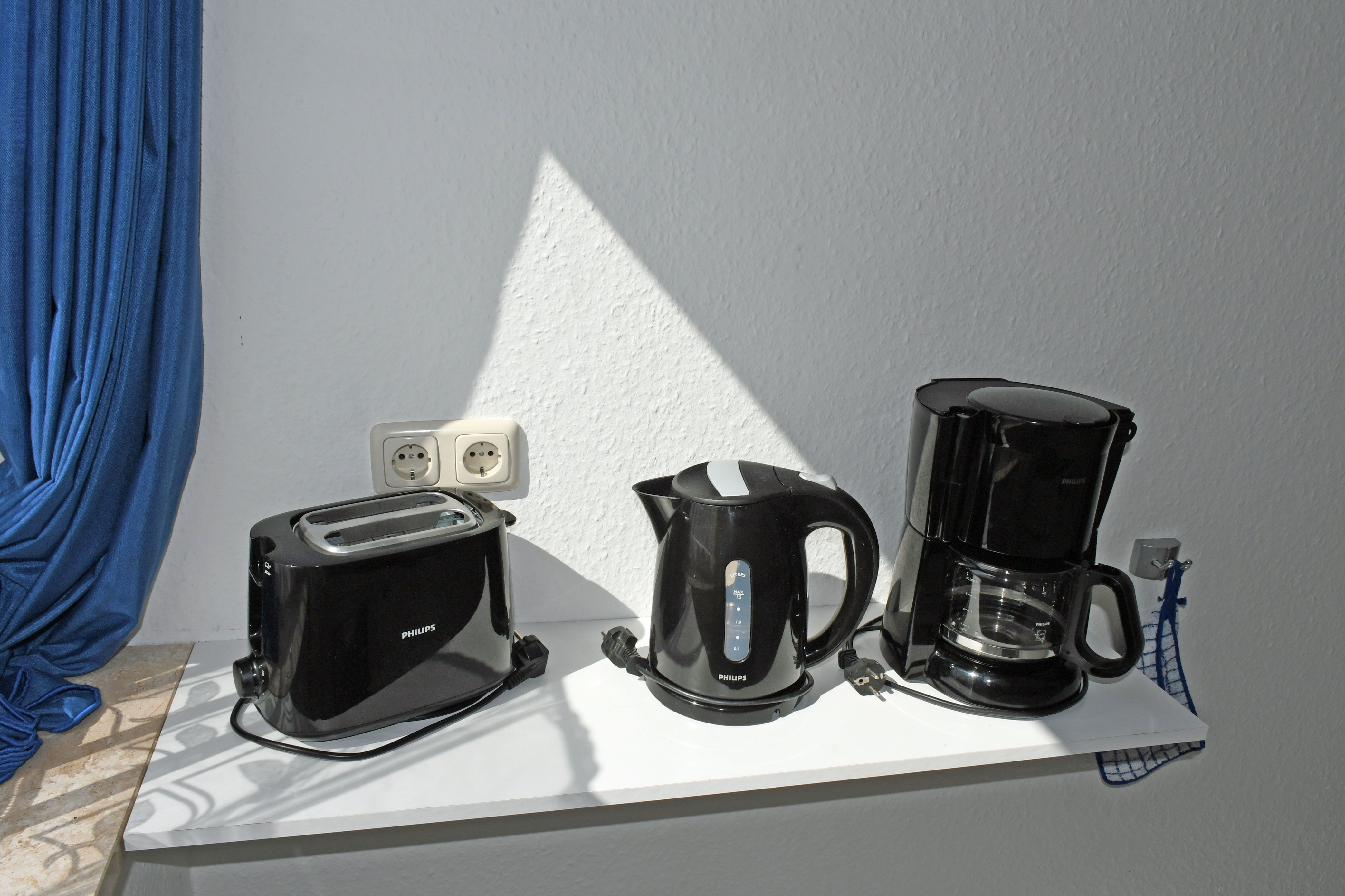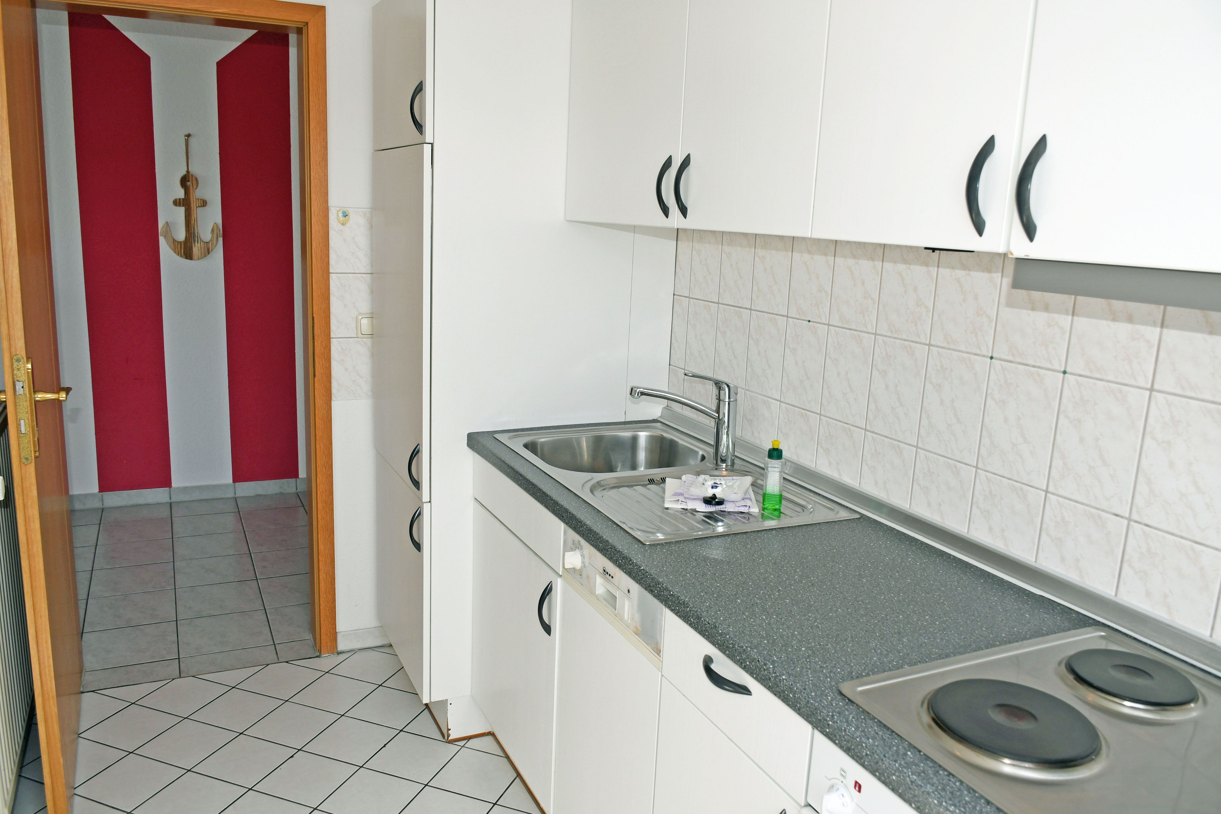 · Einbauküche im Wohnbereich integriert, ausgestattet mit: 4-Platten-Kochfeld, Backofen, Dunstabzugshaube, großer Kühlschrank mit Gefrierfach, Geschirrspüler, Mikrowelle, Toaster, Kaffeemaschine, Wasserkocher und Küchenutensilien