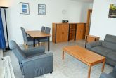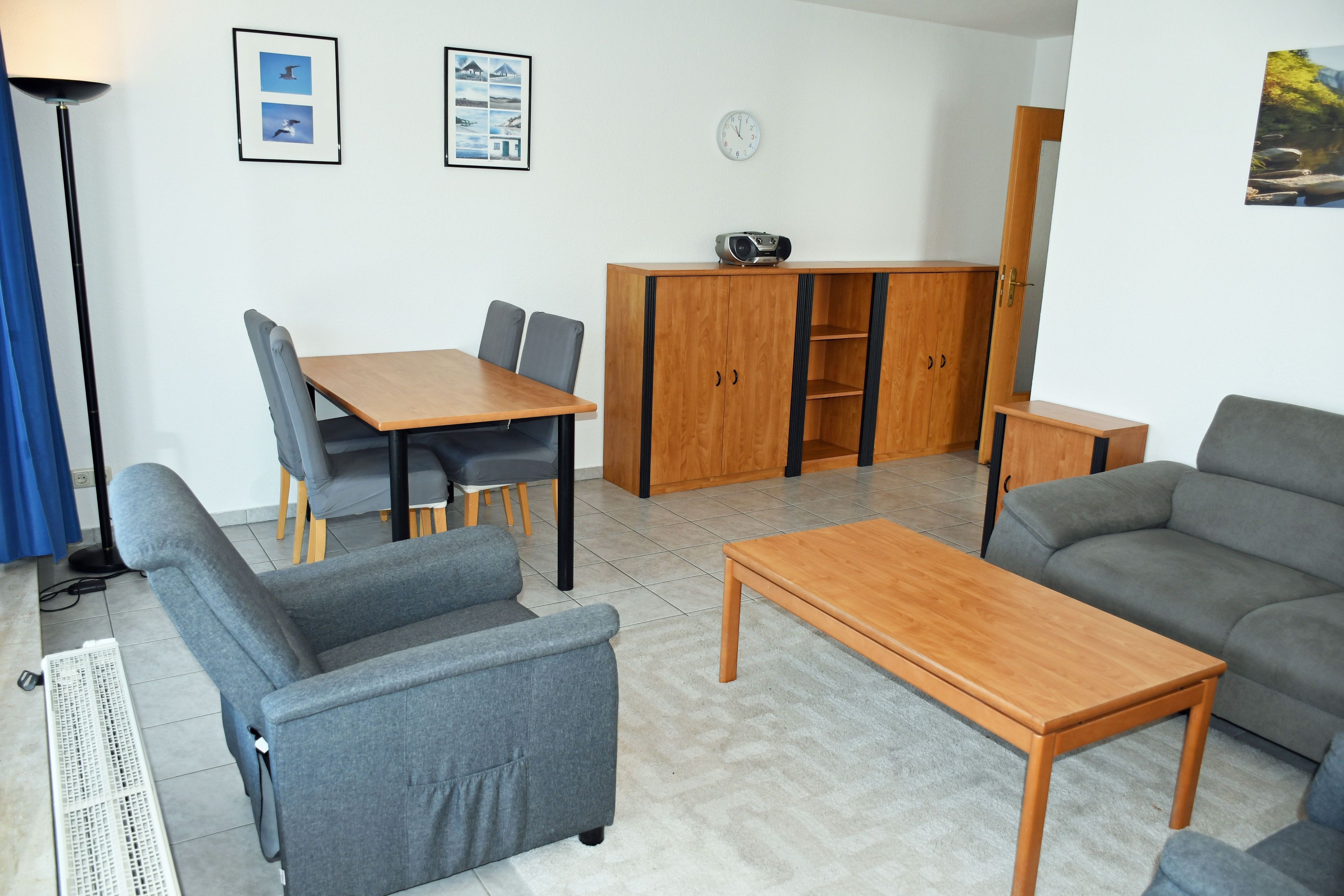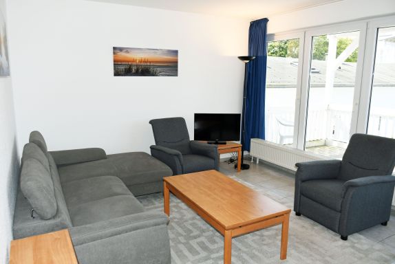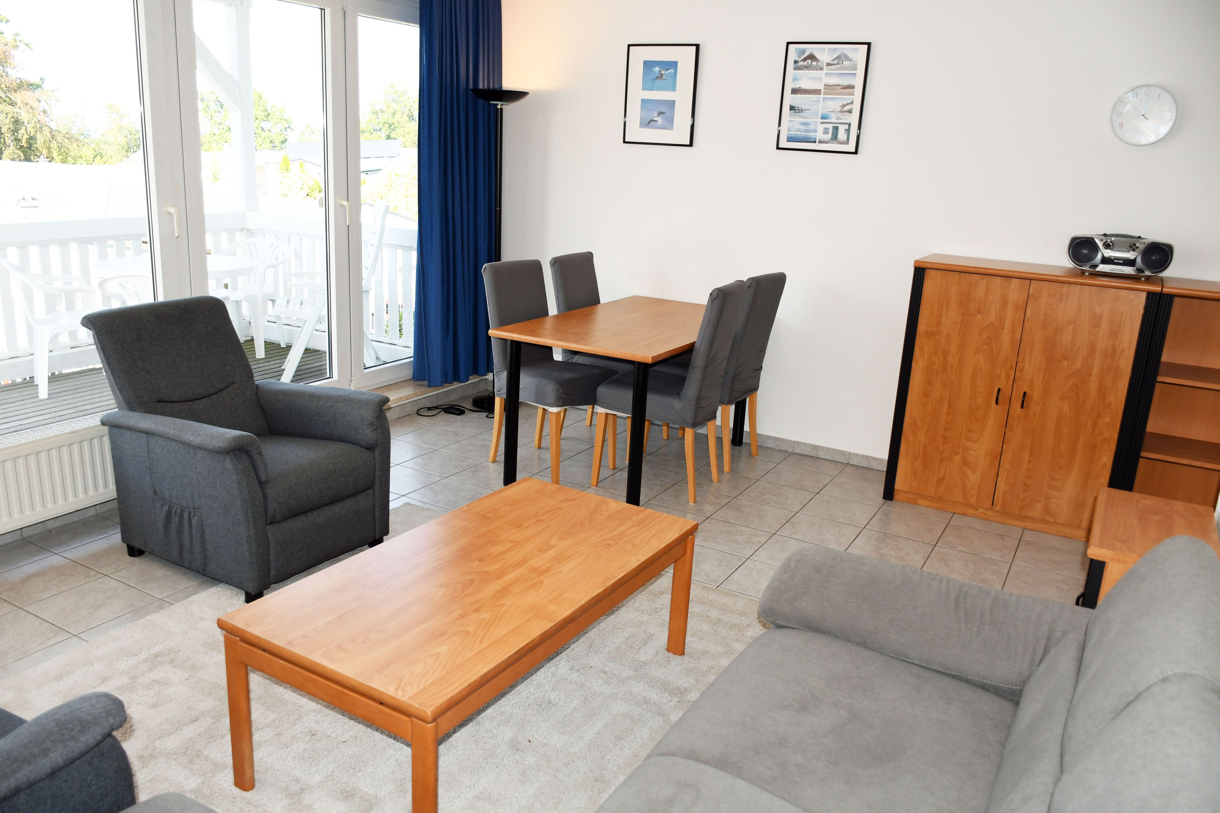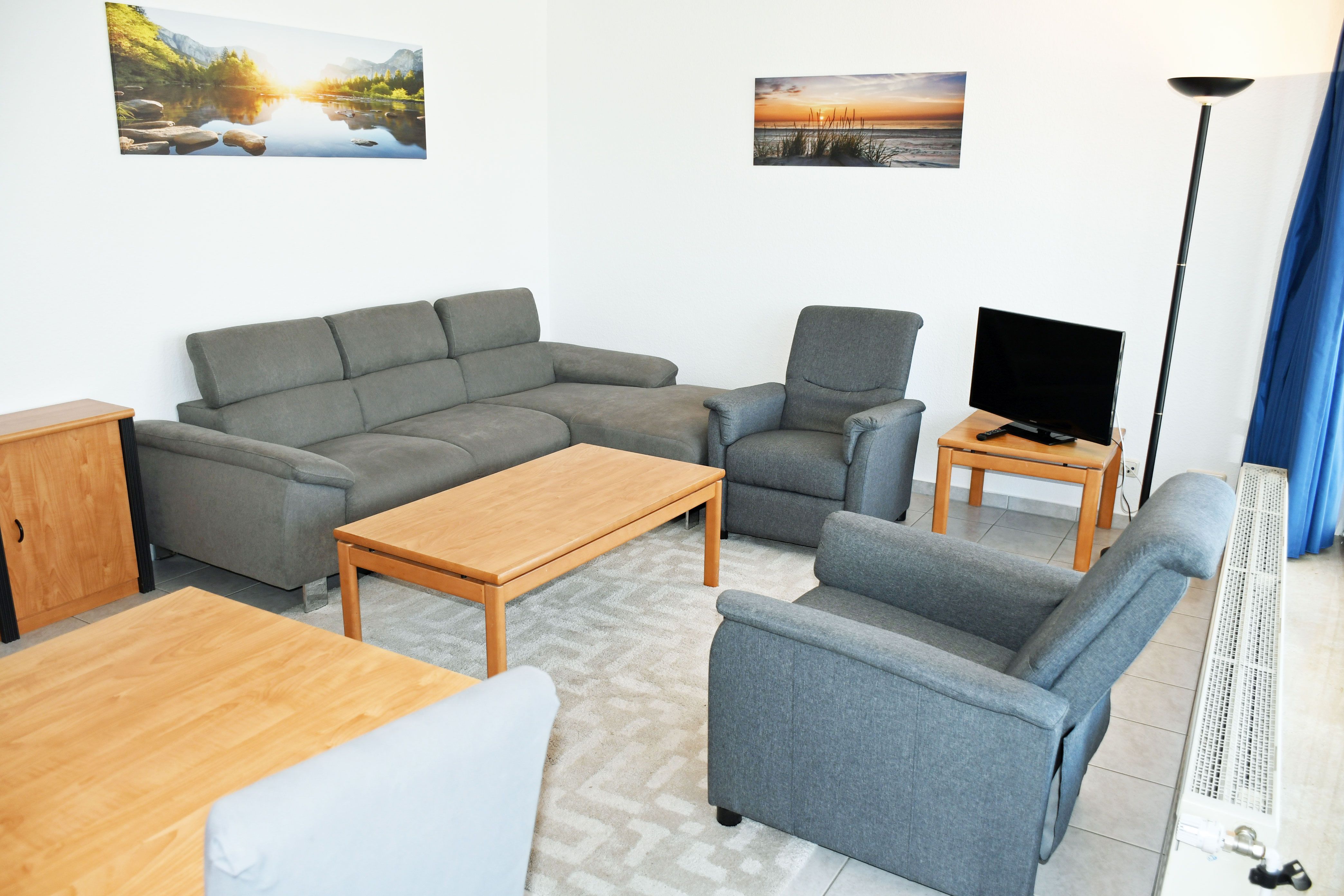 · Wohnbereich mit ausziehbarer, moderner Doppelbettschlafcouch (150 x 200 cm), 2 Sesseln, Couchtisch, Anrichte, Flat-TV, Radio und Esstisch mit 6 Stühlen