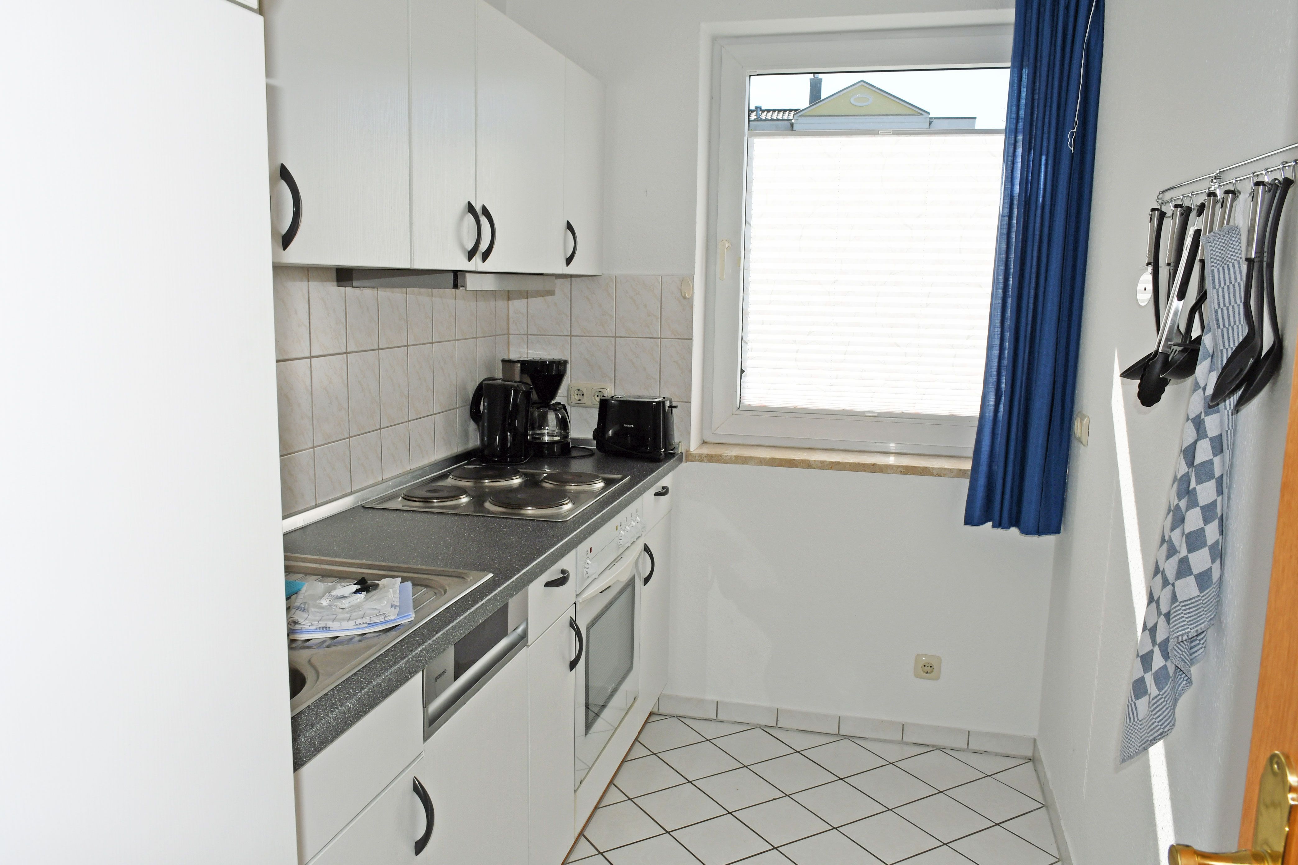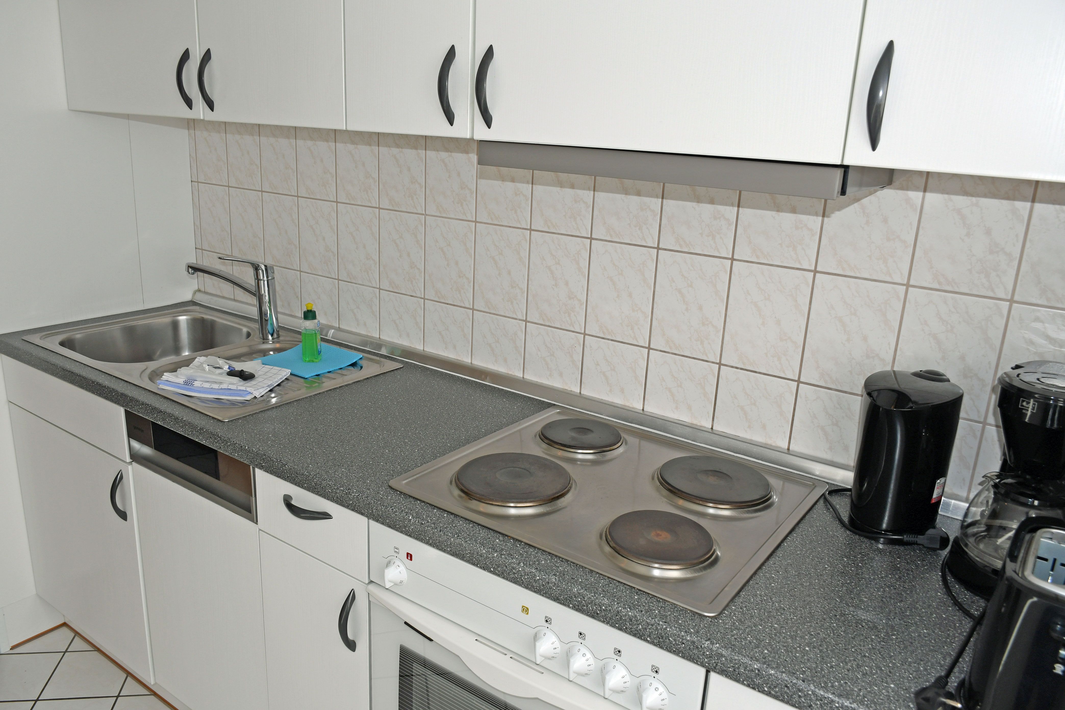 · Einbauküche im Wohnbereich integriert, ausgestattet mit: 4-Platten-Kochfeld, Backofen, Dunstabzugshaube, großer Kühlschrank mit Gefrierfach, Geschirrspüler, Toaster, Kaffeemaschine, Wasserkocher und Küchenutensilien