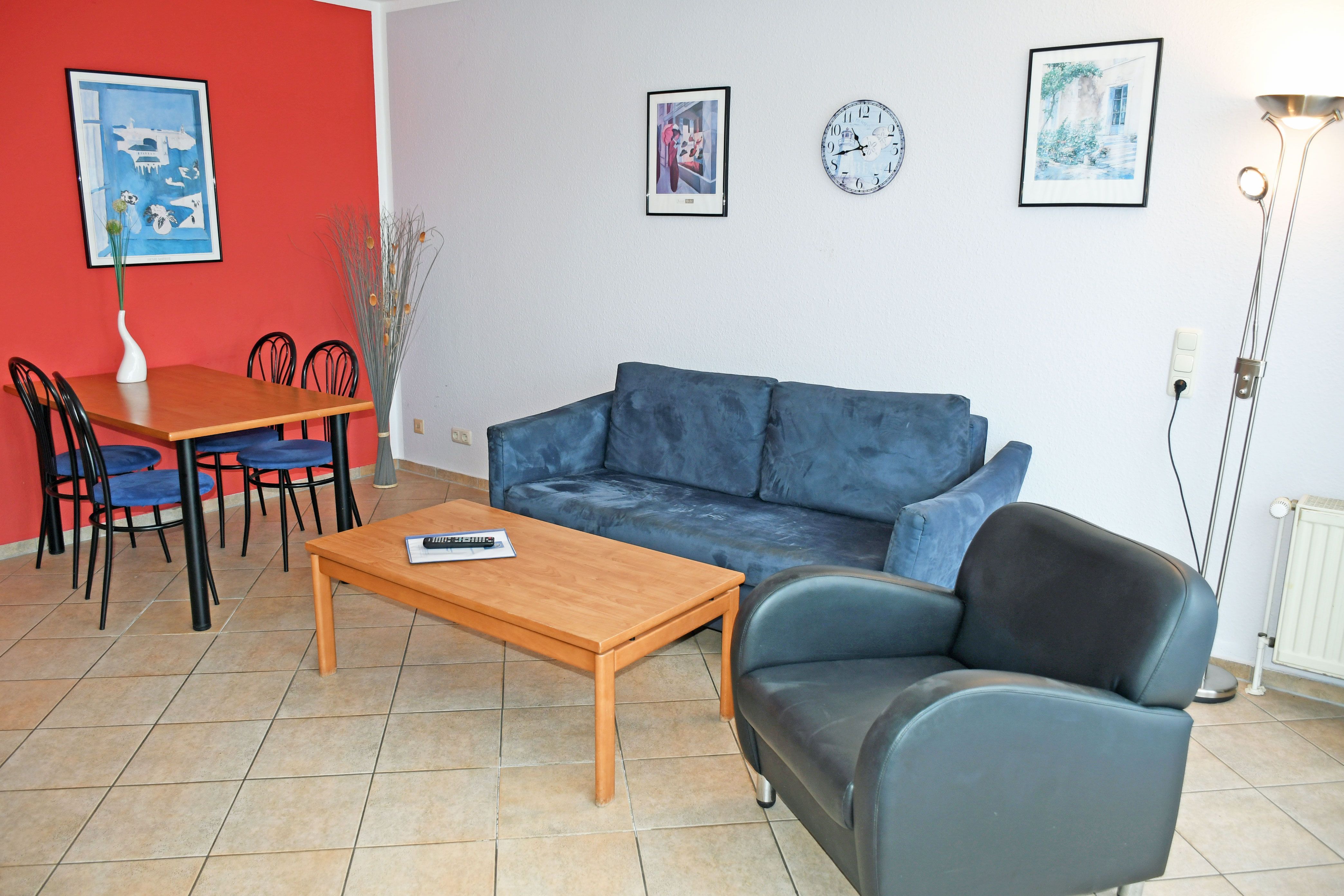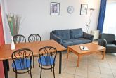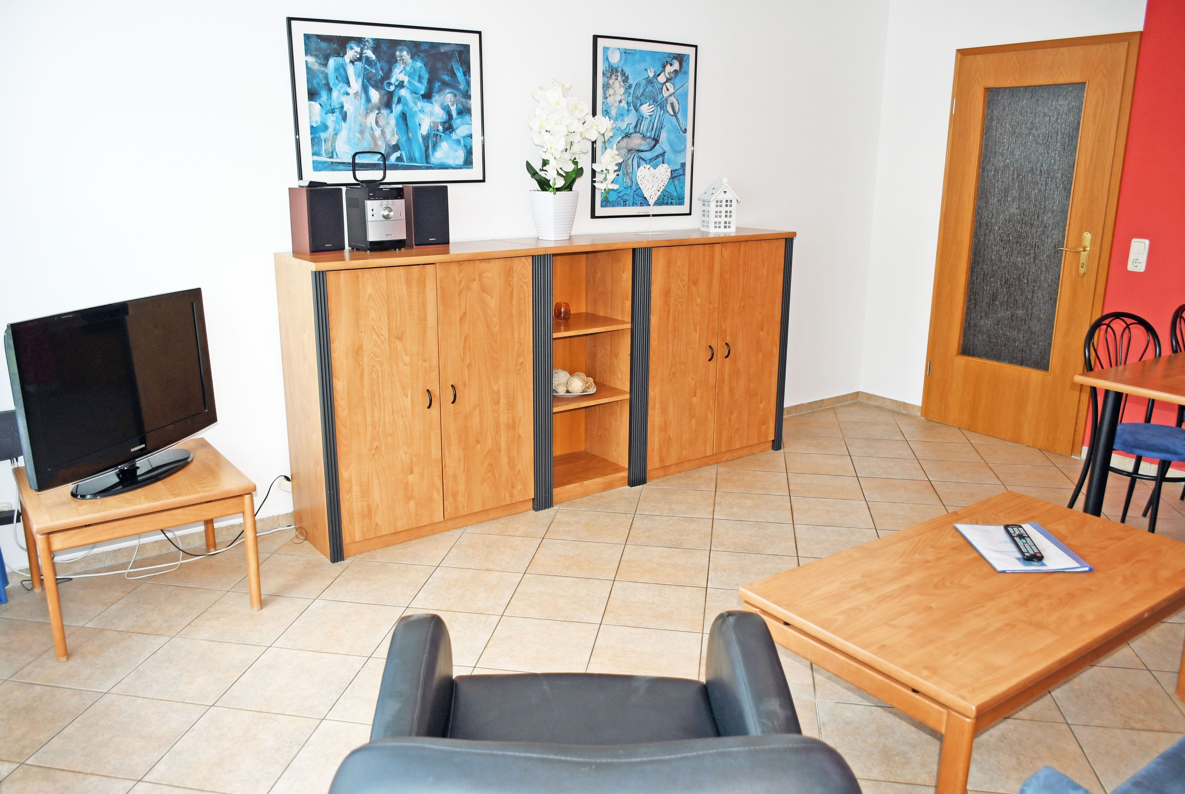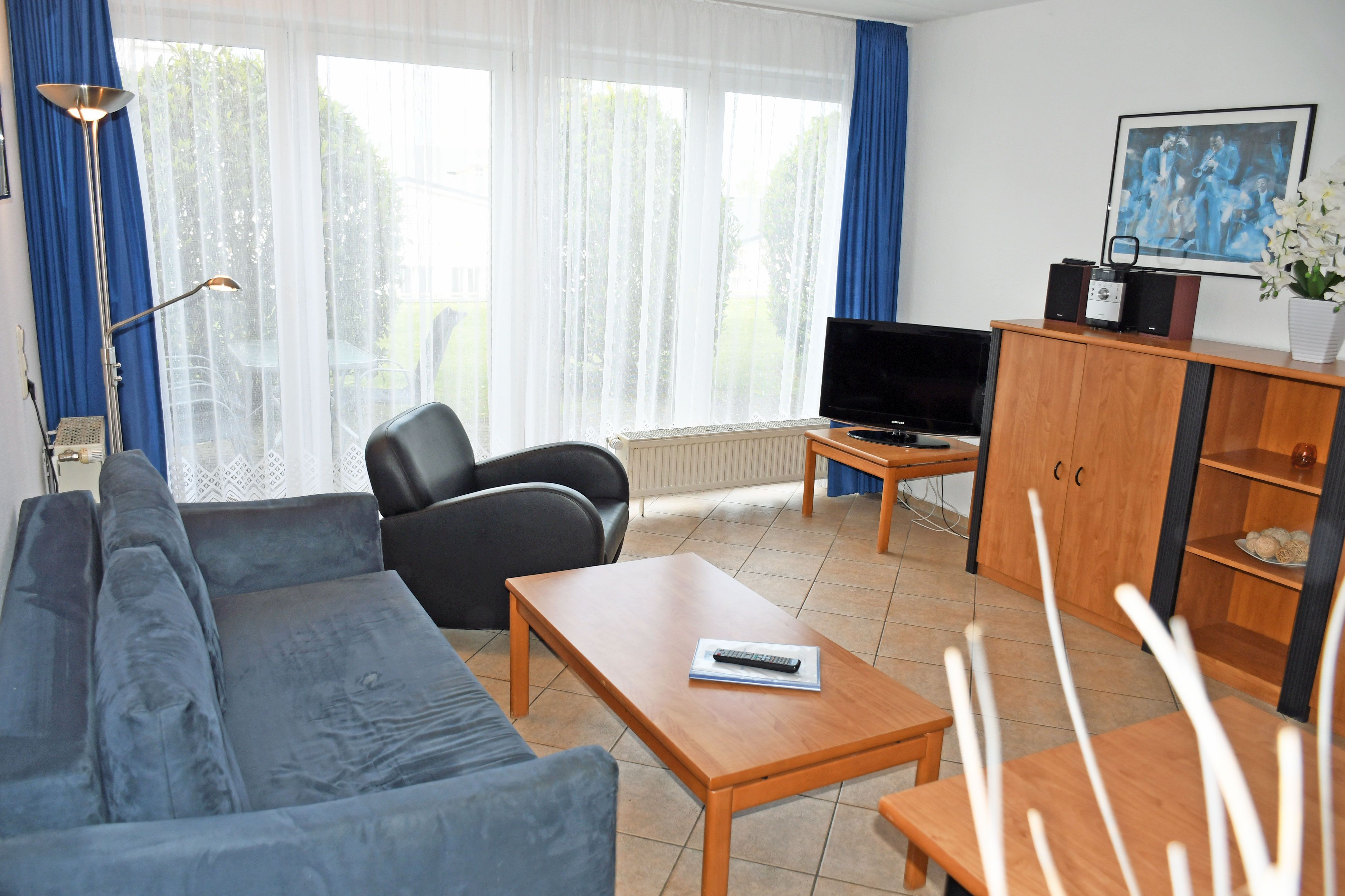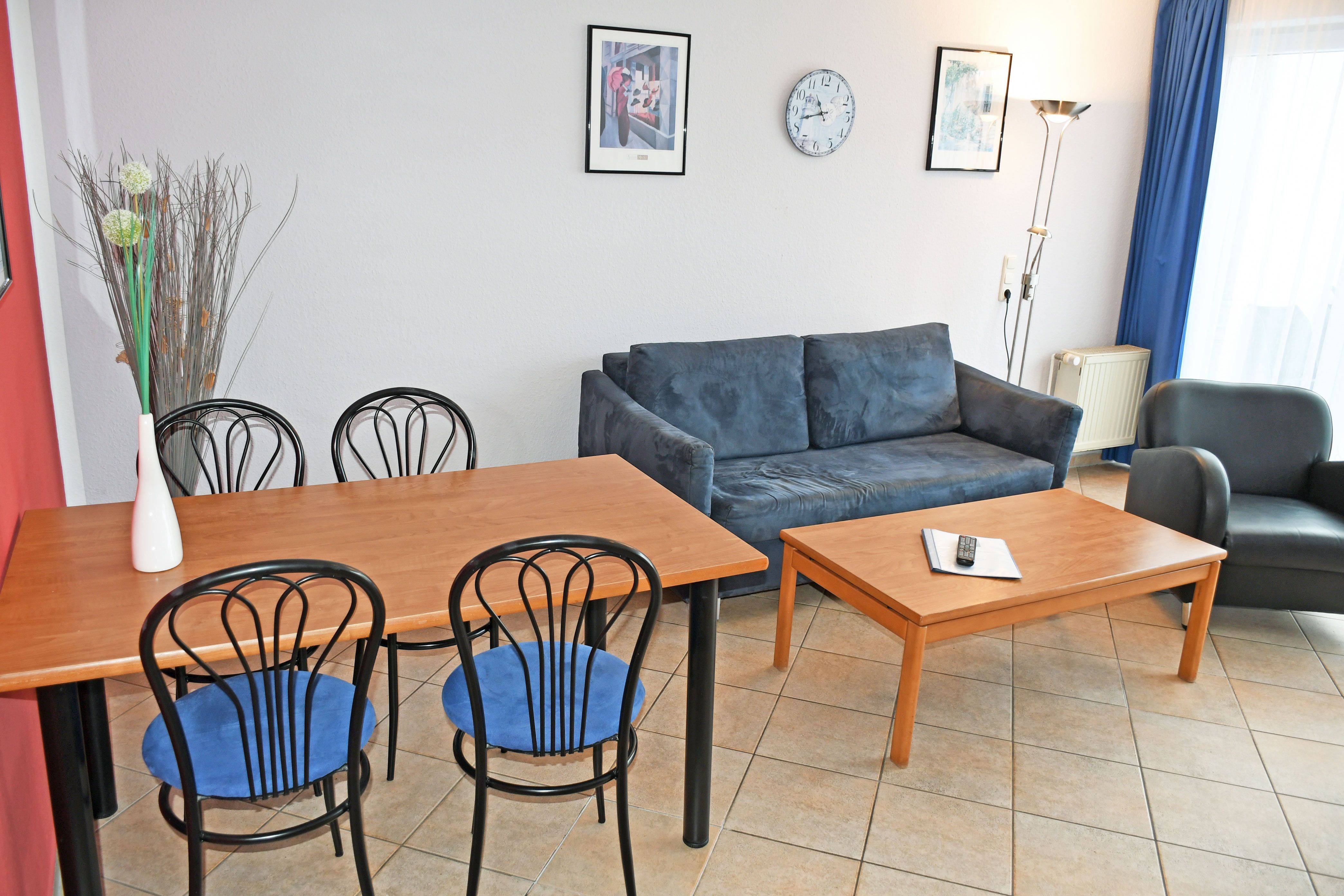 * Wohnbereich mit ausziehbarer, moderner Doppelbettschlafcouch (150 x 200 cm), 2 Sesseln, Couchtisch, Anrichte, Flat-TV, CD-Radio-Anlage und Esstisch mit 4 Stühlen