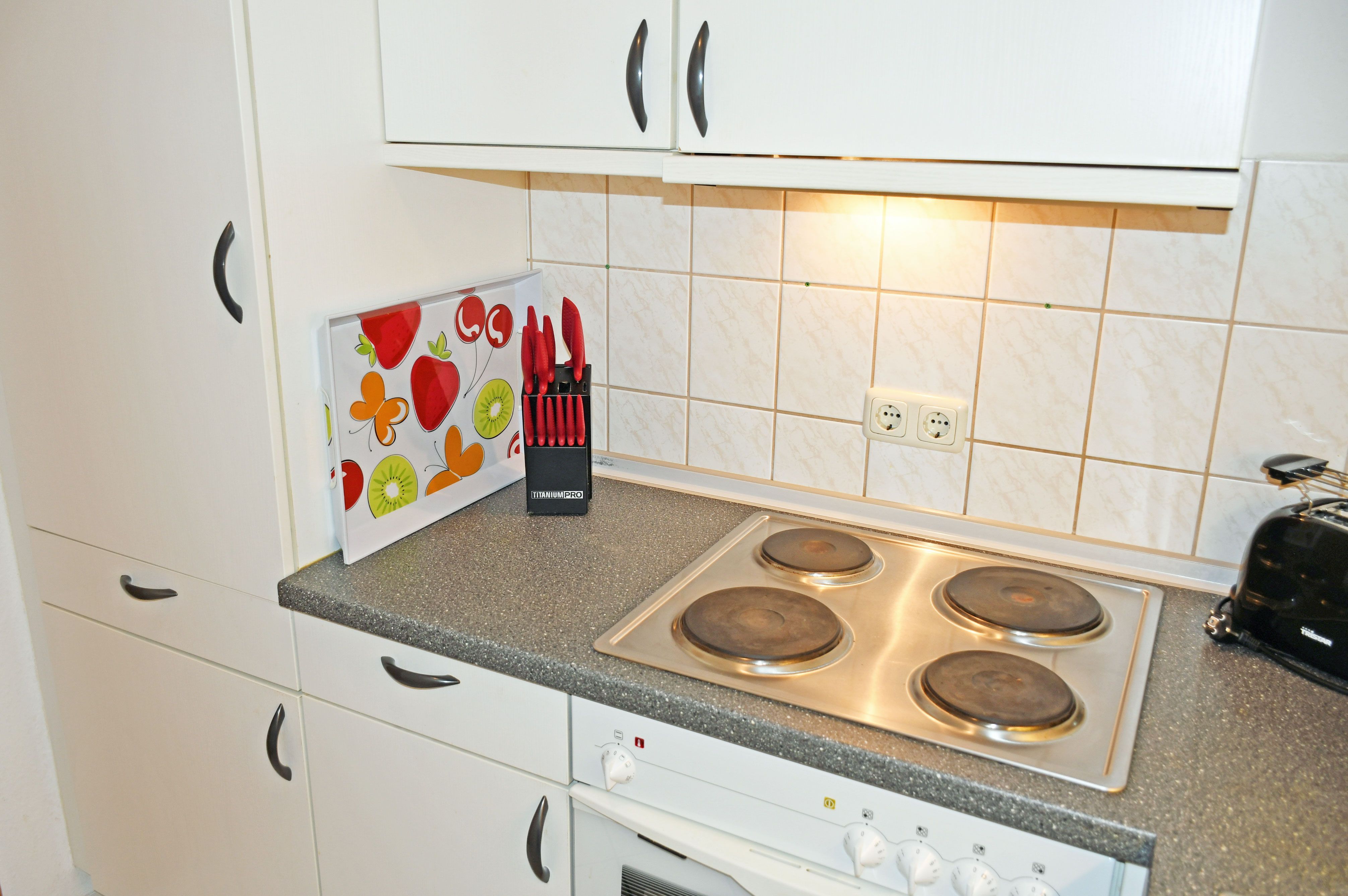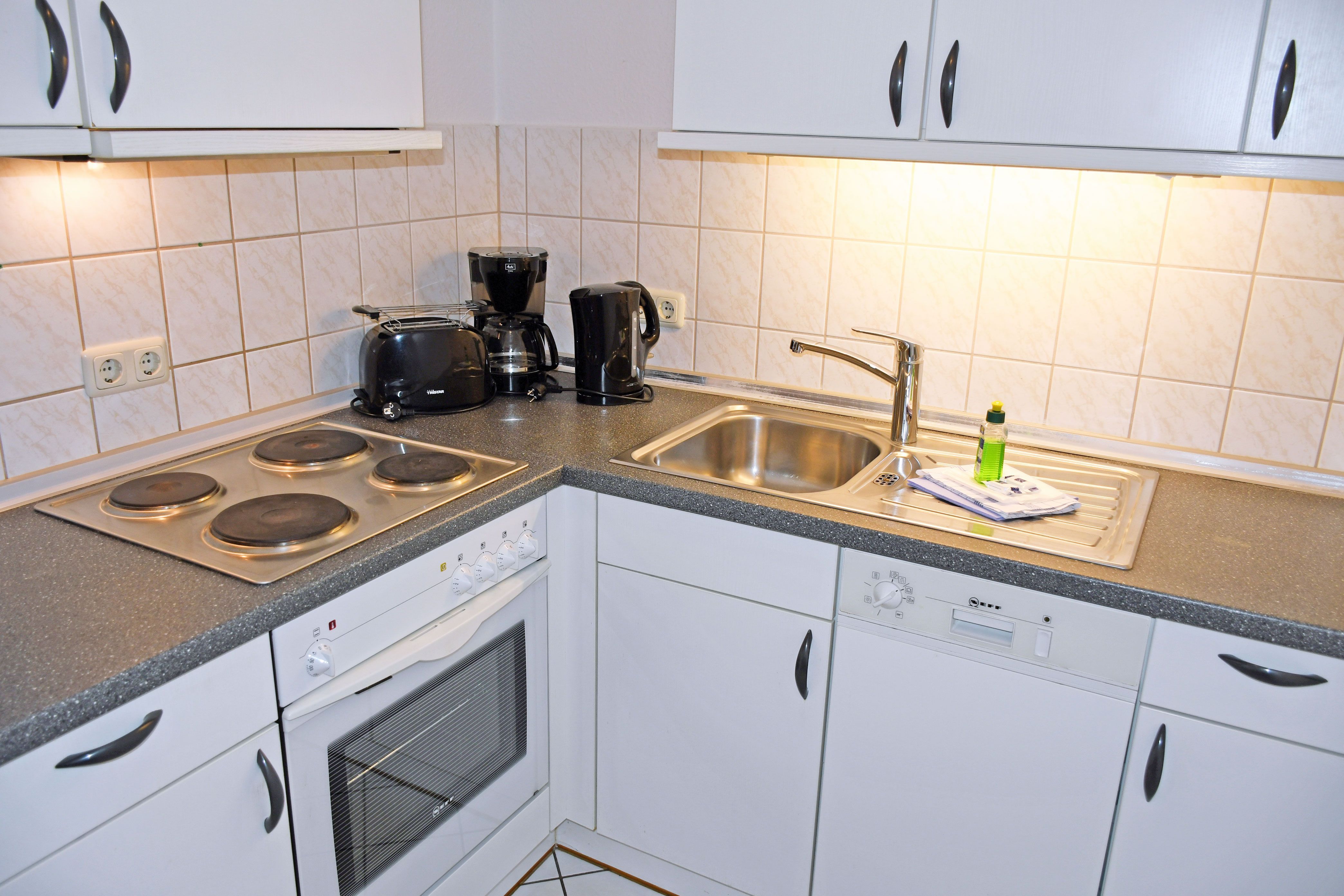 * separate Küche, ausgestattet mit: 4-Platten-Kochfeld, Backofen, Dunstabzugshaube, großer Kühlschrank mit Gefrierfach, Geschirrspüler, Toaster, Kaffeemaschine, Wasserkocher und Küchenutensilien