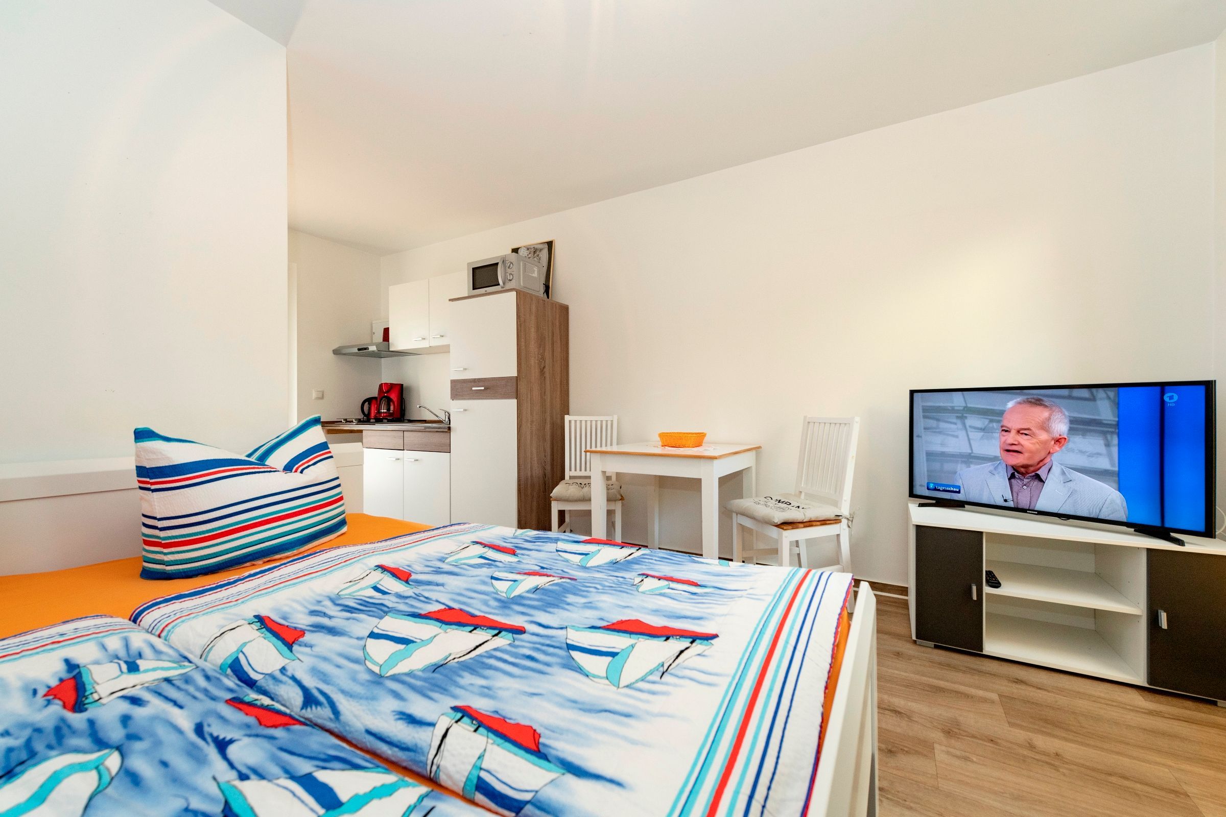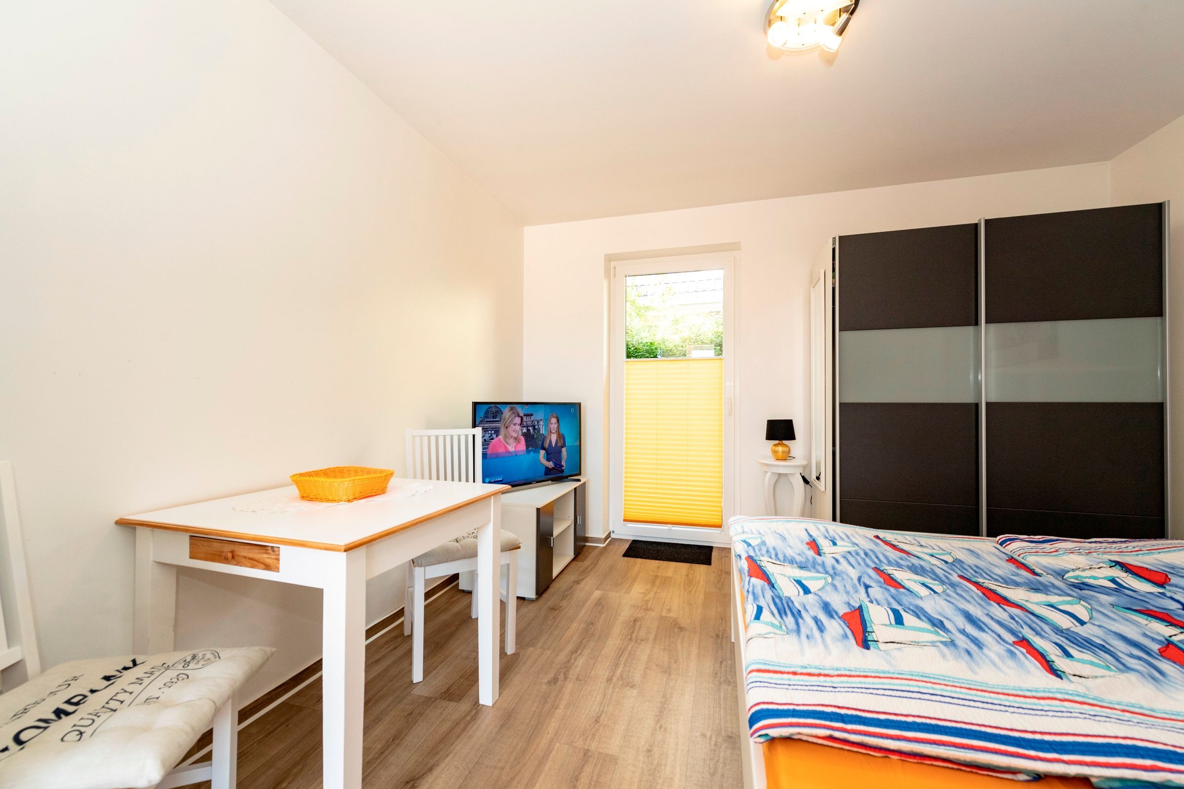 Unsere ruhig gelegenen, hellen und lichtdurchfluteten 1-Raum-Ferienwohnungen mit Terrasse sind wie folgt ausgestattet: