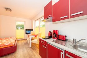 * kombinierter Wohn-/Schlafraum mit kleiner, integrierter Küchenzeile ausgestattet mit: 2-Platten-Ceran-Kochfeld, Dunstabzugshaube, kleiner Kühlschrank mit Gefrierfach, Spüle, Toaster, Kaffeemaschine, Wasserkocher, diverse Küchenutensilien