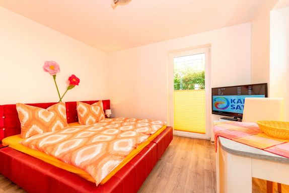 Unsere ruhig gelegenen, hellen und lichtdurchfluteten 1-Raum-Ferienwohnungen mit Terrasse sind wie folgt ausgestattet: