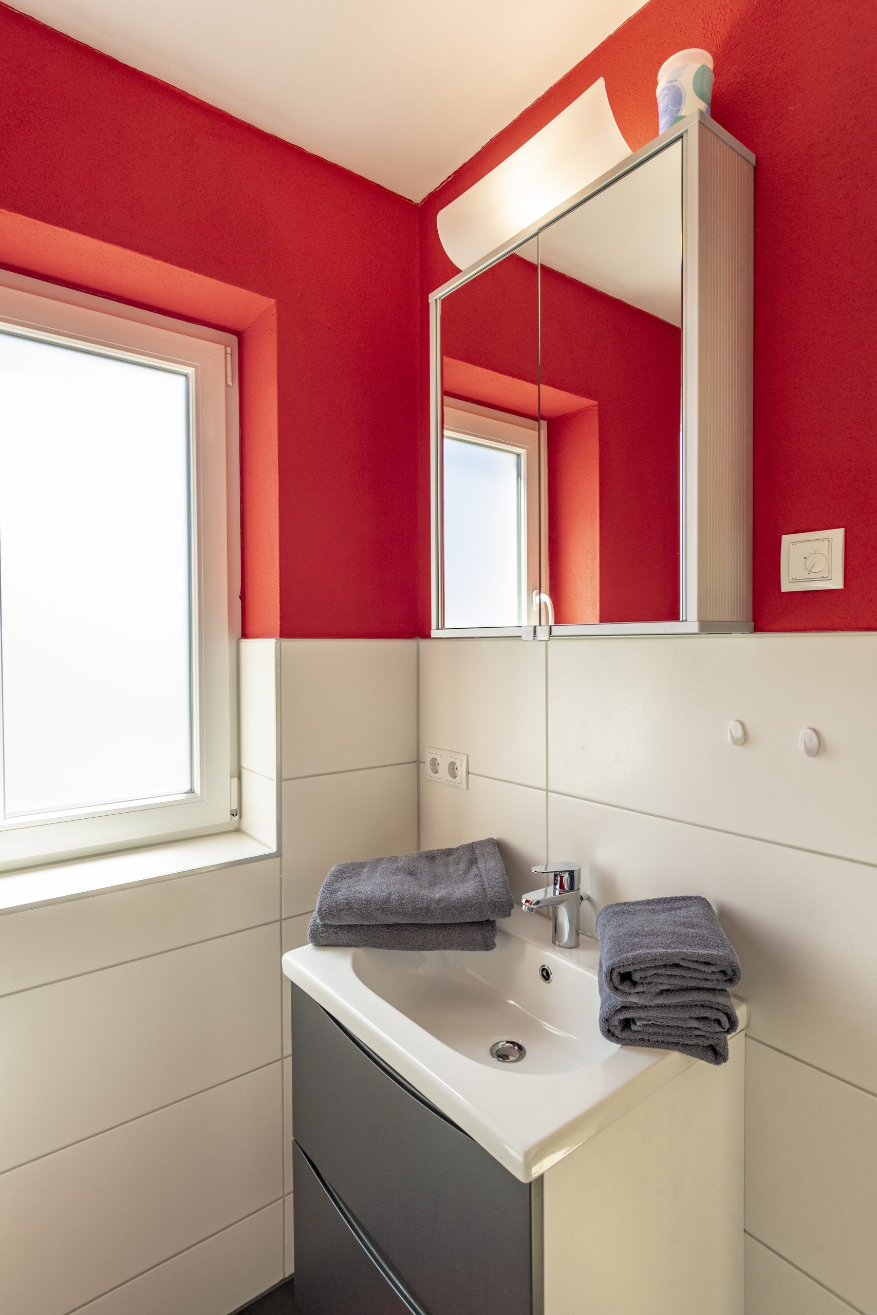 * Bad mit Dusche, WC, 1 Waschtisch mit Spiegel (mit Fenster)