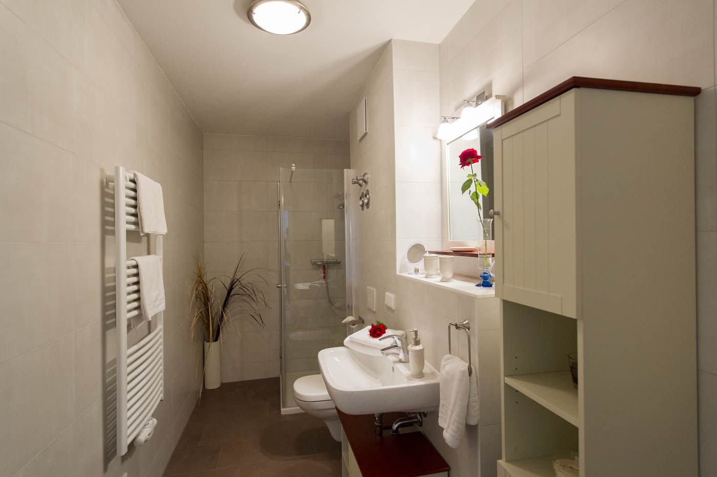 * Bad mit großer ebenerdiger Dusche, WC und Föhn
