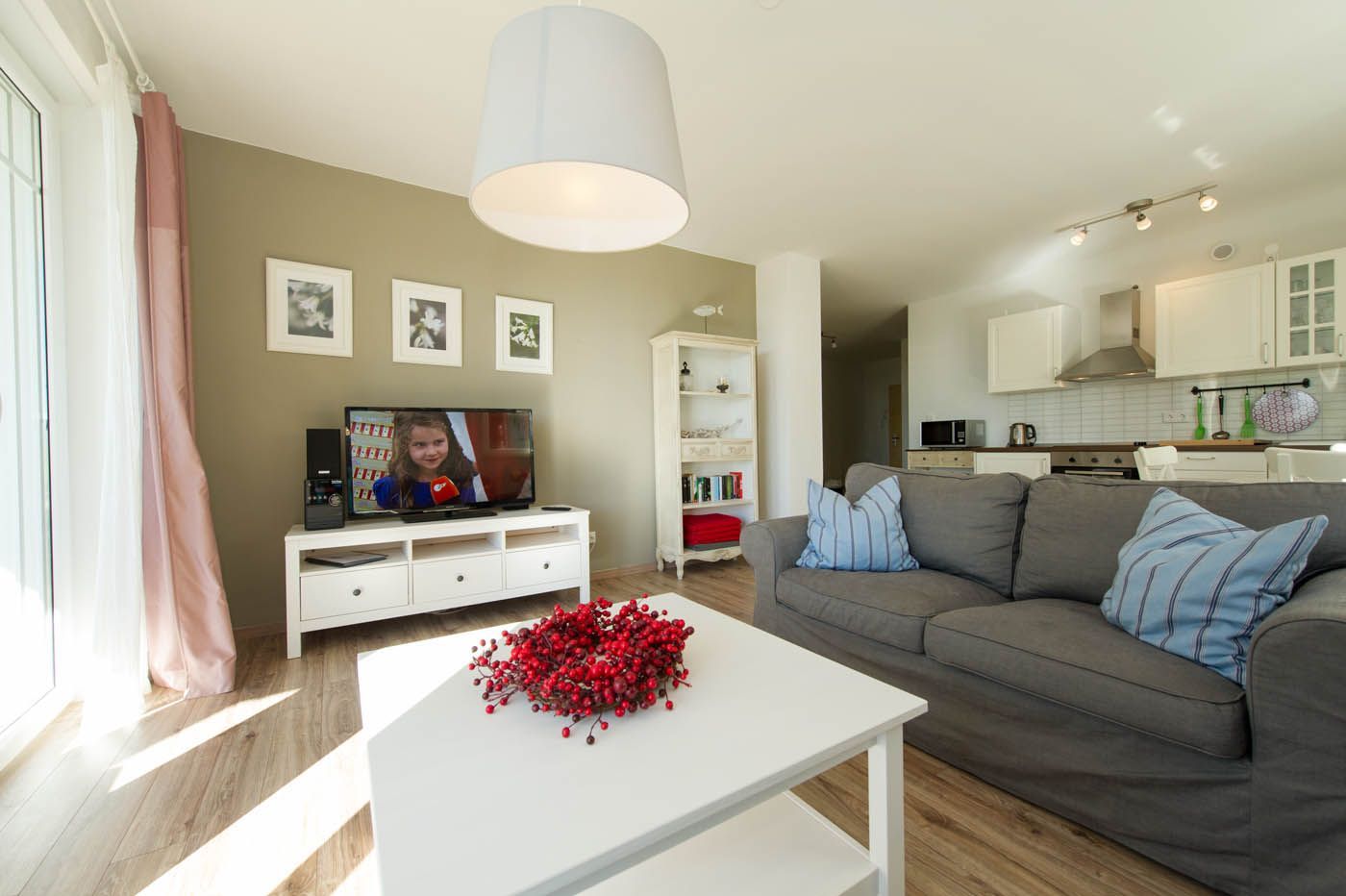 Unsere hellen und modern eingerichteten 3-Raum-Ferienwohnungen liegen im Erdgeschoss und sind wie folgt ausgestattet: