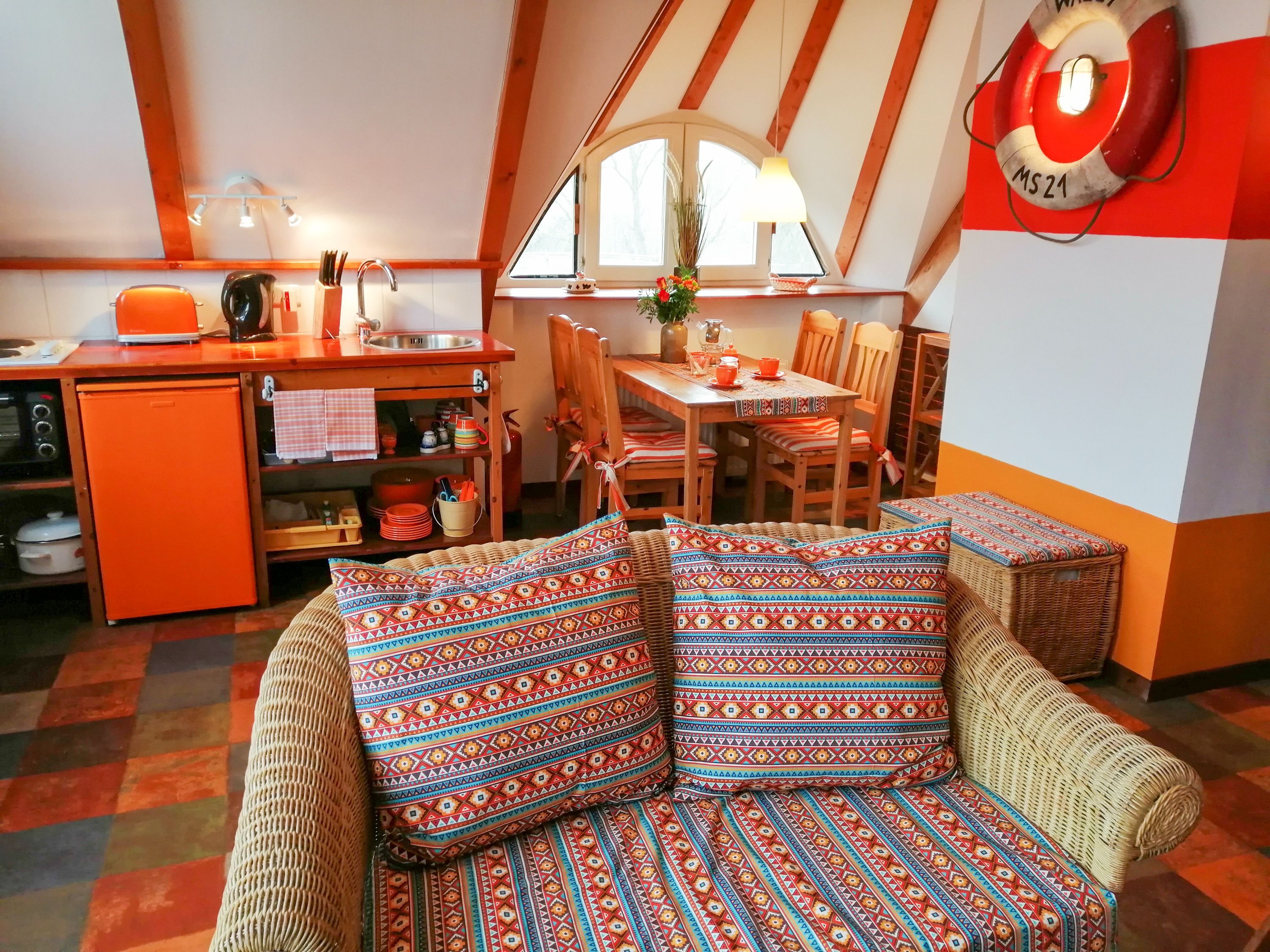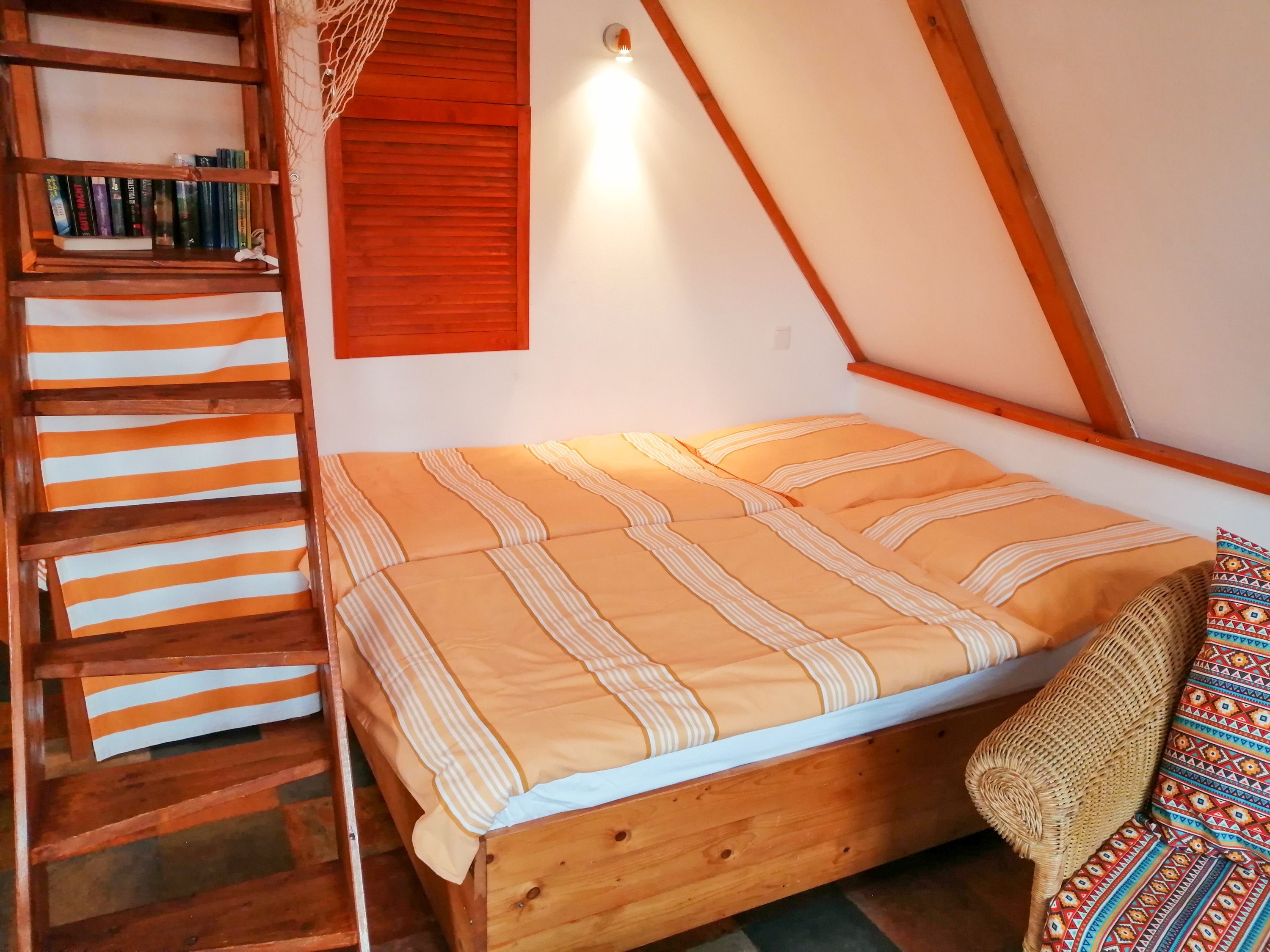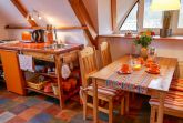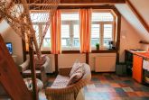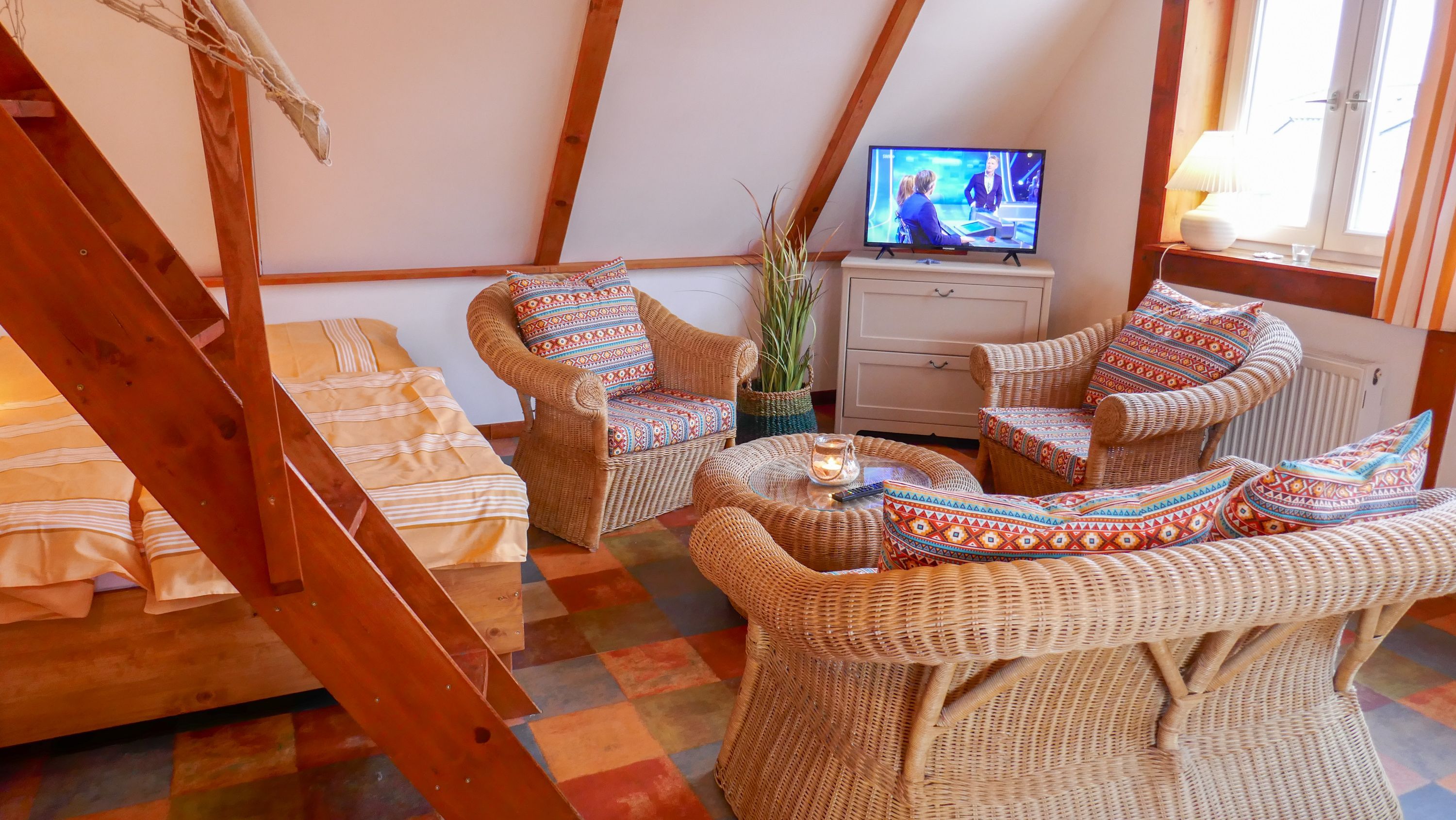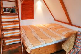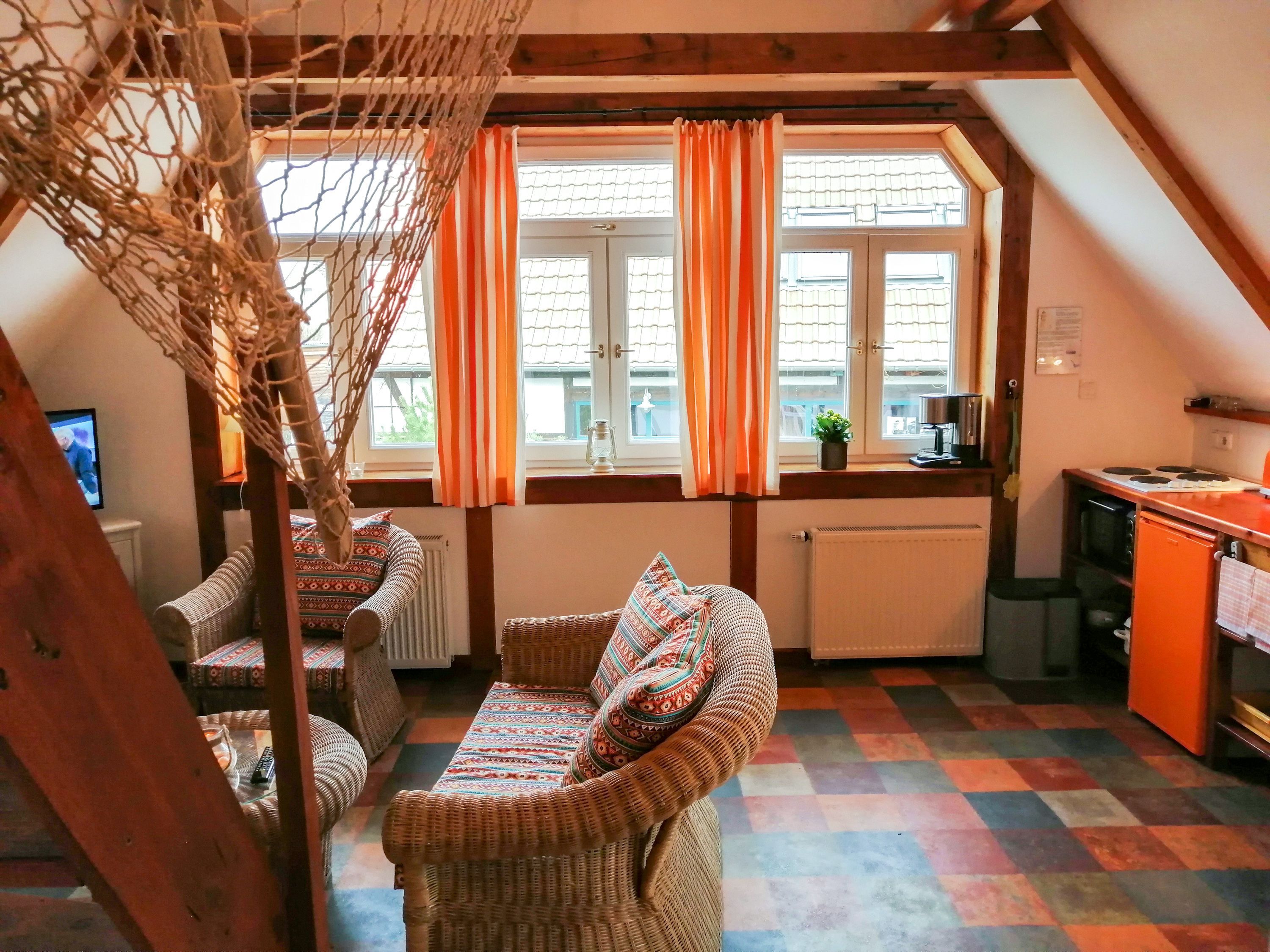 Die Ferienwohnung Paloma befindet sich im Obergeschoss des Reetdachhauses und ist ideal für 2 Personen geeignet. Ihr offener und luftiger Charakter begrüßt sie direkt mit Urlaubsfeeling. Im geräumigen Wohnzimmer finden sie eine Küchenzeile mit Kochfeld und Kühlschrank, einen Esstisch und einen gemütlichen Sitzbereich vor dem TV. Das Doppelbett (180x200) befindet sich leicht separiert neben der Raumspartreppe. Das Tageslicht-Bad ist mit einer Dusche und WC ausgestattet.