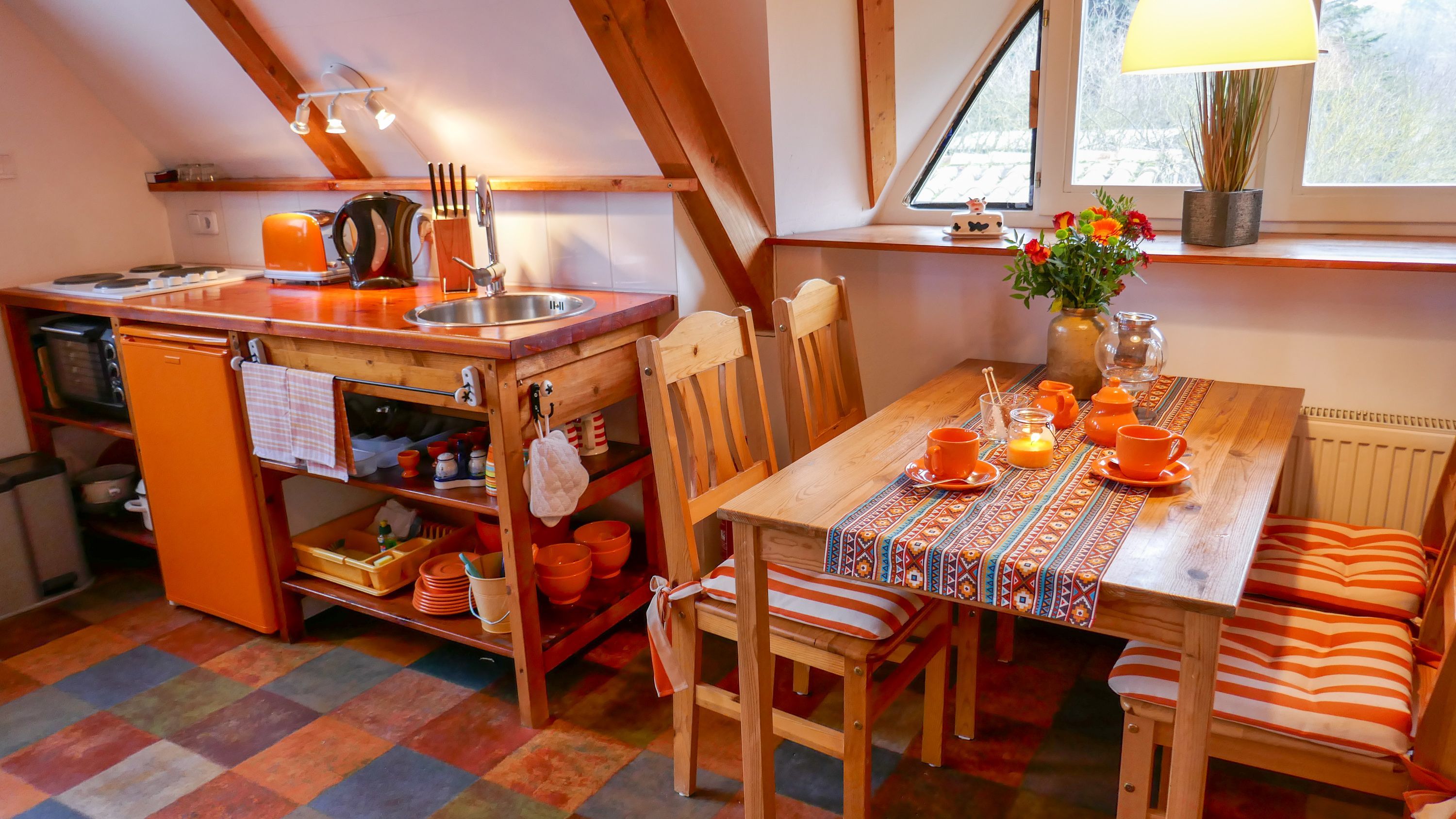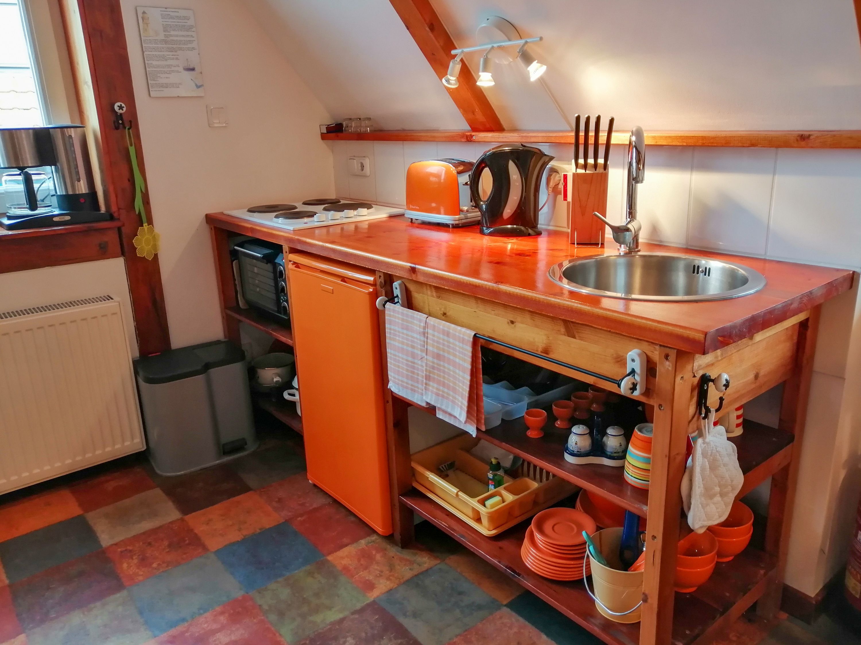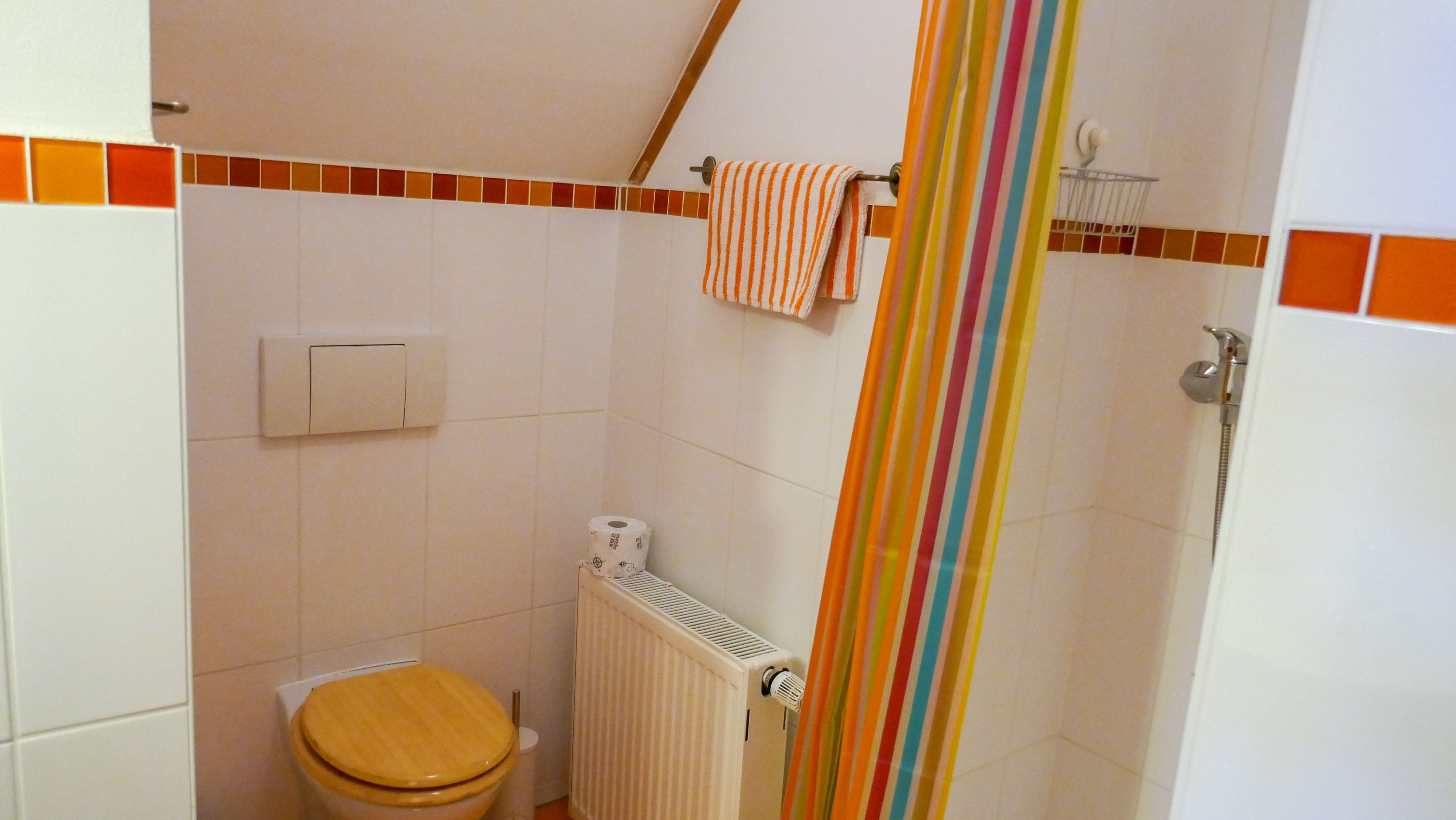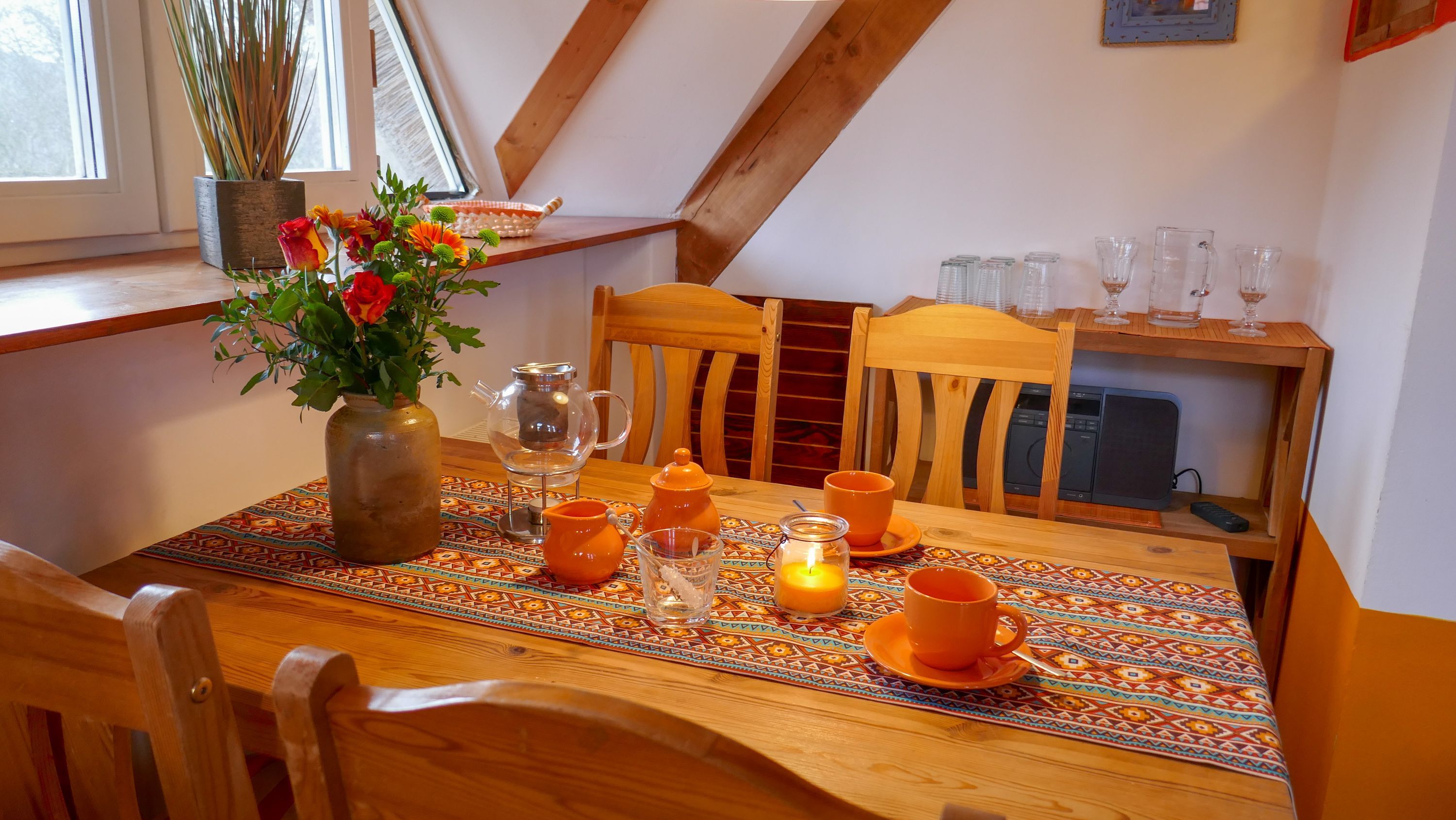 Die Ferienwohnung Paloma befindet sich im Obergeschoss des Reetdachhauses und ist ideal für 2 Personen geeignet. Ihr offener und luftiger Charakter begrüßt sie direkt mit Urlaubsfeeling. Im geräumigen Wohnzimmer finden sie eine Küchenzeile mit Kochfeld und Kühlschrank, einen Esstisch und einen gemütlichen Sitzbereich vor dem TV. Das Doppelbett (180x200) befindet sich leicht separiert neben der Raumspartreppe. Das Tageslicht-Bad ist mit einer Dusche und WC ausgestattet.