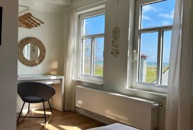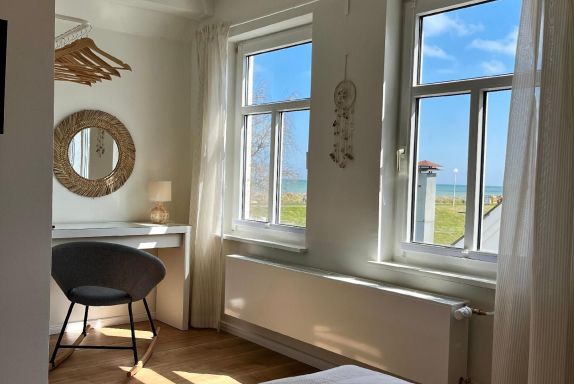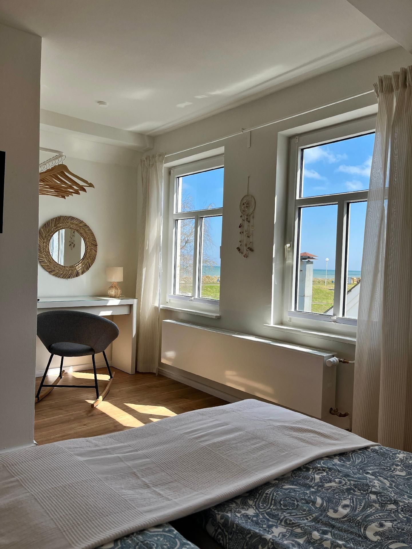Das Schlafzimmer ist ein gemütlicher Rückzugsort mit einem komfortablen Doppelbett und Blick auf die Ostsee.