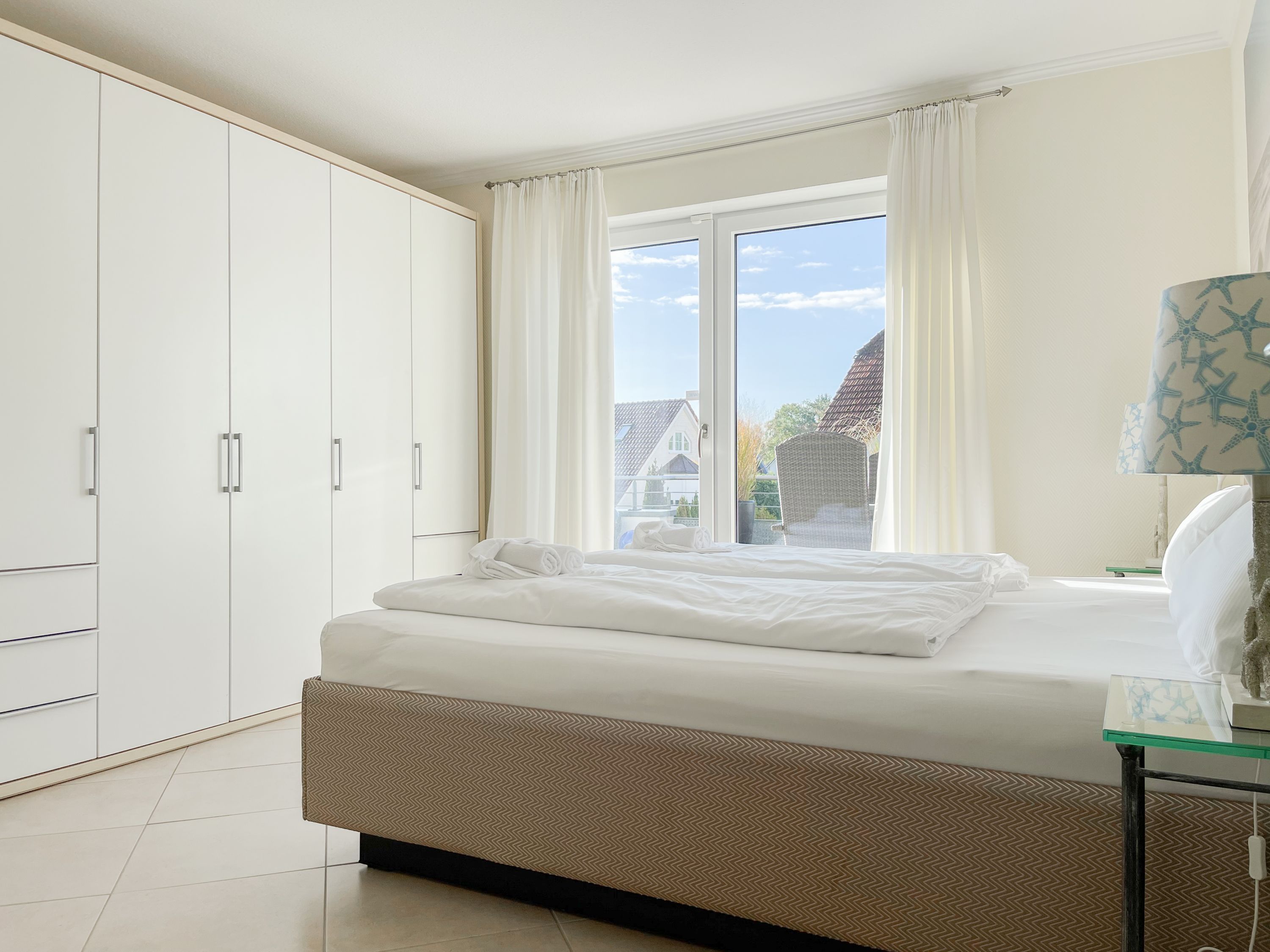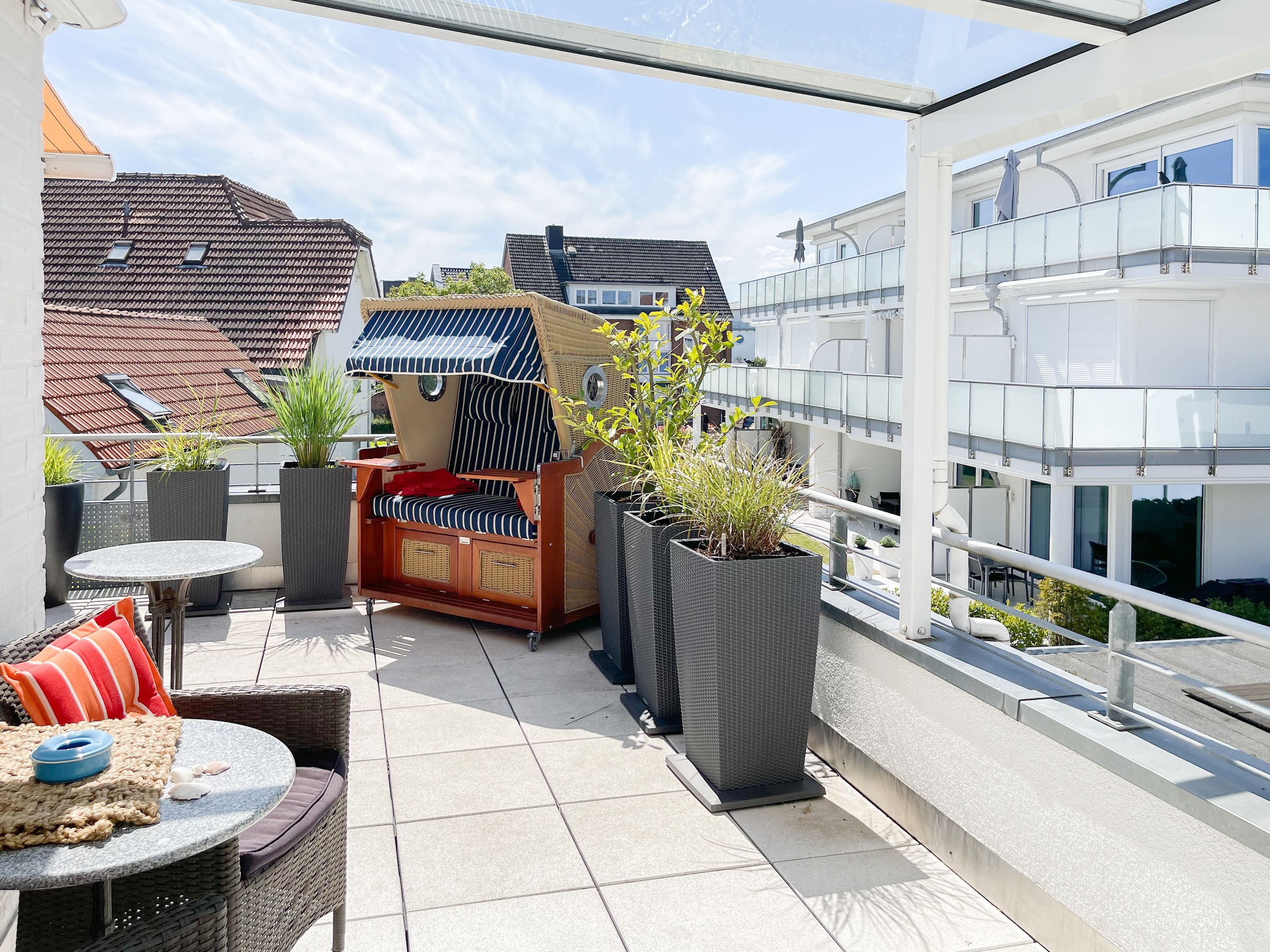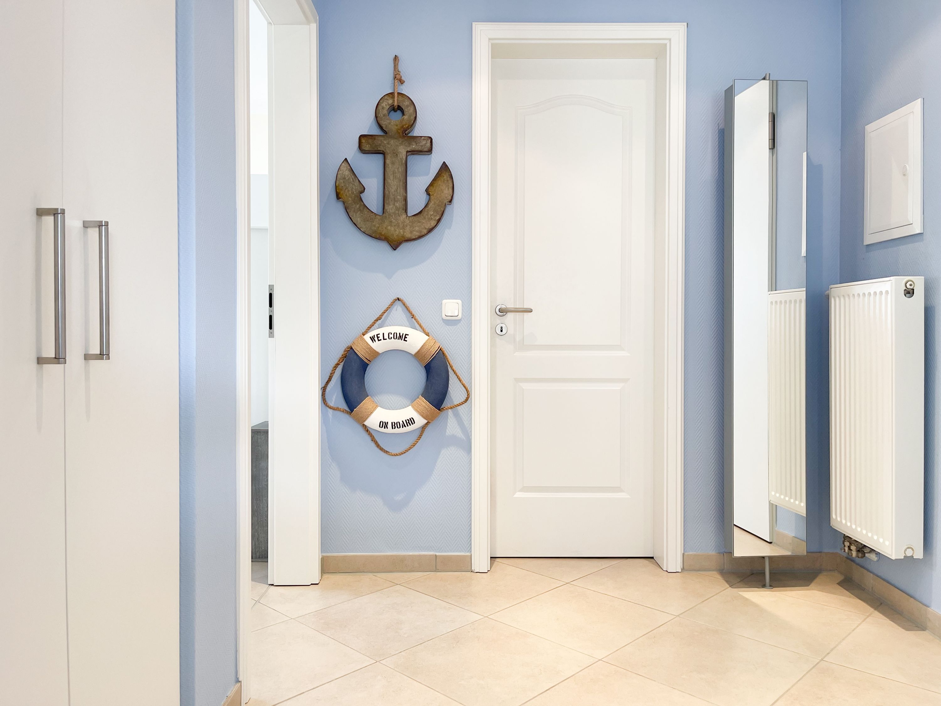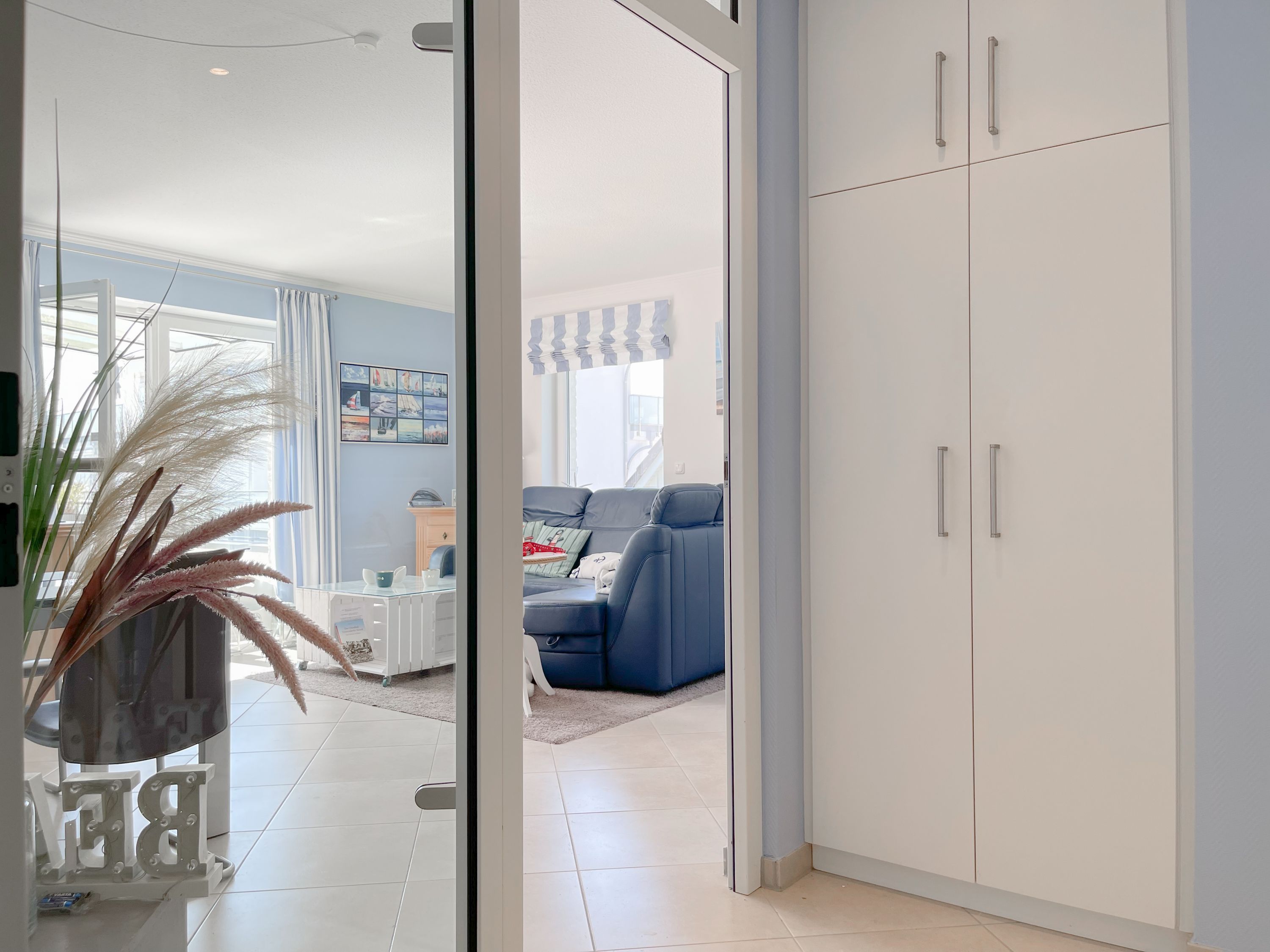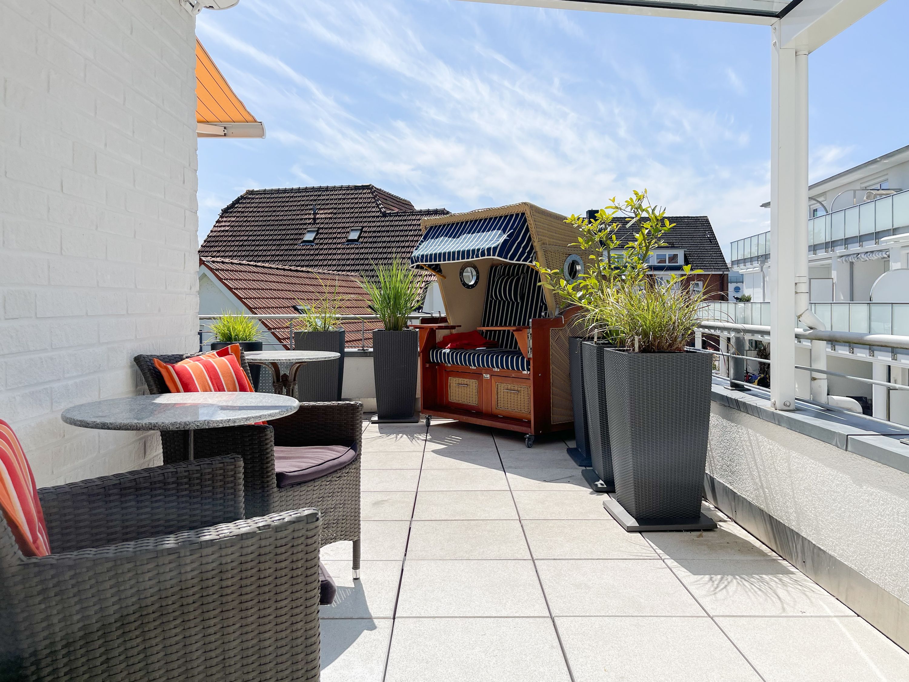 Die Oase 16 befindet sich in der 1. Etage, die bequem mit dem Aufzug zu erreichen ist und ausreichend Raum für 4 Personen bietet, um einen erholsamen Ostseeurlaub zu verleben. Die gemütliche, maritime Einrichtung schafft ein herrliches Ambiente zum wohlfühlen und viel Fensterfläche sorgt für lichtdurchflutete Räumlichkeiten. Alle Fenster der Wohnung sind mit elektrischen Außenjalousien versehen. Das absolute Highlight ist die riesige Dachterrasse in Südwestausrichtung für viele gemeinsame Sonnenstunden, die mit einer Essgruppe, Strandkorb und elektrischen Markisen ausgestattet ist. Der Außenbereich ist zum Teil überdacht und sowohl vom Wohnbereich als auch von einem Schlafzimmer zu betreten. Es stehen zwei separate Schlafzimmer zur Verfügung, die mit Doppelbetten (180x200 und 160x200) und Smart TV ausgestattet sind, sowie ein geräumiges Duschbad mit Fußbodenheizung und Handtuchtrockner. Mittelpunkt der Wohnung bildet der maritime Wohnbereich mit integriertem Essbereich und offener Küchenzeile in bester Ausstattung. Der großzügige Eingangsbereich ist hell gefliest und mit einem Einbauschrank ausgestattet und mit Glastüren vom Wohnbereich getrennt. Im an das Hauptschlafzimmer angrenzenden Wirtschaftsraum befinden sich Waschmaschine und Trockner sowie ein separater Gefrierschrank.