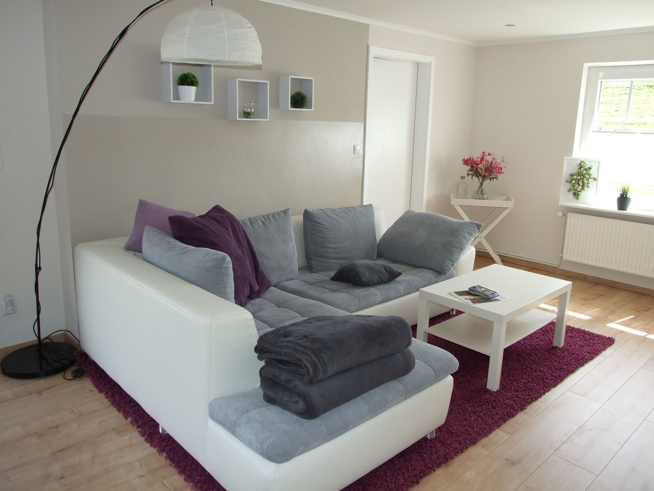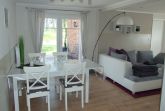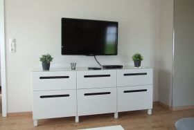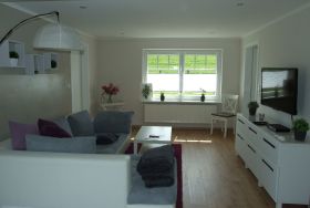 Die Aufteilung der Räume erstreckt sich über einen offenen Wohn - u. Essbereich mit hochwertiger Einbauküche, sowie ein kleines und ein großes Schlafzimmer, 2 Fluren, HW-raum und einem schönen Bad, welches stilvoll gefliest wurde und mit einer ebenerdigen Dusche ausgestattet ist.