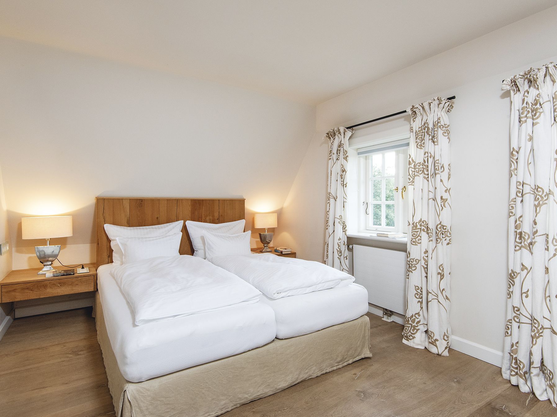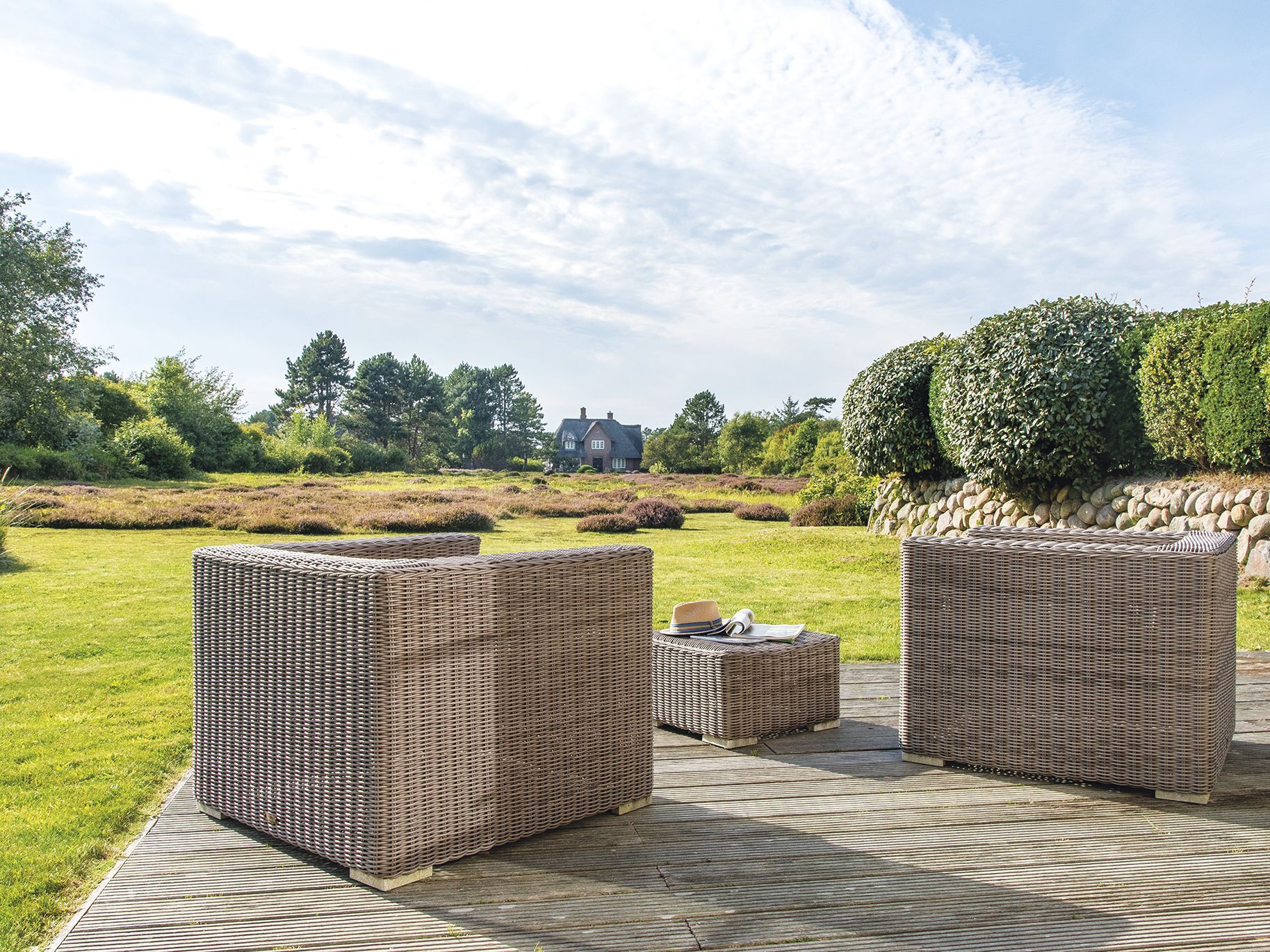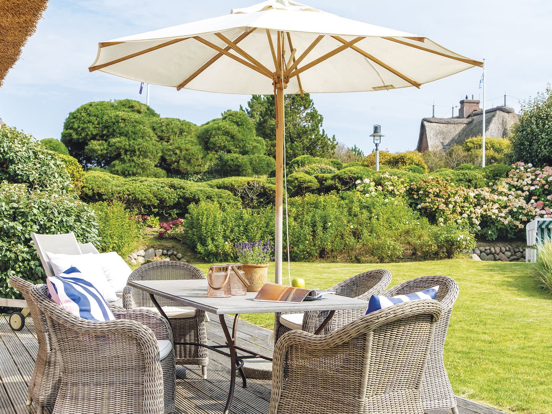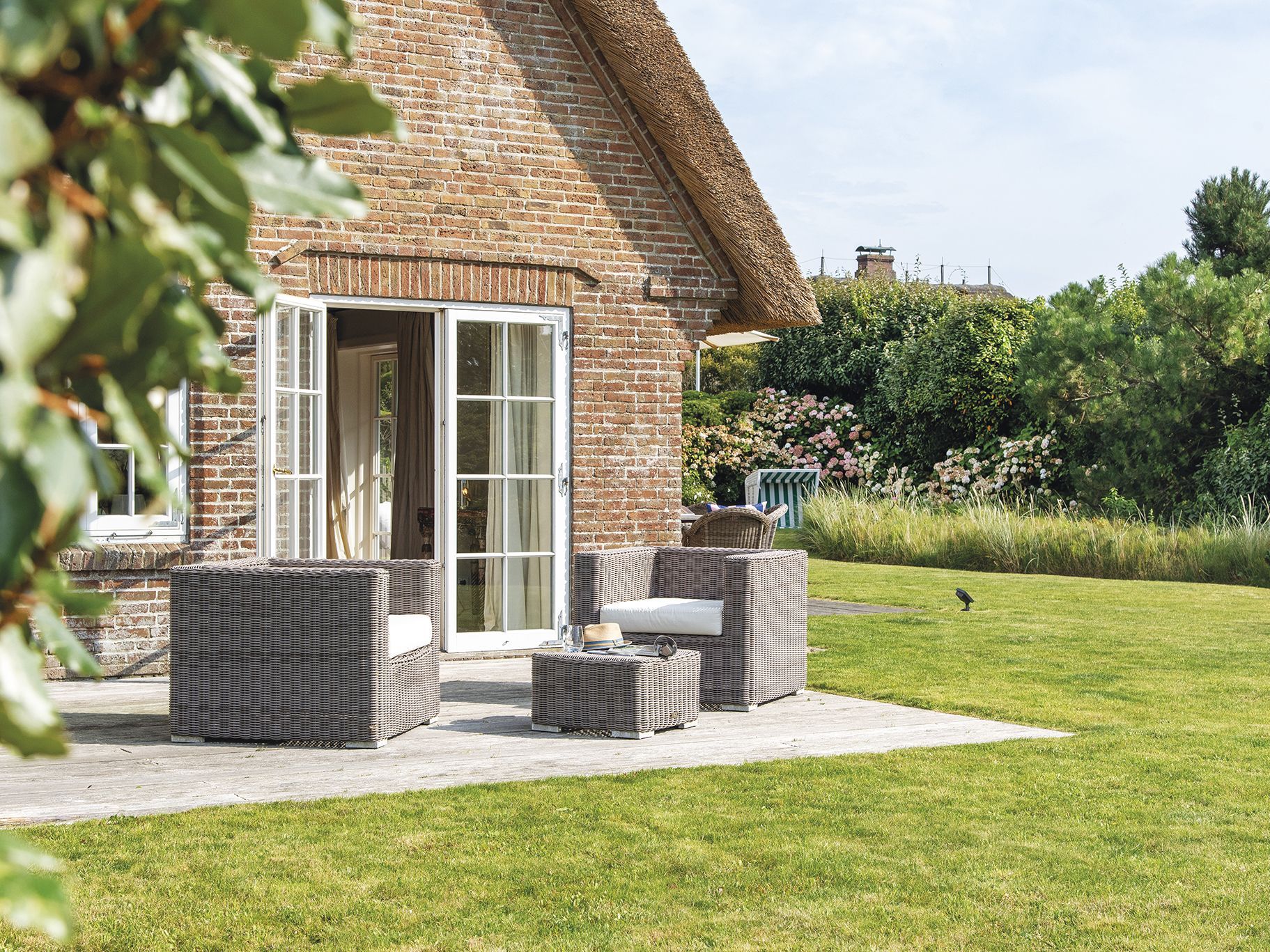 Landhausstil modernster Prägung: Komfort, Stil und Long-Island-Flair für bis zu sieben Personen erwarten Sie in dieser großzügigen Doppelhaushälfte im Heideweg. Ein Ferien-Eldorado mit riesigem Garten, Süd- und Westterrasse und exklusivem Weitblick über die Kampener Heide. Im Wohnbereich begeistern die Luxusküche mit Weinkühlschrank, der riesige Esstisch für gemütliche Abende in großer Runde und als besonderes Highlight die lichtdurchflutete Mega-Sitzecke mit Kamin und Gartenblick. Neben Sonne von Früh bis Spät hat man hier schlicht Platz - für sich oder auch die große Familie. Im Obergeschoss erwarten Sie zwei Doppelzimmer, eines mit begehbarem Kleiderschrank, sowie ein Einzelzimmer und ein zauberhaftes Wannenbad ganz in elegantem Beige. Im Untergeschoss gibt es noch ein weiteres Doppelzimmer und ein hübsches Bad mit XXL-Dusche.