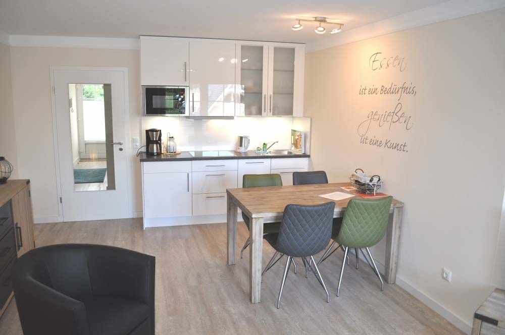 Wohnzimmer: 2 Hocker, 4 Plattenherd mit Ceranfeld, 4 Stühle, Anrichte, Bodenlampe, Couchtisch, Dunstabzugshaube, Eierkocher, Esstisch, Flachbildschirm, Geschirr, Kabel-TV, Kaffeemaschine, Kochtöpfe, Kofferradio mit CD-Player, Küchenzeile, Kühlschrank mit 3* Gefrierfach, Mikrowelle, Nespresso Maschine, Schlafcouch, Sessel, Spülmaschine, Toaster, TV-Tisch Wasserkocher