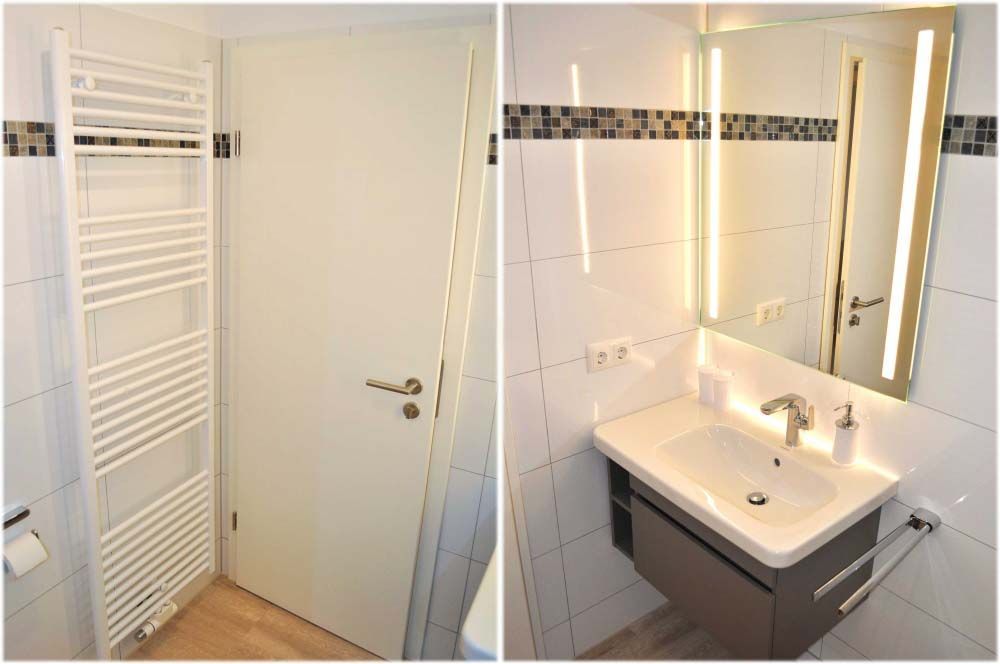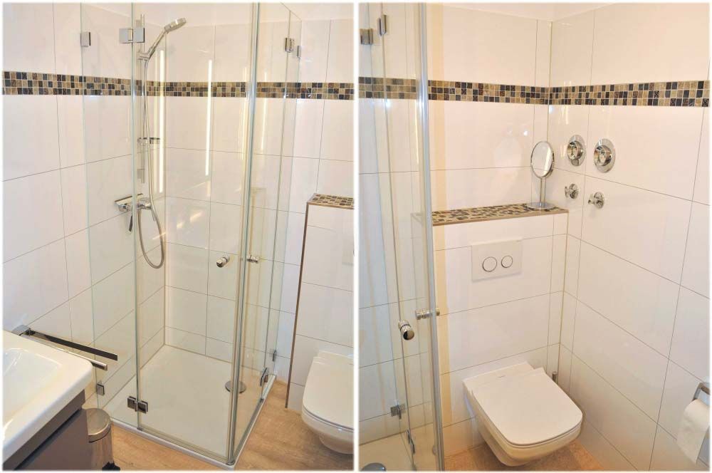 Bad 1: Dusche, Duschkabine, Fön, Kosmetikspiegel, Spiegel, Unterschrank, Waschtisch, WC