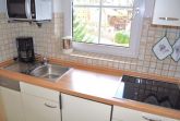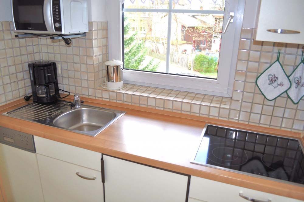 Küche: 4 Plattenherd mit Ceranfeld, Geschirr, Kaffeemaschine, Kochtöpfe, Küchenzeile, Kühlschrank, Mikrowelle, Spülmaschine, Toaster, Wasserkocher