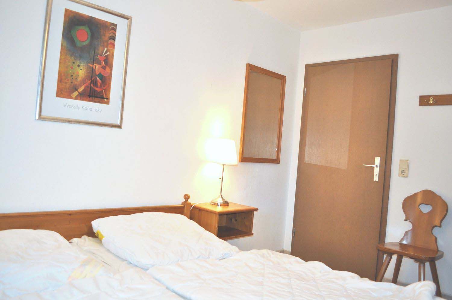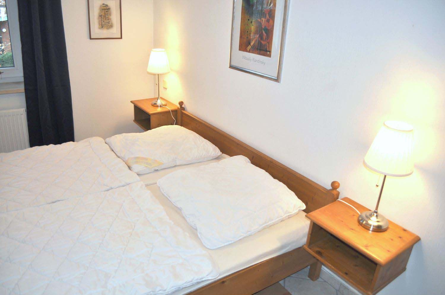 Schlafzimmer 1: 2 Nachttische, Doppelbett, Klappstuhl, Radiowecker, Schrank, Bügelbrett, Bügeleisen