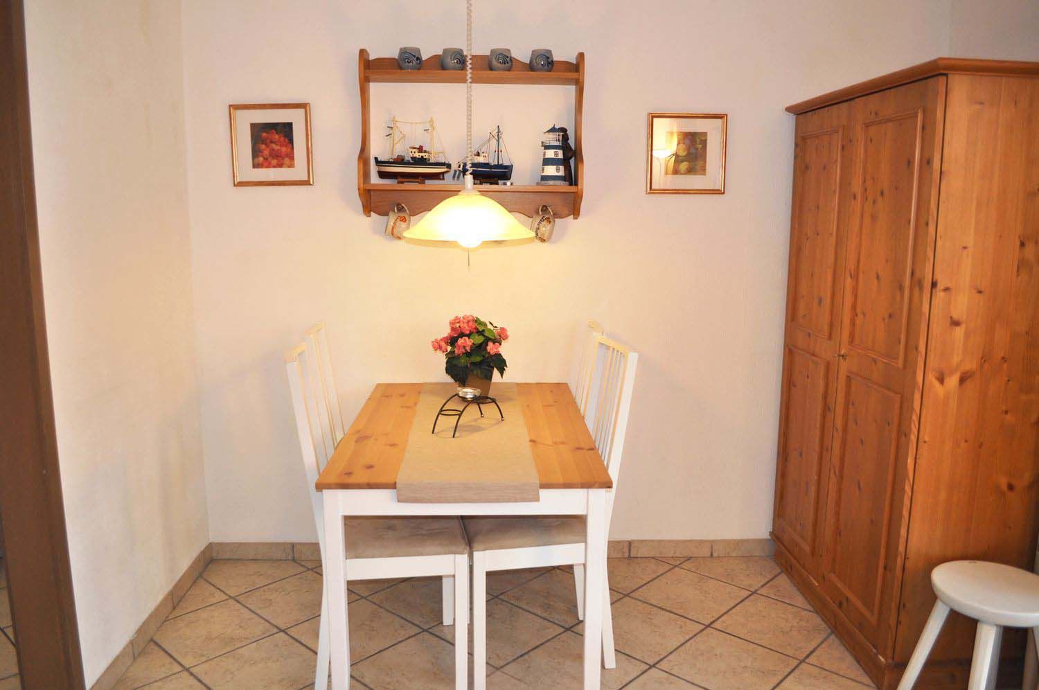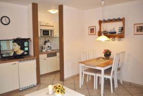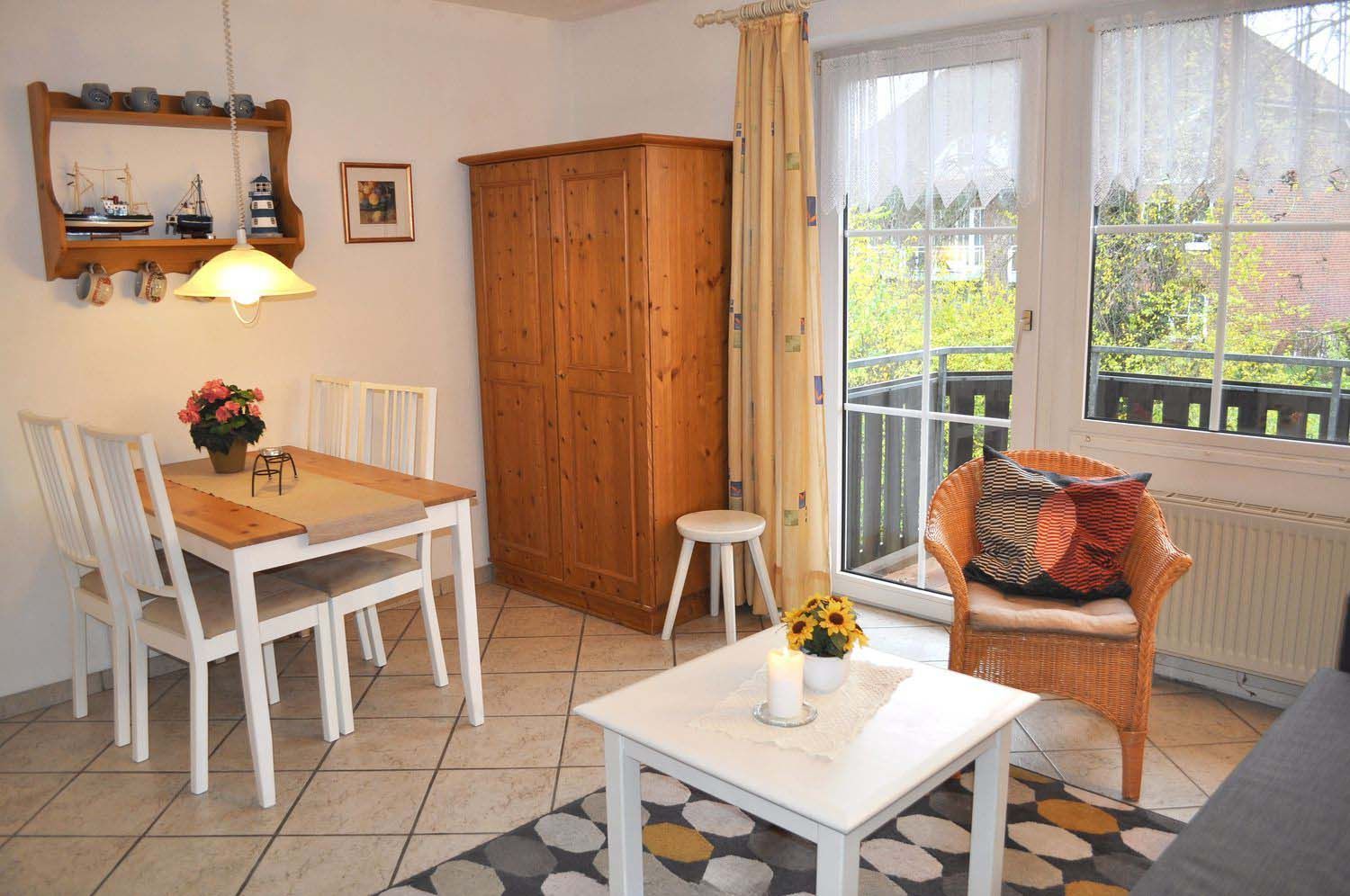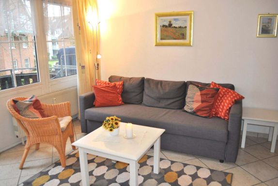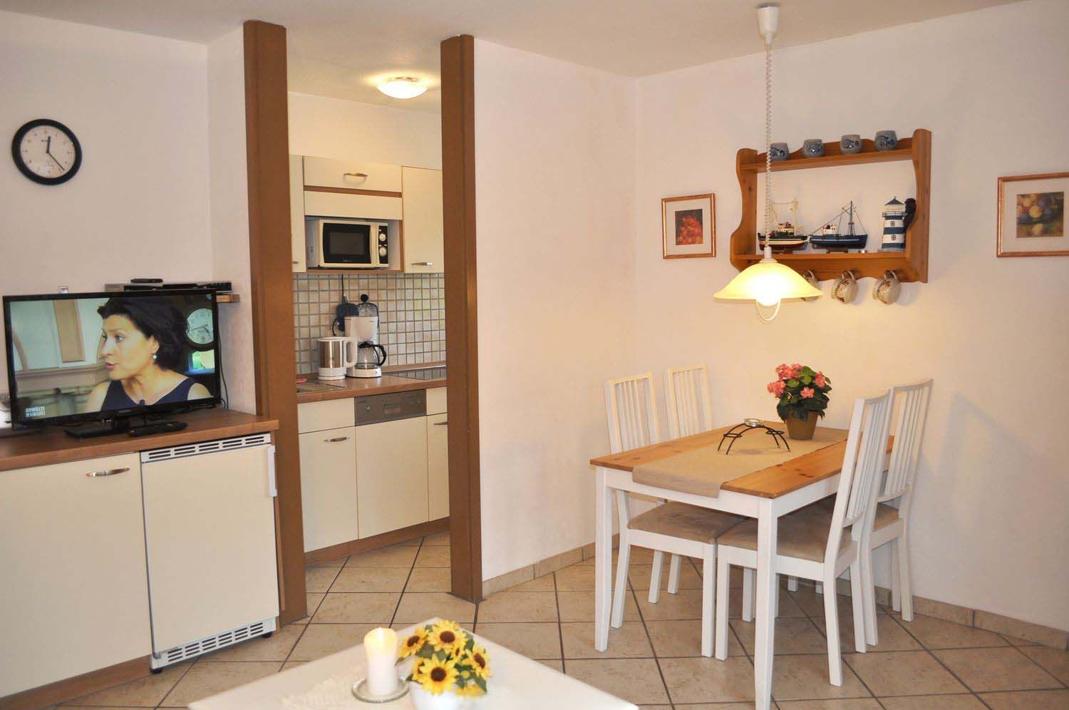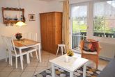 Wohnzimmer: Anrichte, DVD-Player, Essecke, Kabel-TV, Kofferradio mit CD-Player, Schlafcouch, Schrank, Sessel, Tisch