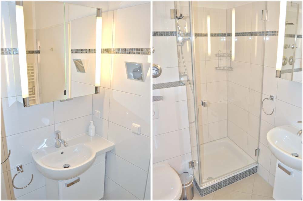 Bad 1: Dusche, Duschkabine, Fön, Kosmetikspiegel, Spiegelschrank, Waschtisch, WC