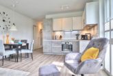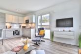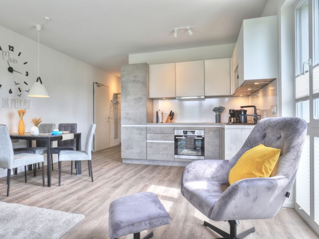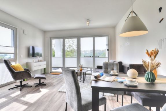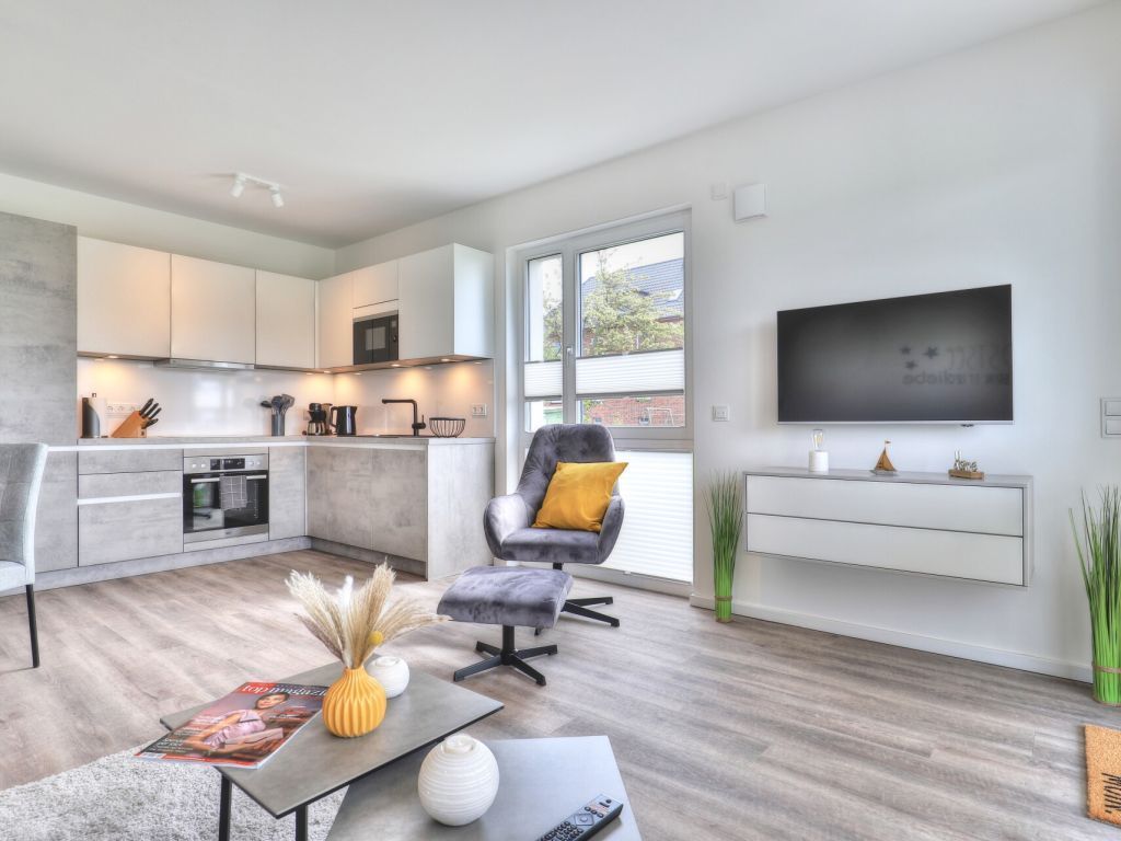 Komfortsofa wie auch ein Relax Sessel auf Sie warten. Von hier genießen Sie die Sicht auf die große, saisonal möblierte Terrasse, von der Sie auf die herrlichen Salzwiesen schauen. Des Weiteren bietet die Wohnung 3 Smart TV-Geräte und den Internetzugang über Glasfaseranschuss. Zudem ist eine bestens ausgestattete Wohnküche in den Wohnbereich integriert, in der Ihnen hochwertige Geräte wie Herd, Backofen, Mikrowelle, Kühlschrank mit Eisfach, Geschirrspüler, Kaffeemaschine, Wasserkocher, Toaster die Eigenversorgung ermöglichen. Ihre gemeinsamen Urlaubsmahlzeiten nehmen Sie am Esstisch zu sich, oder während der wärmeren Jahreszeit gerne auf der überdachten Süd-Terrasse mit Blick in die grüne Landschaft. Erholsam schlafen Sie in zwei separaten Schlafzimmern. Eines der Schlafzimmer ist sehr geräumig und bietet Ihnen ein Doppelbett, Kleiderschrank und einen Flachbildfernseher.