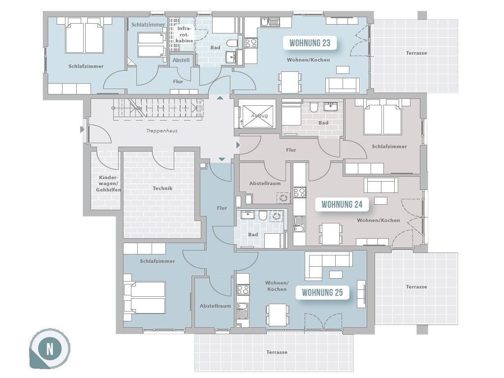Es erwarten Sie 2-3 Zimmer Wohneinheiten mit gut durchdachten Grundrissen und großzügigen Wohnflächen von 61qm bis 101qm. Jedes Ferienappartement besitzt entweder eine Terrasse, Balkon oder als Penthouse Wohnung zwei Dachterrassen. Eine Klimafreundliche Beheizung der Gebäude erfolgt über Luftwärmepumpen. In den Wohneinheiten sorgt die Fußbodenheizung für Wohlfühlwärme. Zudem sind die Wohnungen mit Klingelgegensprechanlage ausgerüstet. Mit dem Personenaufzug gelangen Sie und Ihr Gepäck bequem in die oberen Etagen. Kinder freuen sich über ein kleines Außenspielgelände. Ebenso sind PKW-Außenstellplätze vorhanden. Fahrradabstellmöglichkeiten mit E-Bike Ladestation können ebenfalls genutzt werden. Haustiere sind in einigen Wohnungen willkommen.
