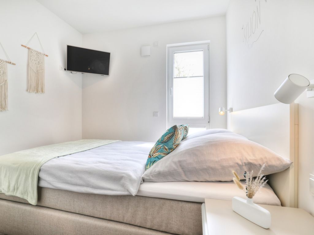 Das weitere Schlafzimmer besitzt ein Doppelbett -140cm x200cm- einen schmalen Kleiderschrank und ebenfalls einen Fernseher. Als Highlight erwartet Sie ein großzügiges Tageslichtbad, welches mit einer Infrarotkabine (Bluetooths Anbindung) ebenerdiger Dusche, Waschtisch, Waschtischunterschrank, WC sowie Handtuchheizung zum Entspannen einlädt. Es handelt sich um eine Nichtraucherwohnung, in der Haustiere willkommen sind. Ihr Fahrzeug parken Sie auf dem wohnungseigenen Außenstellplatz, der Ihnen kostenfrei zur Verfügung steht. Wir freuen uns auf Ihren Besuch in den Weißen Villen - Appartement 23.