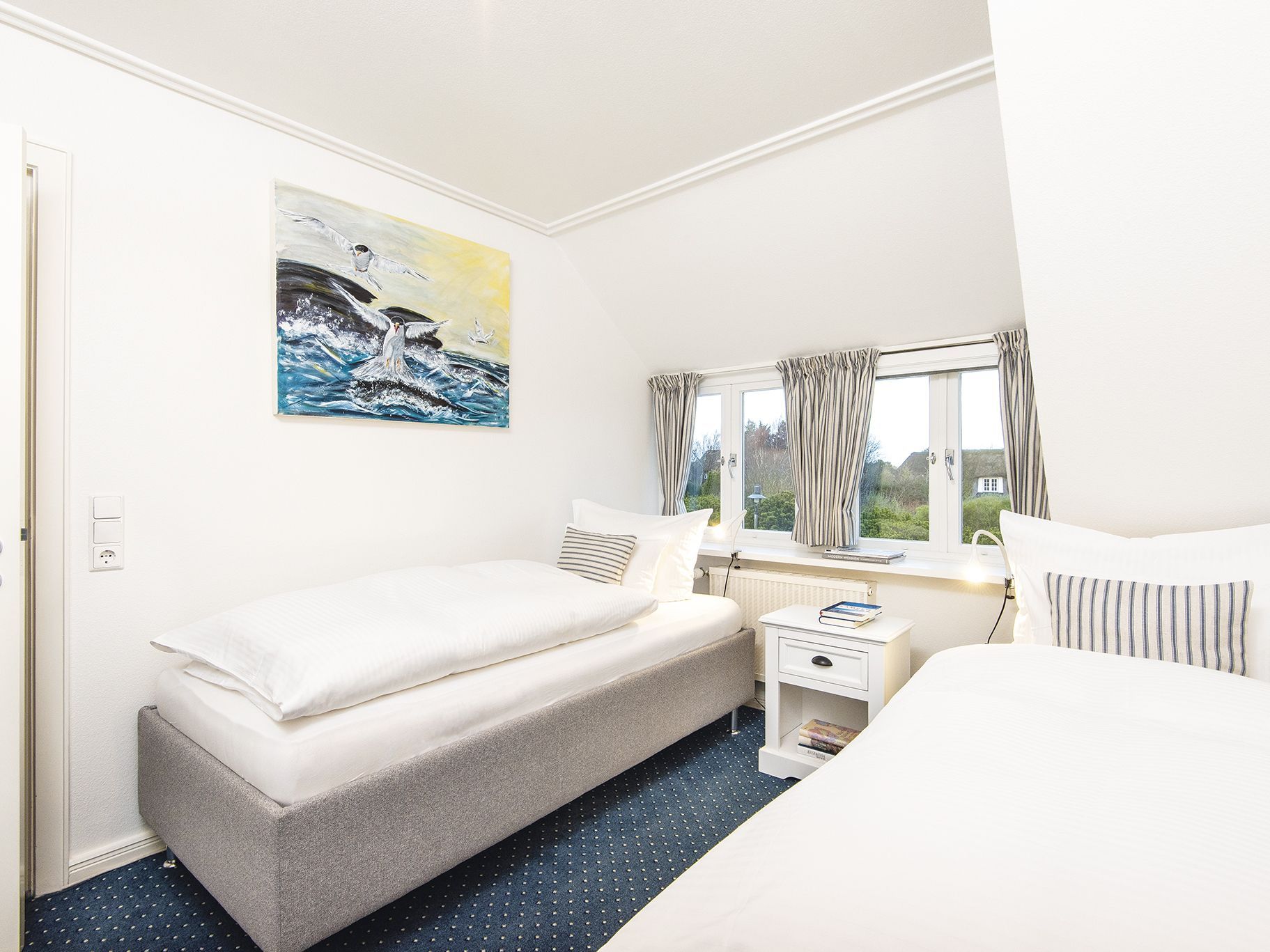 Dieses neu eingerichtete Hausteil bietet viel Platz in ruhiger Lage im Süden Kampens und doch sind es nur wenige Gehminuten bis zur Whiskeymeile. Ein kleiner Flur empfängt Sie und mündet in den modernen Wohnbereich mit offener Küche. Dieser ist wohnlich maritim eingerichtet und mit Holzfußboden ausgestattet. Der Blick führt hinaus auf die Südterrasse und in den großen Gemeinschaftsgarten mit den schönen Sylter Heckenrosen. Oben befinden sich ein Duschbad, ein helles Doppelschlafzimmer mit TV und ein Zweibettzimmer, jeweils mit Teppichboden ausgelegt. Im großzügigen Untergeschoss finden Sie gemütliches Doppelschlafzimmer mit TV und Holzfußboden, sowie ein großzügiges Duschbad. Ein idyllischer Rückzugsort für Ruhesuchende und Familien mit zwei ganz frisch renovierten Bädern.