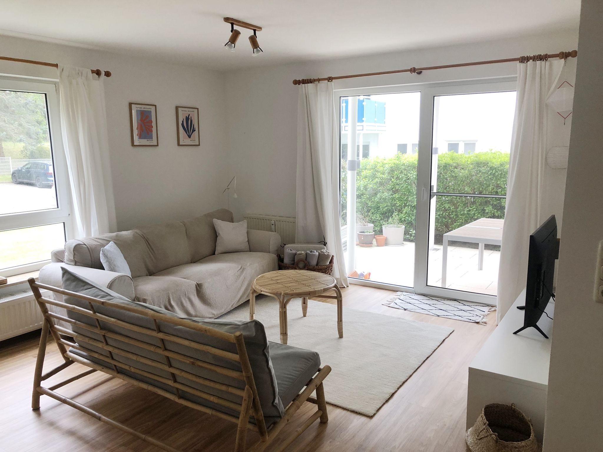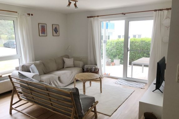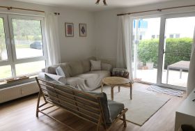 Die im Erdgeschoss an der Süd- und Westseite des Hauses gelegene Ferienwohnung bietet eine schöne Terrasse mit seitlichen Blick auf das Meer und man kann dort eine Hängematte aufhängen. Die Wohnung wurde von den Eigentümern liebevoll saniert und hat eine Größe von 71 m². Sie verfügt über Bad/WC mit Dusche, zwei Schlafzimmer sowie einem geräumigen Wohnraum mit Sitzgruppe für bis zu 4 Personen und einer offenen Küche ( Ceran-Kochfeld, Backofen, Kühlschrank mit Gefrierfach, Geschirrspüler, Kaffeemaschine, Espressomaschine, Reiskocher, Toaster & Wasserkocher). Der Wohnraum sowie das eine Schlafzimmer haben Zugang zum südwestlich gelegenen Balkon und sind oftmals Schauplatz schöner Sonnenuntergänge.