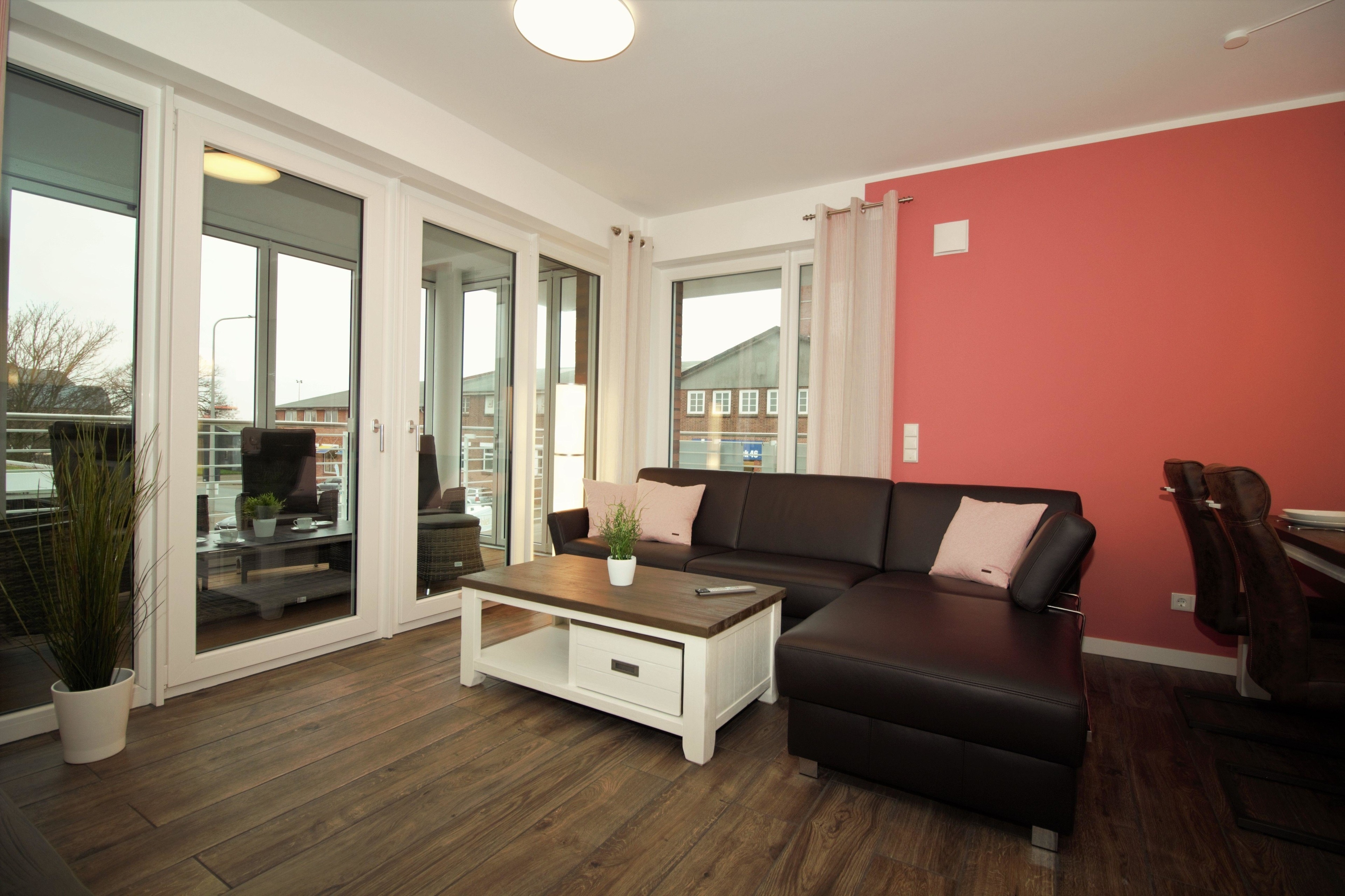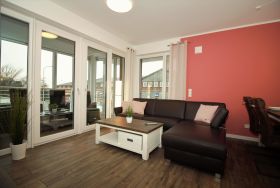 Ferienwohnung an der City-Marina für 4 Personen auf ca. 70qm, bezaubernde 3-Zimmer Luxus Ferienwohnung in der 1. Etage mit Seesicht, Lift, Fußbodenheizung und Lüftungsanlage, elektrisch verstellbare Boxspringbetten im Schlafzimmer I und hohes Einzelbett im Schlafzimmer II, 140cm breites hochwertiges Schlafsofa im Wohnbereich, voll ausgestattete Küche mit Mikrowelle + Spülmaschine.