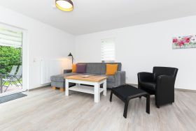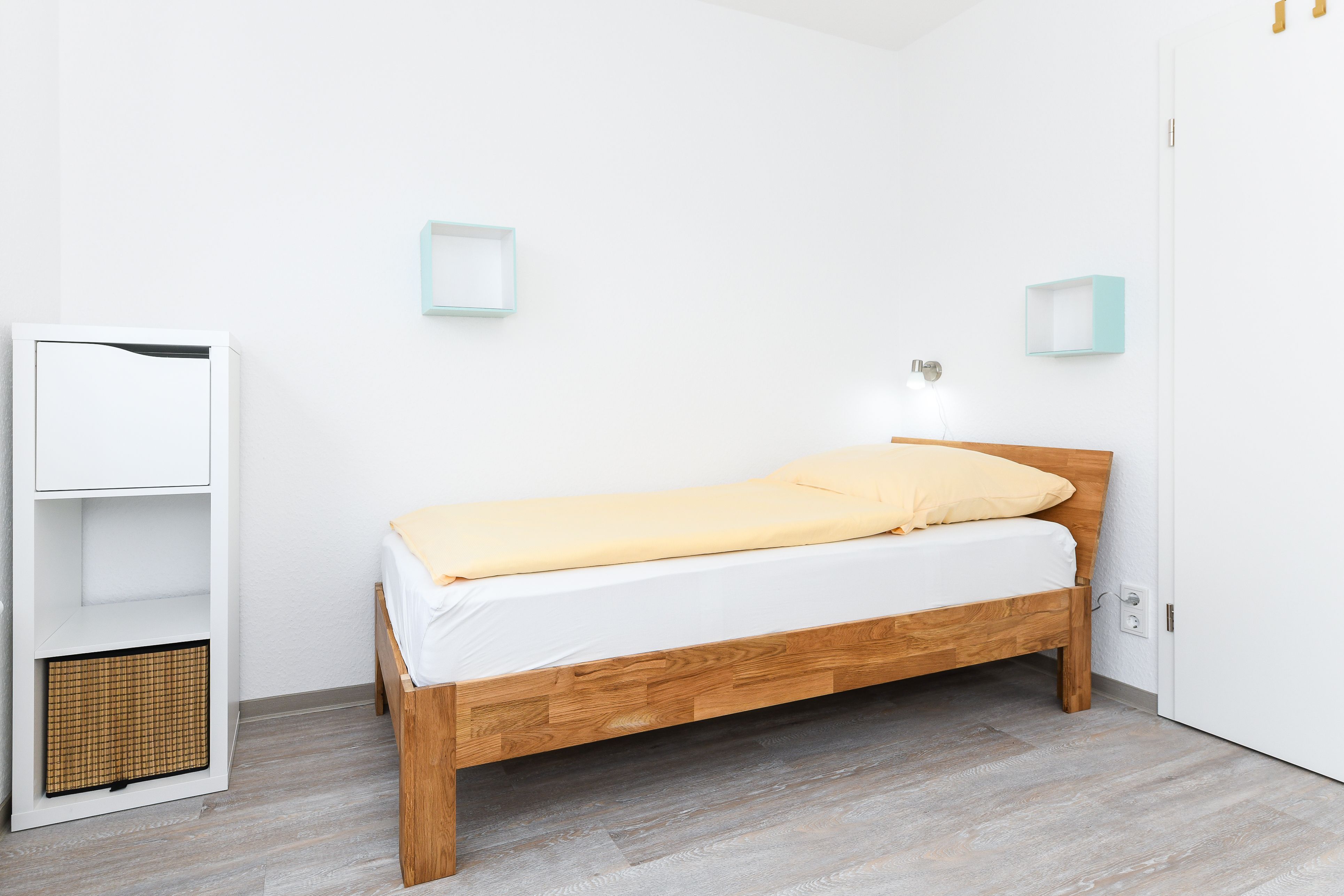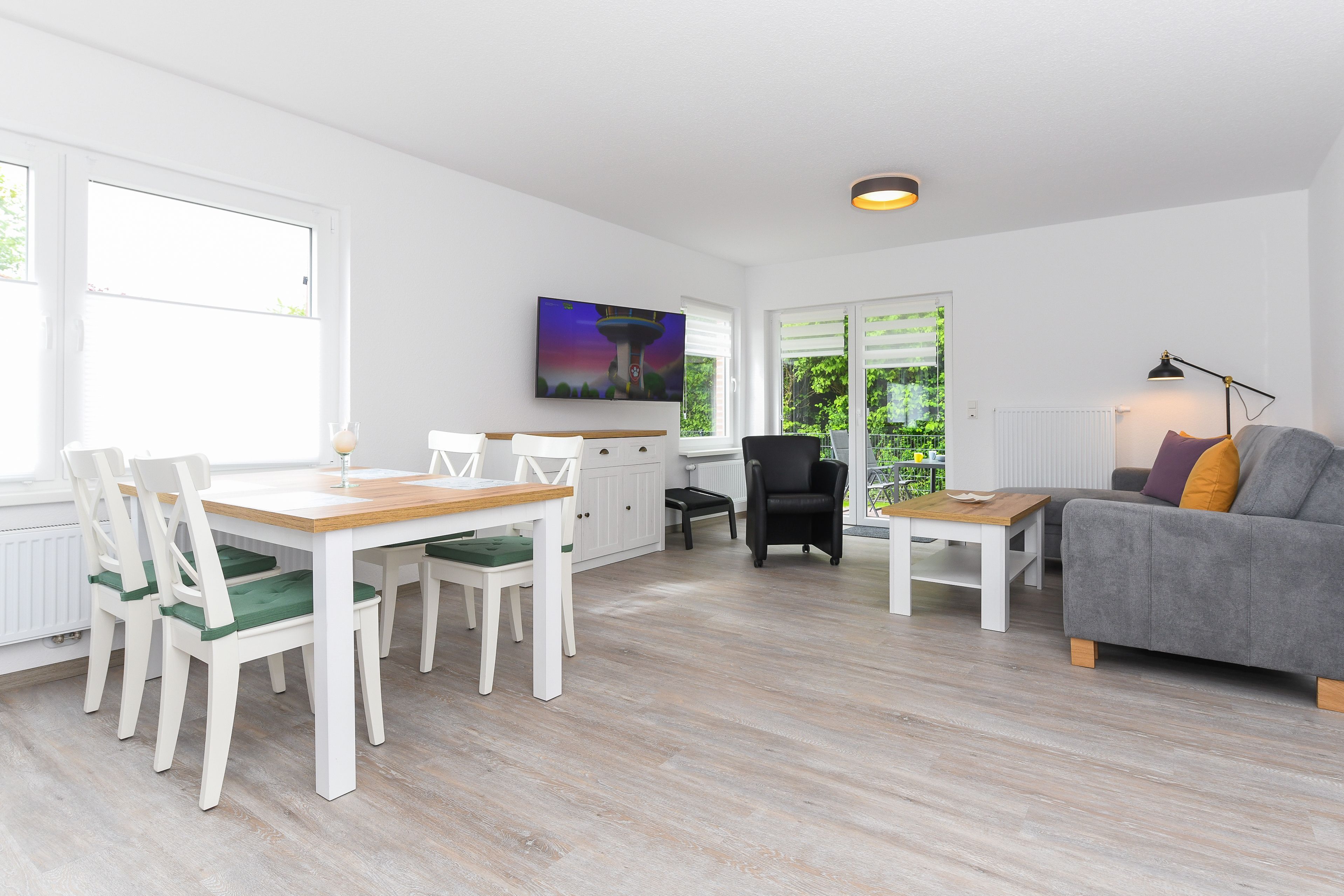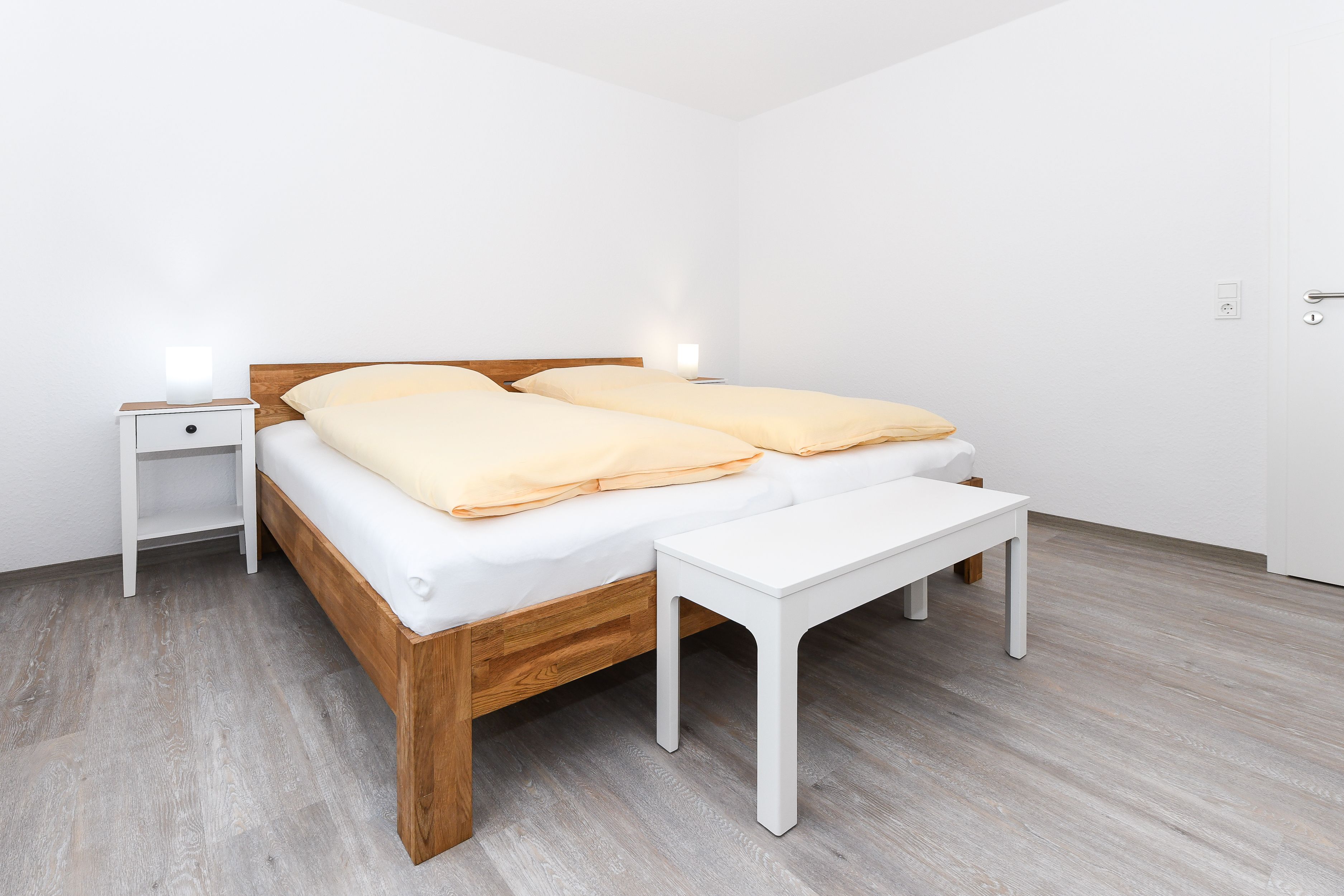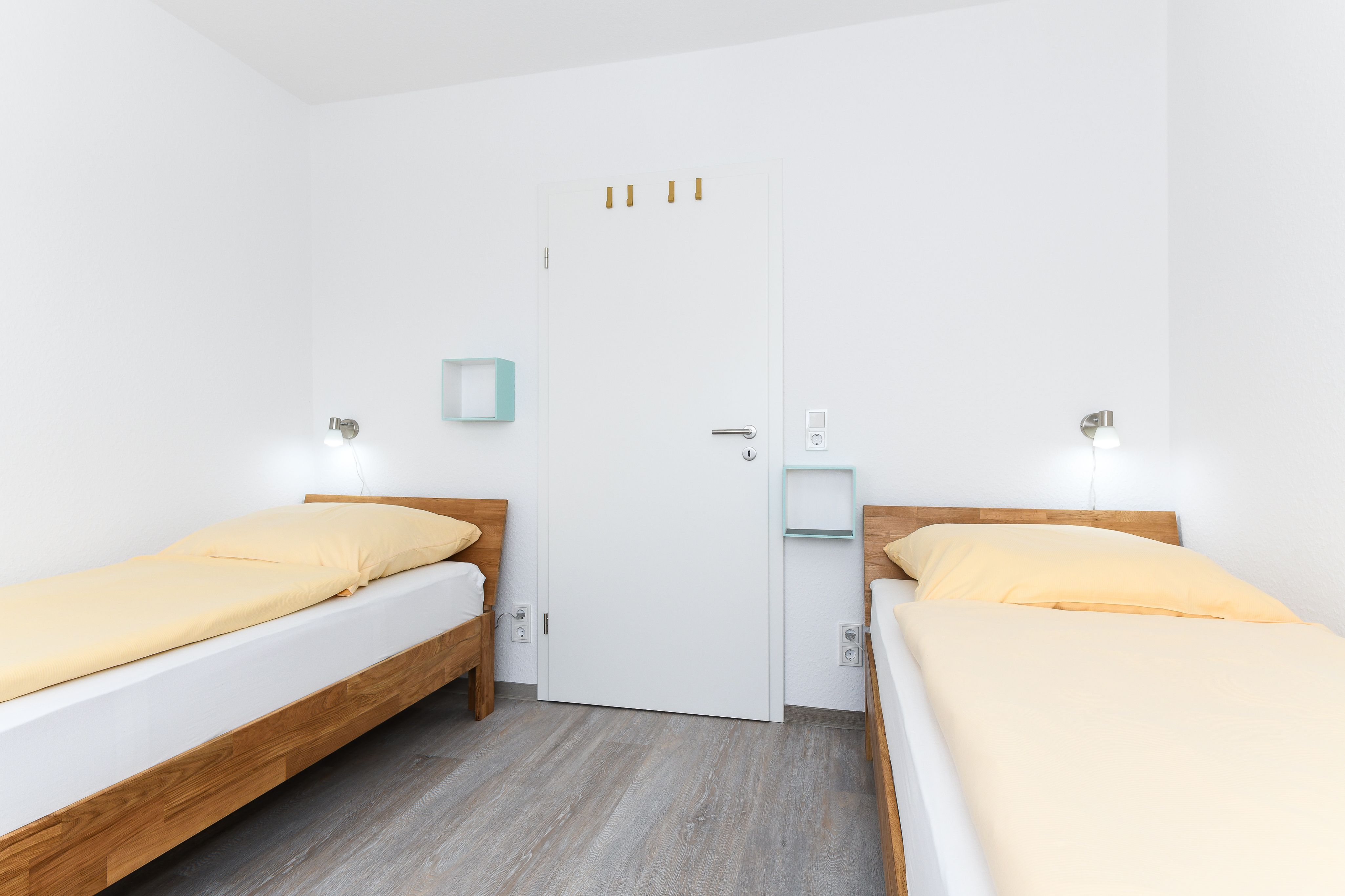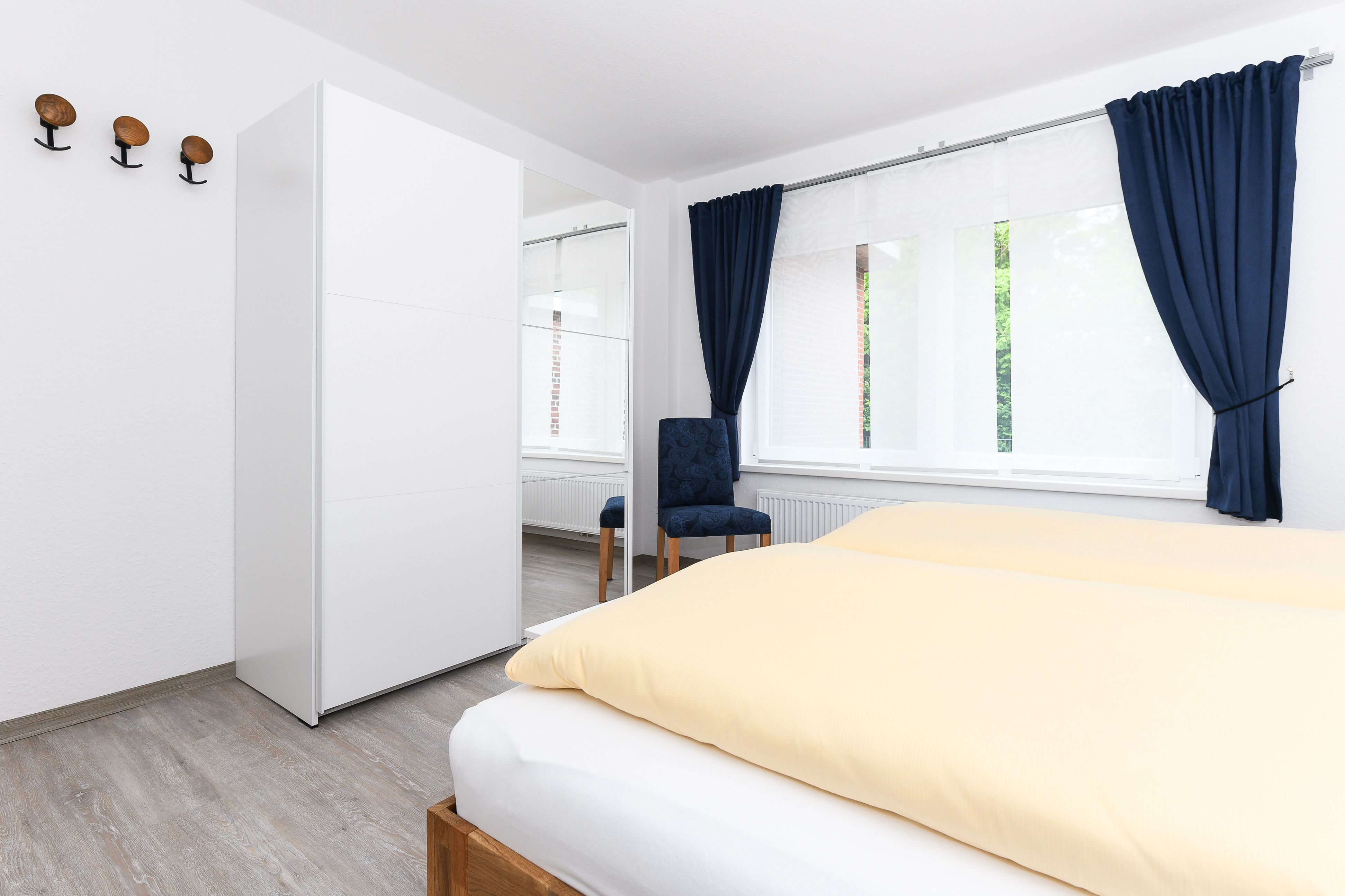 Die Erdgeschosswohnung (ca. 69 m²) hat eine Terrasse und bietet mit zwei Schlafzimmern (Eltern/Kinder) Platz für 4 Personen. Die Wohnung im Obergeschoss für 2 Personen (ca. 52 m²) hat einen sonnigen Balkon mit Blick auf den Park und den Deich. Der zweite Schlafraum ist mit einem separaten Zugang und liegt direkt neben der Wohnung.