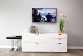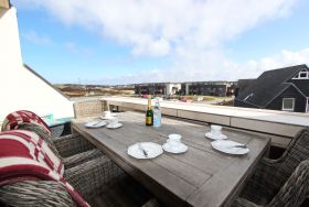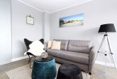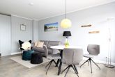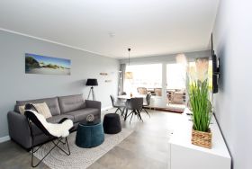 modernes 2 Zi.-App. mit ca. 55 m², im 2. OG für bis zu 4 Personen. Ein großes Wohn-/Schlafzimmer mit einer hochwertigen Doppelschlafcouch (1,60m x 2,00m), Tisch mit vier Stühlen, Netflix fähiger Fernseher und Zugang zum Ostbalkon mit Balkonmöbel. Abgetrennter Küchenbereich mit Cerankochfeld, Geschirrspüler, Mikrowelle, Kaffeemaschine und Kühlschrank. Dort finden Sie alles, um sich selbst versorgen zu können. Separater Schlafraum mit einem Boxspringbett (1,60m x 2,00m), Kommode und TV. Zugang zum zweiten Ostbalkon mit Strandkorb.