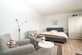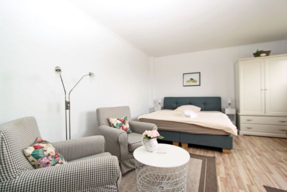 gepflegtes 1 Zi.-App. mit ca. 31 m², im Berliner Ring, unweit der Strände und des Golfplatzes Budersand. Ein Wohn-/Schlafraum mit Doppelboxspringbett, Esstisch für 2 Personen, zwei gemütliche Sessel zum entspannen, Couchtisch, Kleiderschrank, SAT-Flat-TV. Separate Küche mit 4 Plattenherd, Backofen, Mikrowelle sowie einem Kühlschrank mit Gefrierfach. Duschbad/WC. Flur mit Garderobe. Das Rauchen sowie die Tierhaltung sind nicht gestattet. Kostenloses WLAN. Zum Appartement gehört der PKW-Außenstellplatz mit der Nr. 27. Im Wirtschaftsraum befindet sich eine Münzwaschmaschine und ein -trockner.