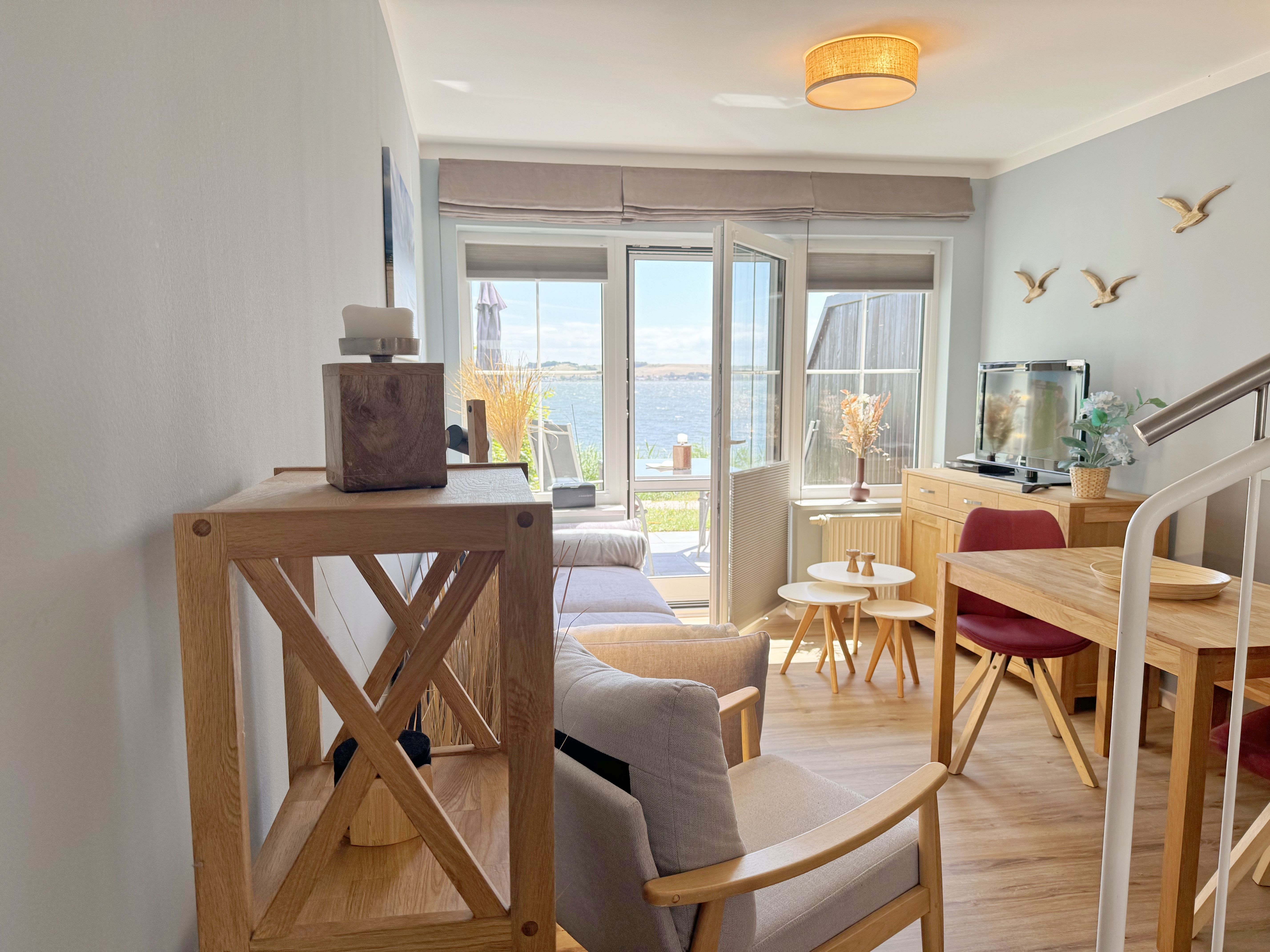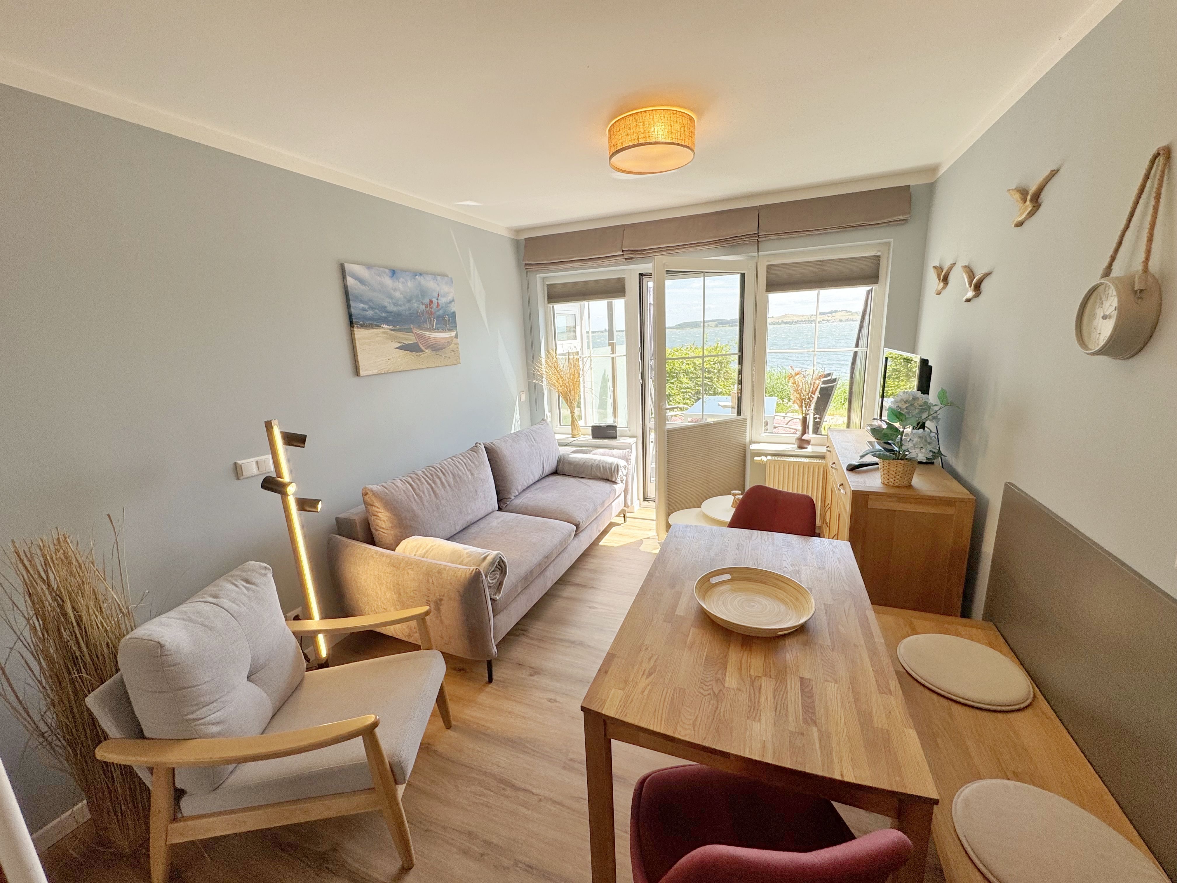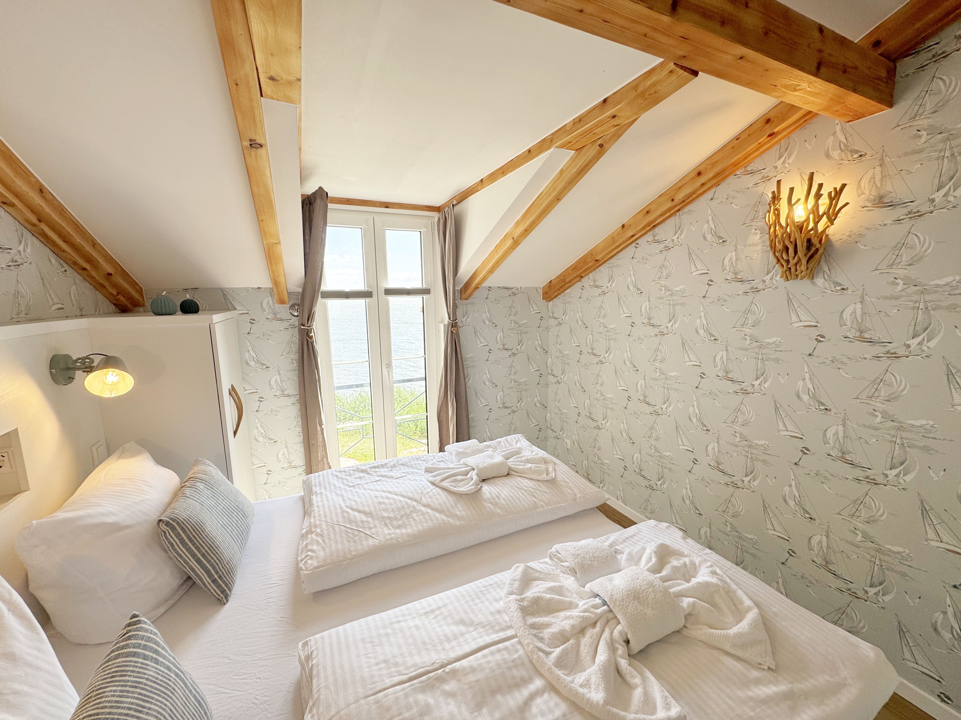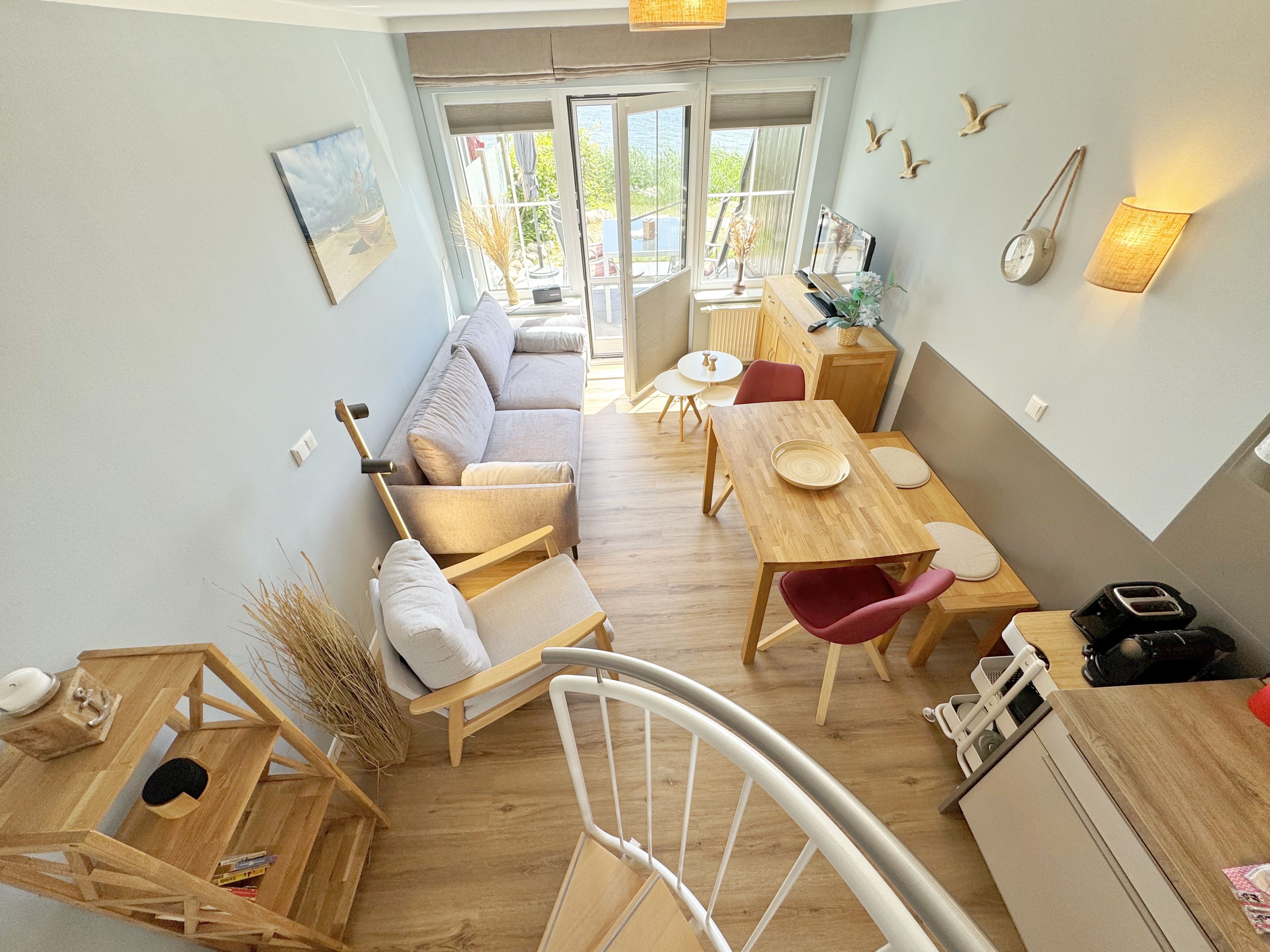 Die modern und liebevoll eingerichtete Wohnung 1 im Haus Seeblick im Maisonette-Stil verfügt über eine sonnige Terrasse mit offenem Seeblick, zwei separate Schlafbereichen im Obergeschoss, sowie einem hellen Wohnbereich mit offener Küchenzeile. Sie umfasst ca. 42qm. Genießen Sie einen unverwechselbaren Seeblick – direkt beim Aufstehen! Der komfortable Wohnbereich mit Couch + Couchtisch, einen Sessel, einer Stehlampe, eine Kommode mit Flachbild-TV sowie ein Regal bietet Ihnen einen gemütlichen Ort zum Ausklingen der erlebnisreichen Tage auf der Halbinsel Mönchgut. Von hier aus gelangen Sie auf die sonnige und bestuhlte Terrasse (Süden) mit Sonnenschirm und einem einzigartigen Seeblick. Angrenzend befindet sich eine offene und voll ausgestattete Küchenzeile mit Spülmaschine, Kühlschrank mit Eisfach, Dunstabzugshaube, Wasserkocher, Kaffeemaschine, Nespresso Maschine,Toaster, Induktionsfeld und Mikrowelle und ein Essplatz. Im Obergeschoss befinden sich die beiden Schlafräume, die jeweils mit einem komfortablen Doppelbett (1,80m x 2,00m) und Kleiderschrank ausgestattet sind. Auf der unteren Ebene befindet sich das freundliche Tageslicht-Bad mit einer ebenerdigen Dusche, ein WC, ein Fön sowie ein Waschplatz mit dazugehörigem Spiegel. Für unsere kleinen Gäste steht ein Hochstuhl sowie ein Kinderreisebett (ohne Bett Inlett/inkl. Matratze) zur Verfügung. Auch ein 4-Beiner ist mit seinem eigenen Schlafplatz gegen eine Gebühr ein gern gesehener Gast. Eine Fahrrad-Unterstellmöglichkeit steht Ihnen und allen Gästen des Hauses zur gemeinschaftlichen Nutzung kostenfrei zur Verfügung. Ihr PKW-Stellplatz befindet sich knapp 100m vom Haus entfernt und ist für Sie inklusive. Die Erstausstattung eines Wäschepaketes (komplette Bettwäsche, 1 Duschhandtuch, 2 kleine Handtücher) können Sie bis 14 Tage vor Anreise gegen einen Aufpreis dazu buchen oder durch eigene ergänzen. Ab 2 gebuchten Paketen erhalten Sie einmalig 1 Geschirrhandtuch und 1 Duschvorleger hinzu.