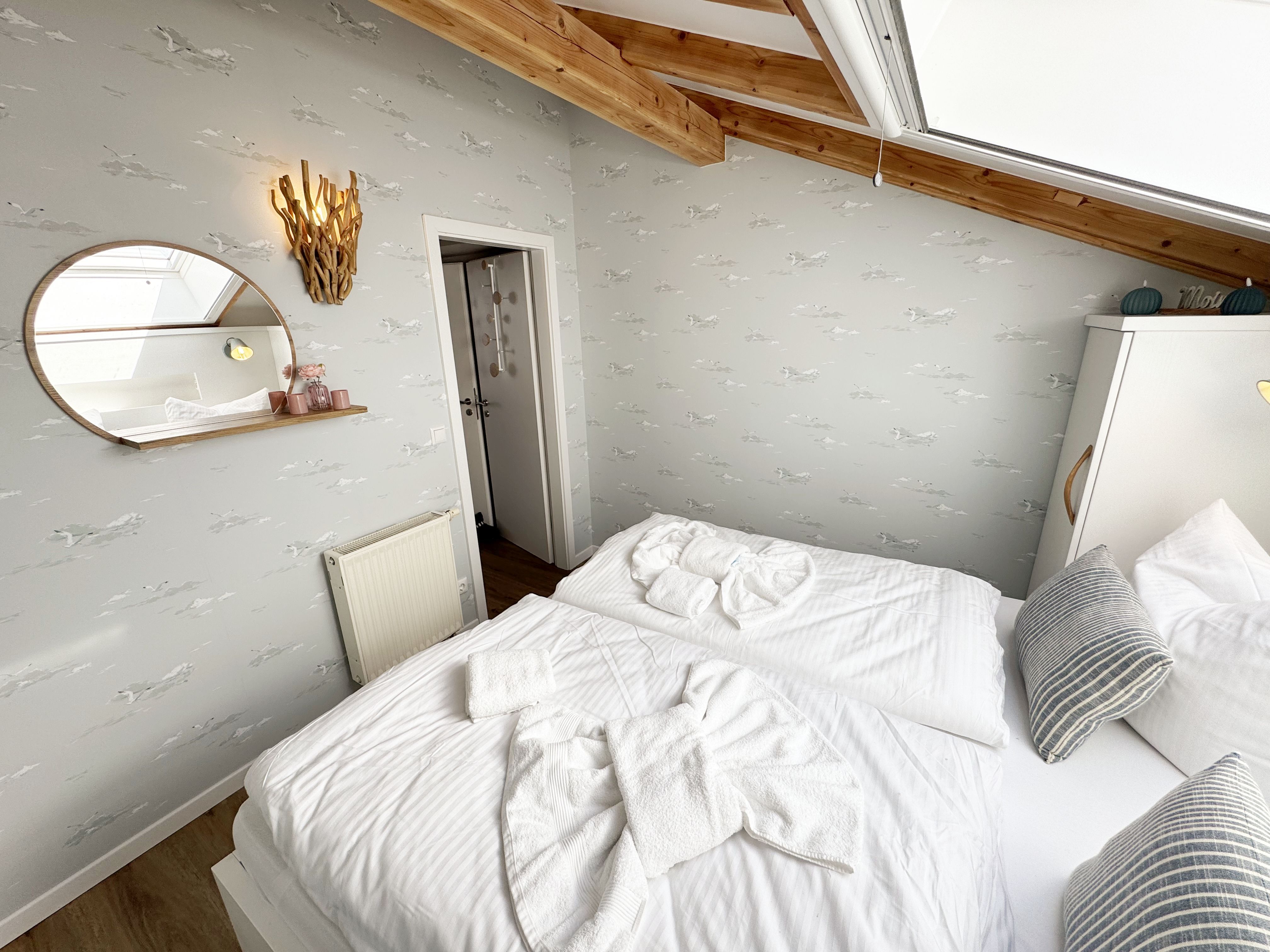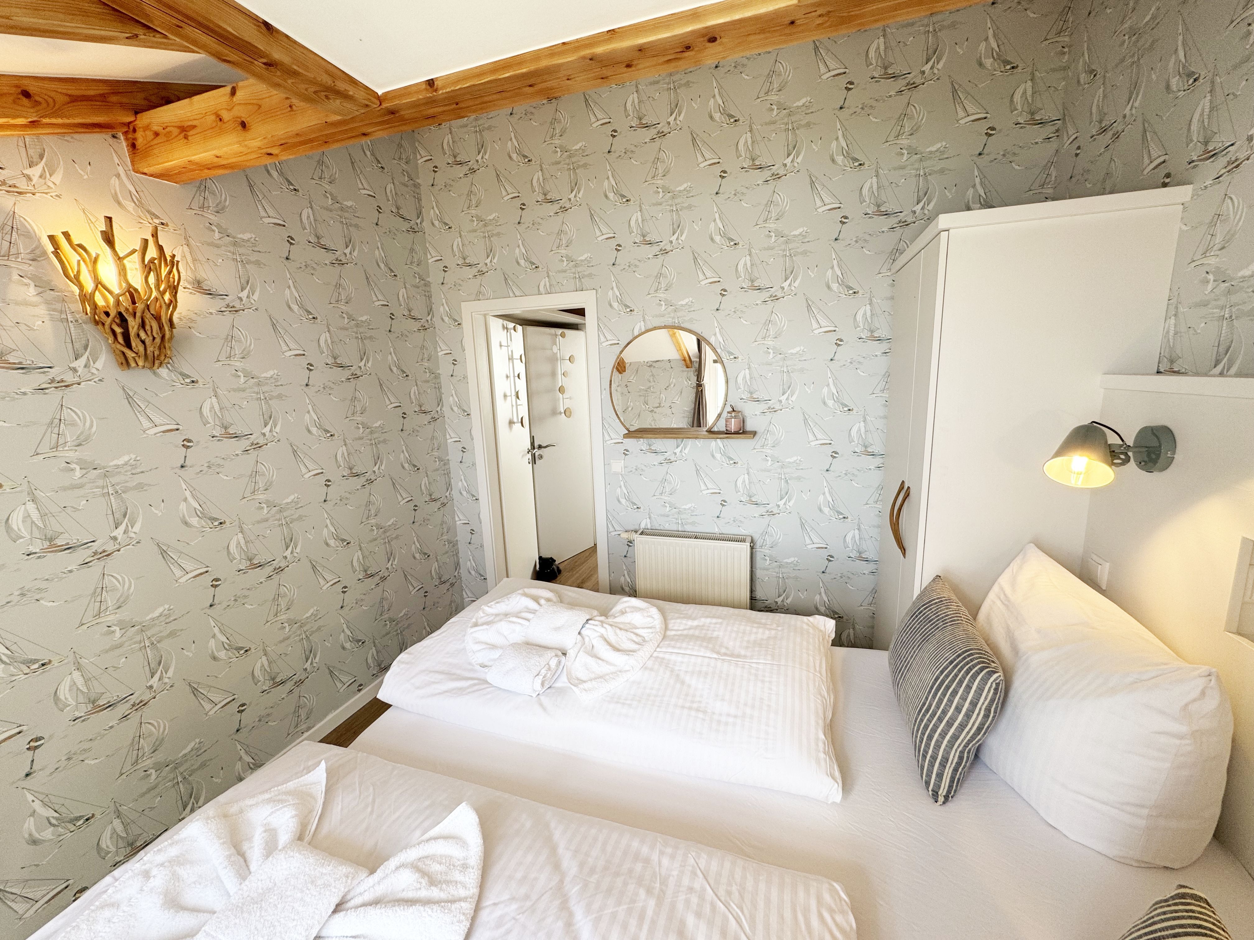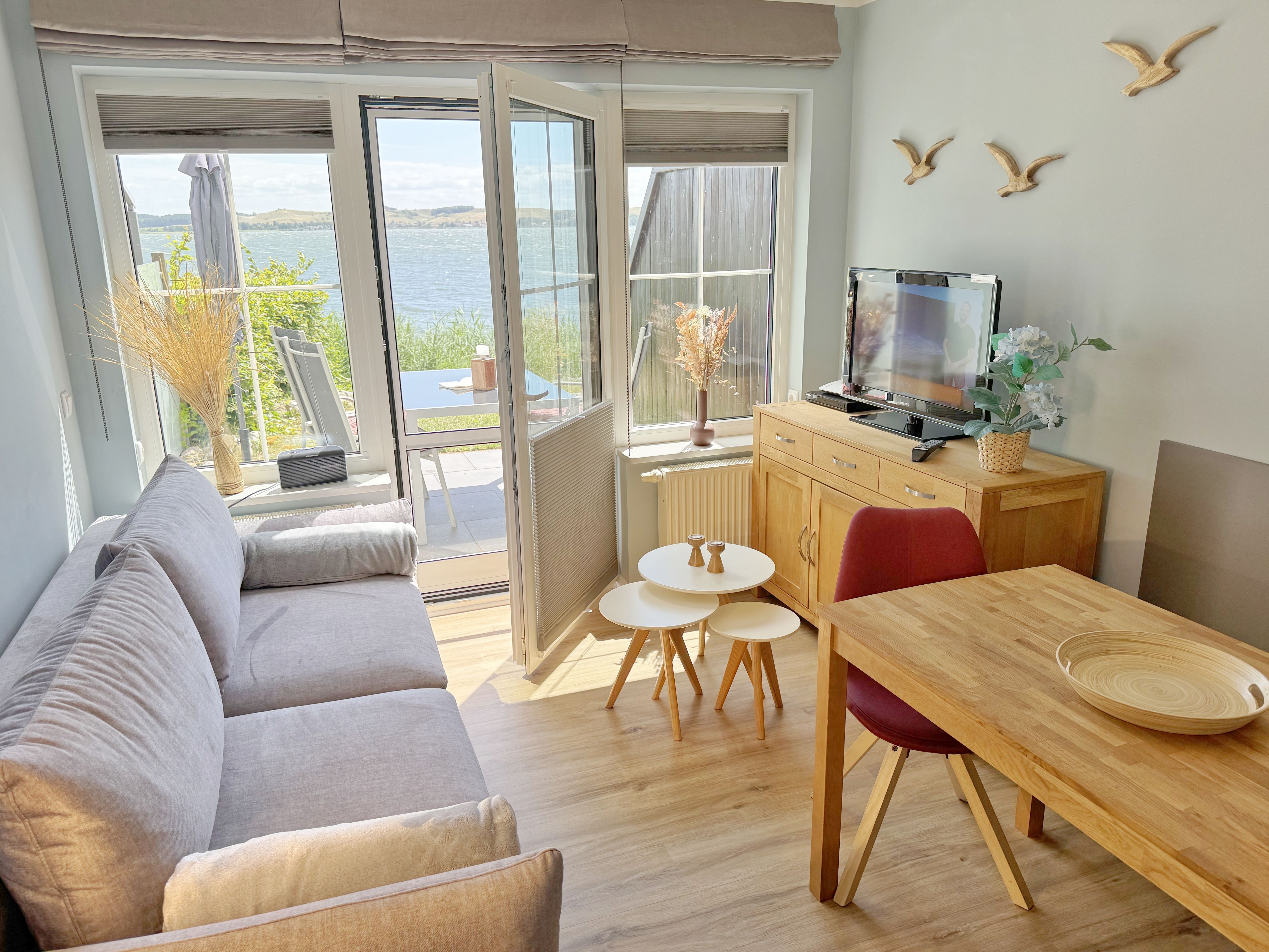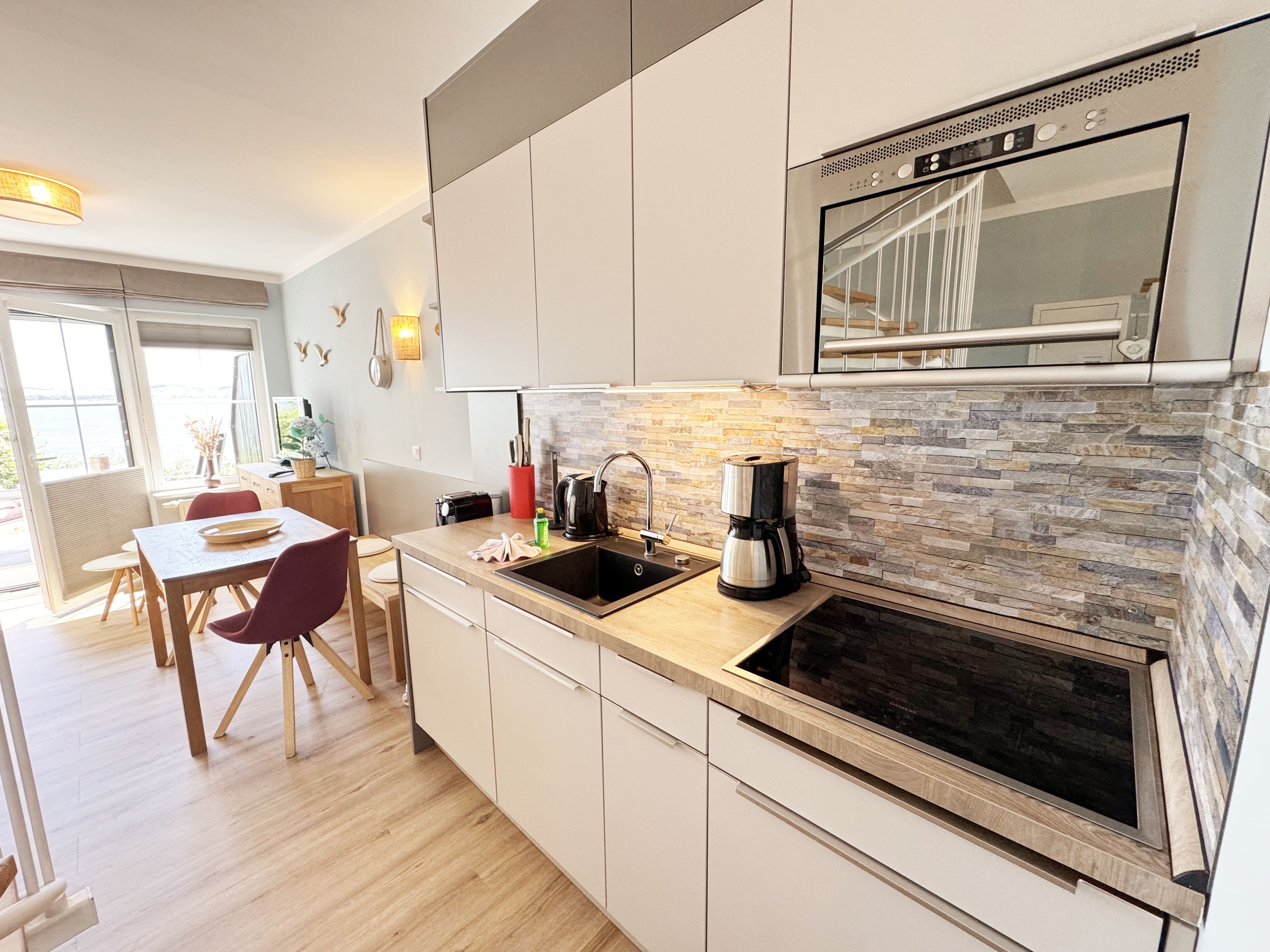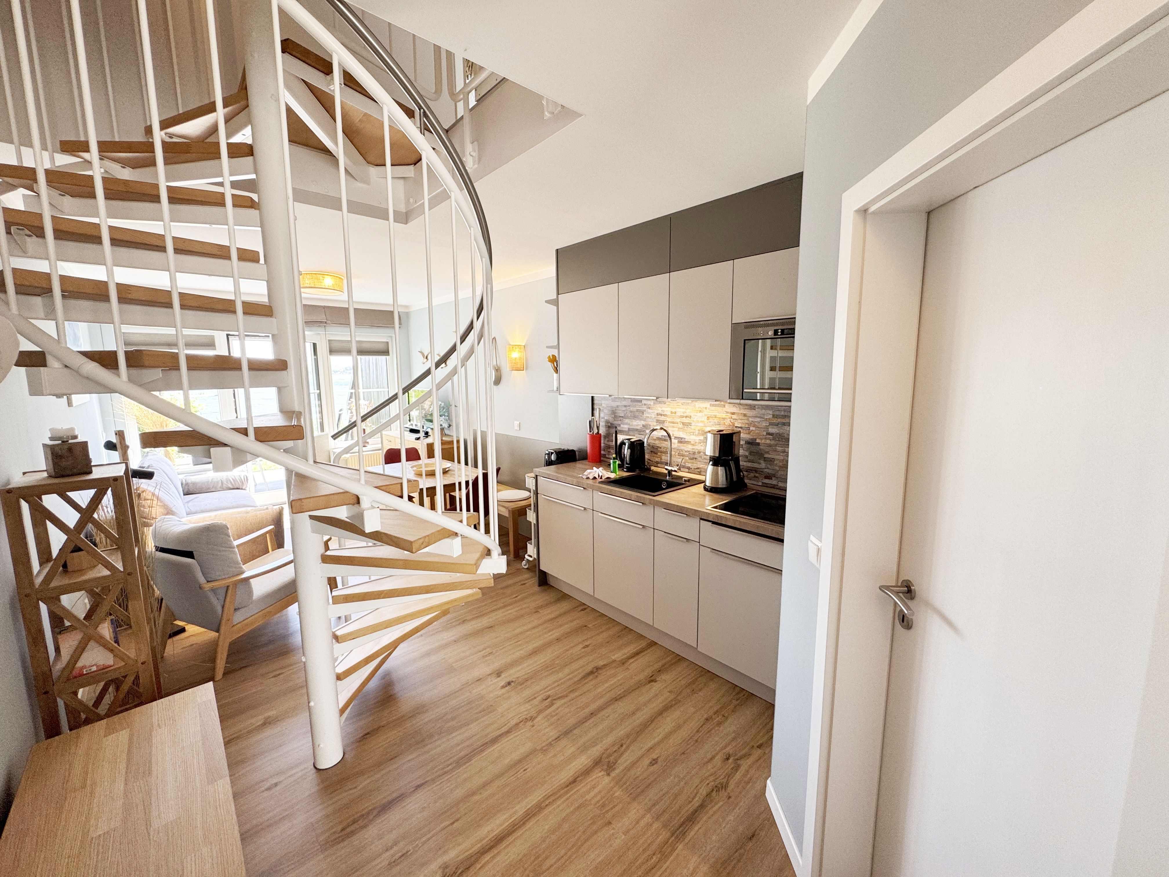 Die modern und liebevoll eingerichtete Wohnung 1 im Haus Seeblick im Maisonette-Stil verfügt über eine sonnige Terrasse mit offenem Seeblick, zwei separate Schlafbereichen im Obergeschoss, sowie einem hellen Wohnbereich mit offener Küchenzeile. Sie umfasst ca. 42qm. Genießen Sie einen unverwechselbaren Seeblick – direkt beim Aufstehen! Der komfortable Wohnbereich mit Couch + Couchtisch, einen Sessel, einer Stehlampe, eine Kommode mit Flachbild-TV sowie ein Regal bietet Ihnen einen gemütlichen Ort zum Ausklingen der erlebnisreichen Tage auf der Halbinsel Mönchgut. Von hier aus gelangen Sie auf die sonnige und bestuhlte Terrasse (Süden) mit Sonnenschirm und einem einzigartigen Seeblick. Angrenzend befindet sich eine offene und voll ausgestattete Küchenzeile mit Spülmaschine, Kühlschrank mit Eisfach, Dunstabzugshaube, Wasserkocher, Kaffeemaschine, Nespresso Maschine,Toaster, Induktionsfeld und Mikrowelle und ein Essplatz. Im Obergeschoss befinden sich die beiden Schlafräume, die jeweils mit einem komfortablen Doppelbett (1,80m x 2,00m) und Kleiderschrank ausgestattet sind. Auf der unteren Ebene befindet sich das freundliche Tageslicht-Bad mit einer ebenerdigen Dusche, ein WC, ein Fön sowie ein Waschplatz mit dazugehörigem Spiegel. Für unsere kleinen Gäste steht ein Hochstuhl sowie ein Kinderreisebett (ohne Bett Inlett/inkl. Matratze) zur Verfügung. Auch ein 4-Beiner ist mit seinem eigenen Schlafplatz gegen eine Gebühr ein gern gesehener Gast. Eine Fahrrad-Unterstellmöglichkeit steht Ihnen und allen Gästen des Hauses zur gemeinschaftlichen Nutzung kostenfrei zur Verfügung. Ihr PKW-Stellplatz befindet sich knapp 100m vom Haus entfernt und ist für Sie inklusive. Die Erstausstattung eines Wäschepaketes (komplette Bettwäsche, 1 Duschhandtuch, 2 kleine Handtücher) können Sie bis 14 Tage vor Anreise gegen einen Aufpreis dazu buchen oder durch eigene ergänzen. Ab 2 gebuchten Paketen erhalten Sie einmalig 1 Geschirrhandtuch und 1 Duschvorleger hinzu.