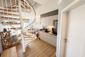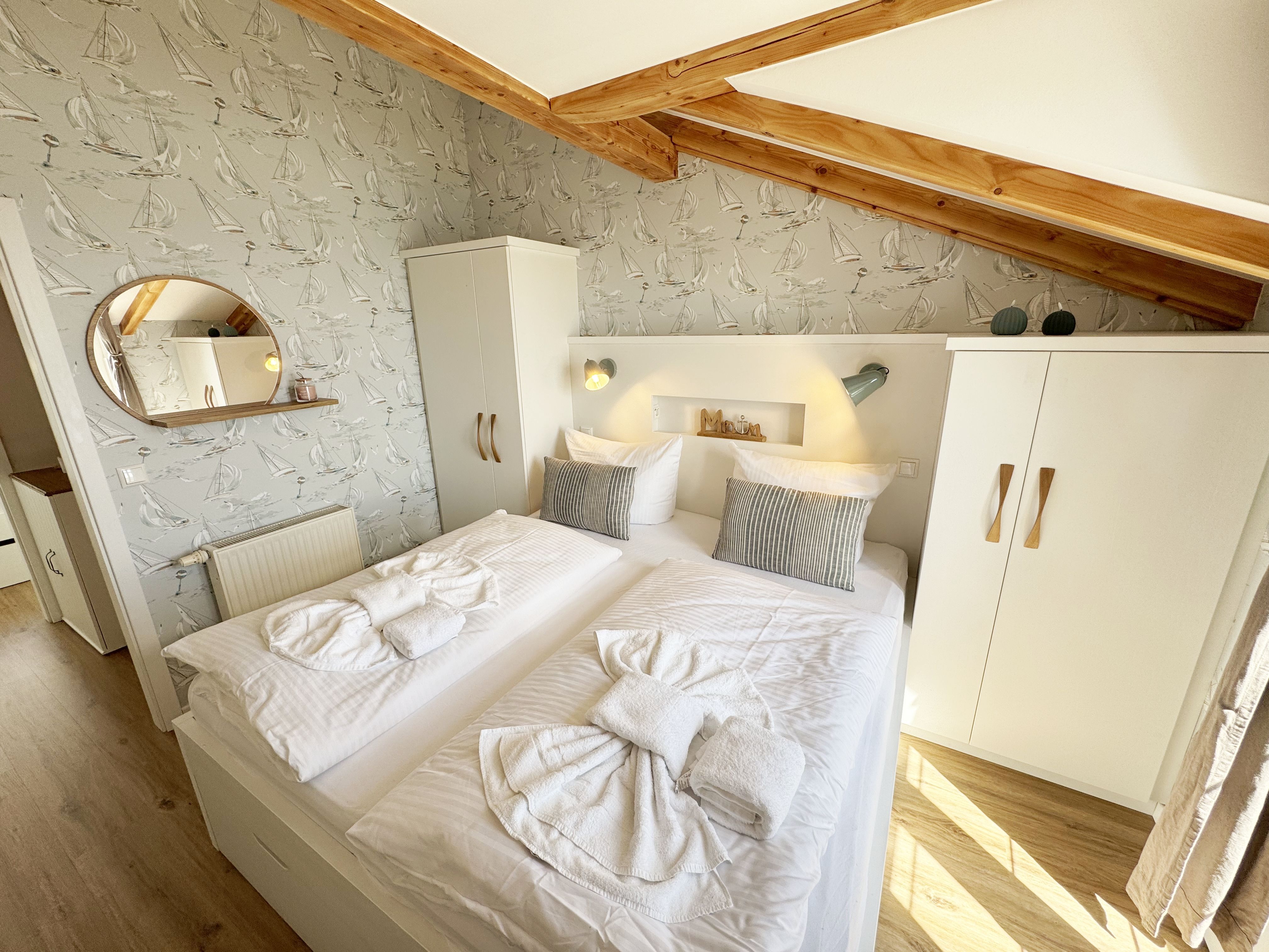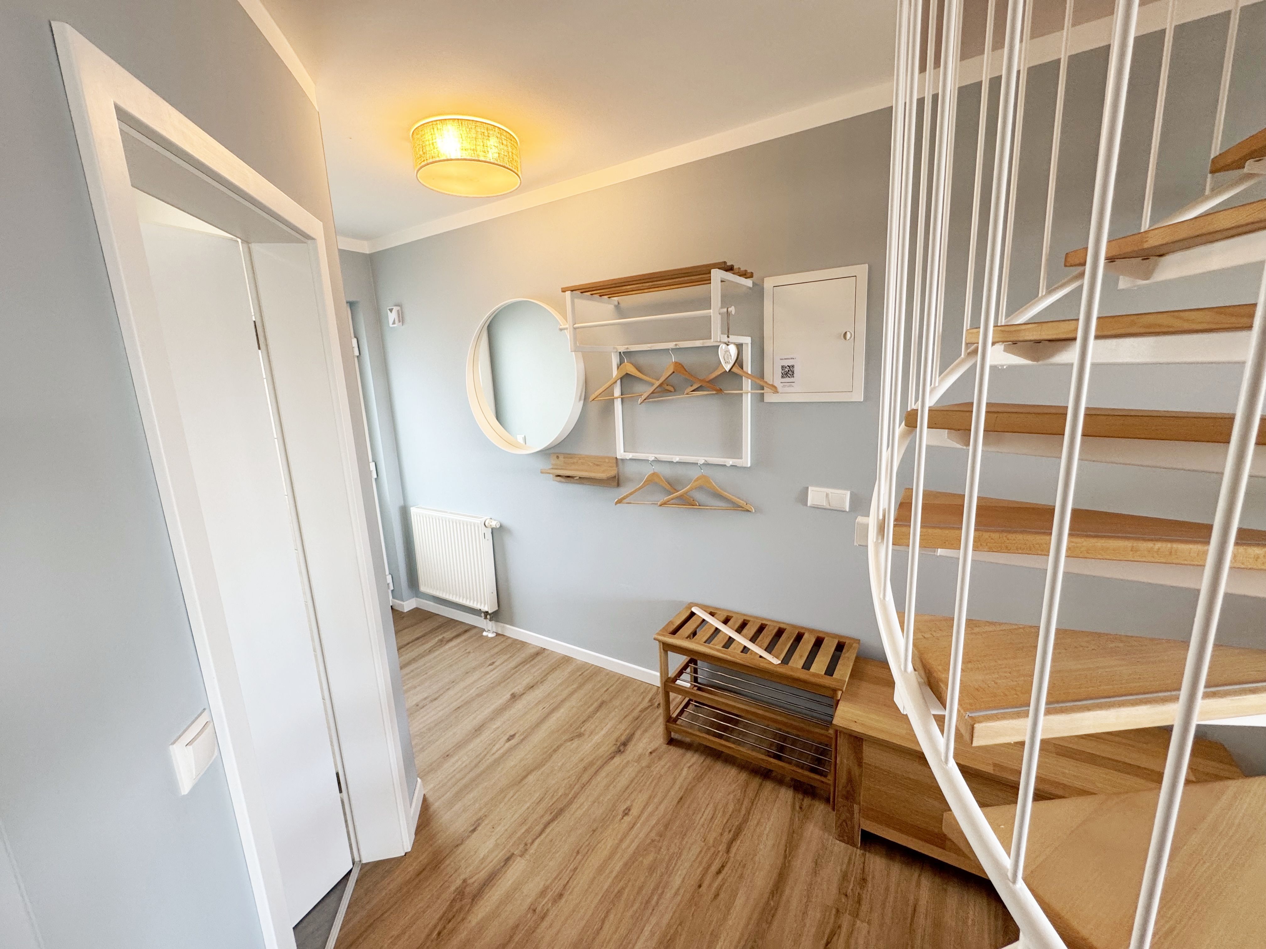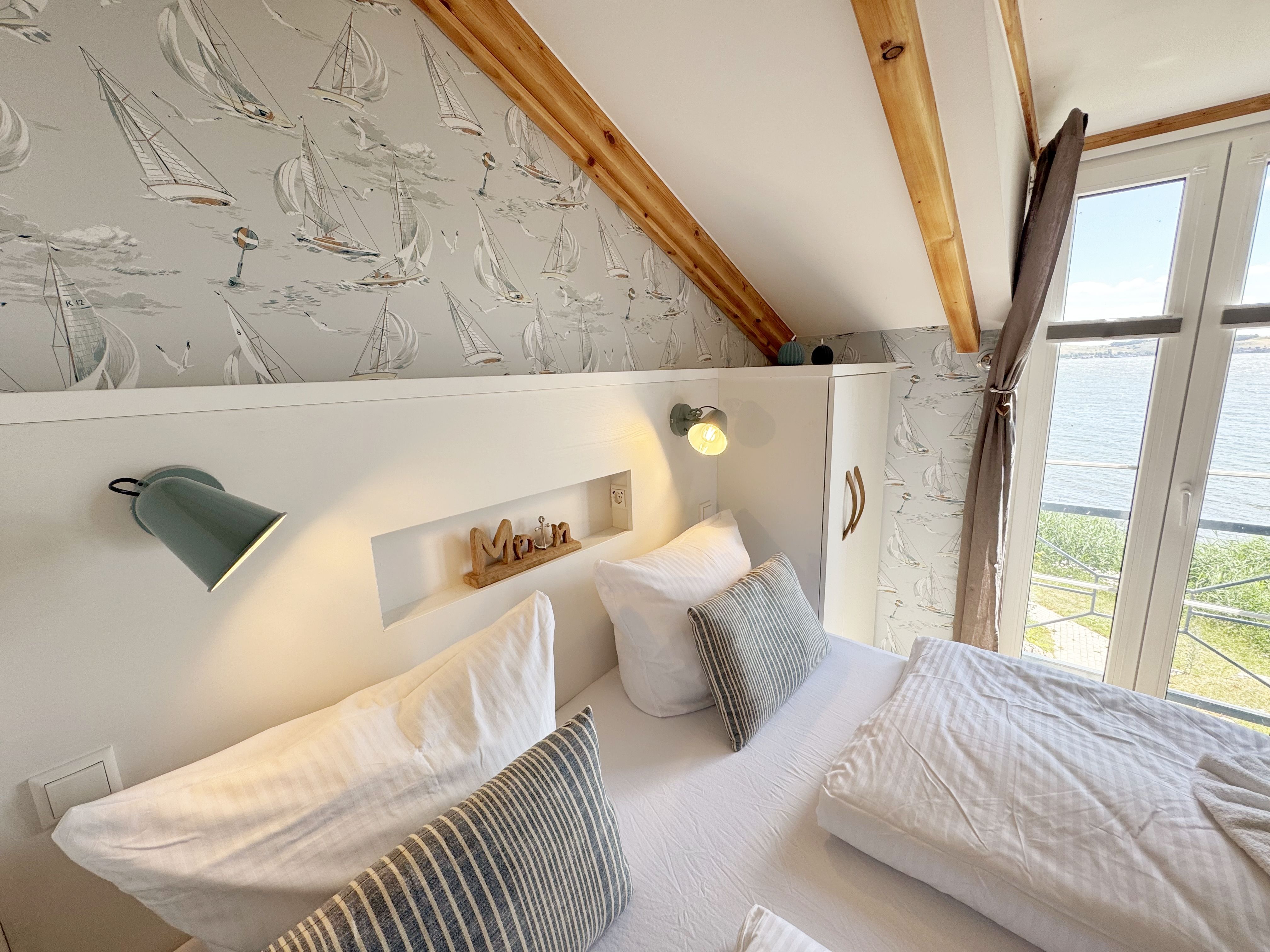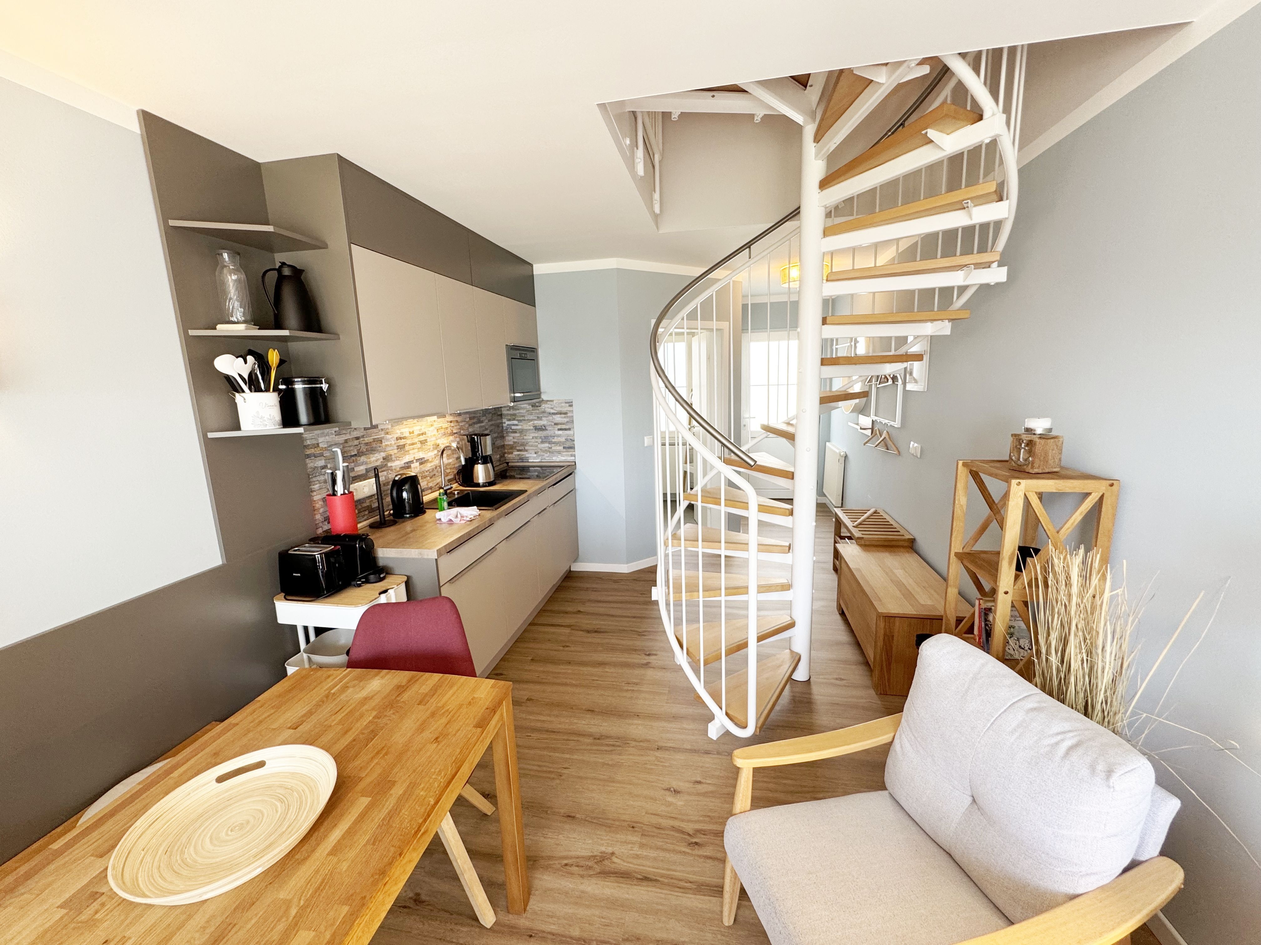 Die modern und liebevoll eingerichtete Wohnung 1 im Haus Seeblick im Maisonette-Stil verfügt über eine sonnige Terrasse mit offenem Seeblick, zwei separate Schlafbereichen im Obergeschoss, sowie einem hellen Wohnbereich mit offener Küchenzeile. Sie umfasst ca. 42qm. Genießen Sie einen unverwechselbaren Seeblick – direkt beim Aufstehen! Der komfortable Wohnbereich mit Couch + Couchtisch, einen Sessel, einer Stehlampe, eine Kommode mit Flachbild-TV sowie ein Regal bietet Ihnen einen gemütlichen Ort zum Ausklingen der erlebnisreichen Tage auf der Halbinsel Mönchgut. Von hier aus gelangen Sie auf die sonnige und bestuhlte Terrasse (Süden) mit Sonnenschirm und einem einzigartigen Seeblick. Angrenzend befindet sich eine offene und voll ausgestattete Küchenzeile mit Spülmaschine, Kühlschrank mit Eisfach, Dunstabzugshaube, Wasserkocher, Kaffeemaschine, Nespresso Maschine,Toaster, Induktionsfeld und Mikrowelle und ein Essplatz. Im Obergeschoss befinden sich die beiden Schlafräume, die jeweils mit einem komfortablen Doppelbett (1,80m x 2,00m) und Kleiderschrank ausgestattet sind. Auf der unteren Ebene befindet sich das freundliche Tageslicht-Bad mit einer ebenerdigen Dusche, ein WC, ein Fön sowie ein Waschplatz mit dazugehörigem Spiegel. Für unsere kleinen Gäste steht ein Hochstuhl sowie ein Kinderreisebett (ohne Bett Inlett/inkl. Matratze) zur Verfügung. Auch ein 4-Beiner ist mit seinem eigenen Schlafplatz gegen eine Gebühr ein gern gesehener Gast. Eine Fahrrad-Unterstellmöglichkeit steht Ihnen und allen Gästen des Hauses zur gemeinschaftlichen Nutzung kostenfrei zur Verfügung. Ihr PKW-Stellplatz befindet sich knapp 100m vom Haus entfernt und ist für Sie inklusive. Die Erstausstattung eines Wäschepaketes (komplette Bettwäsche, 1 Duschhandtuch, 2 kleine Handtücher) können Sie bis 14 Tage vor Anreise gegen einen Aufpreis dazu buchen oder durch eigene ergänzen. Ab 2 gebuchten Paketen erhalten Sie einmalig 1 Geschirrhandtuch und 1 Duschvorleger hinzu.