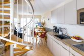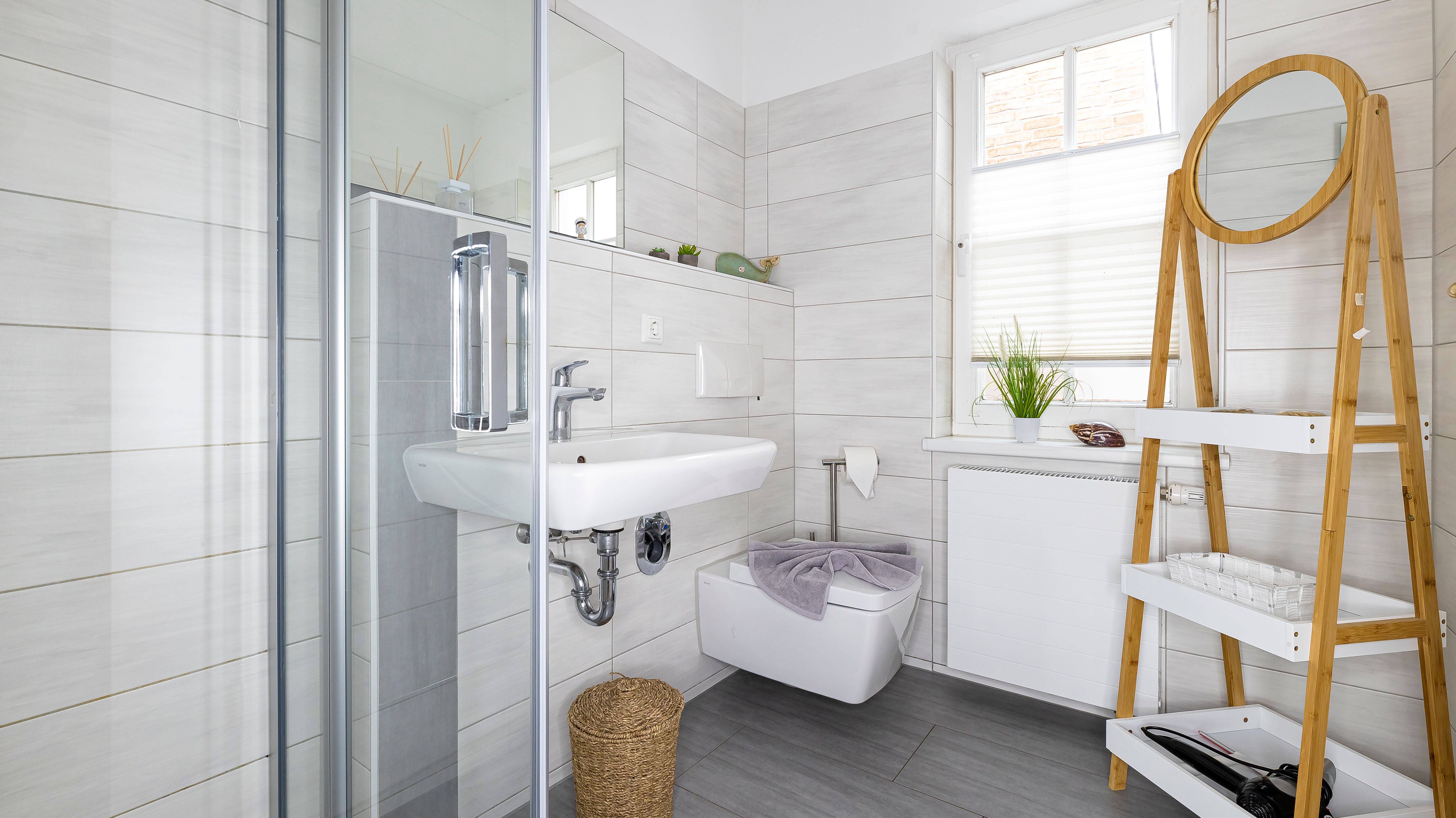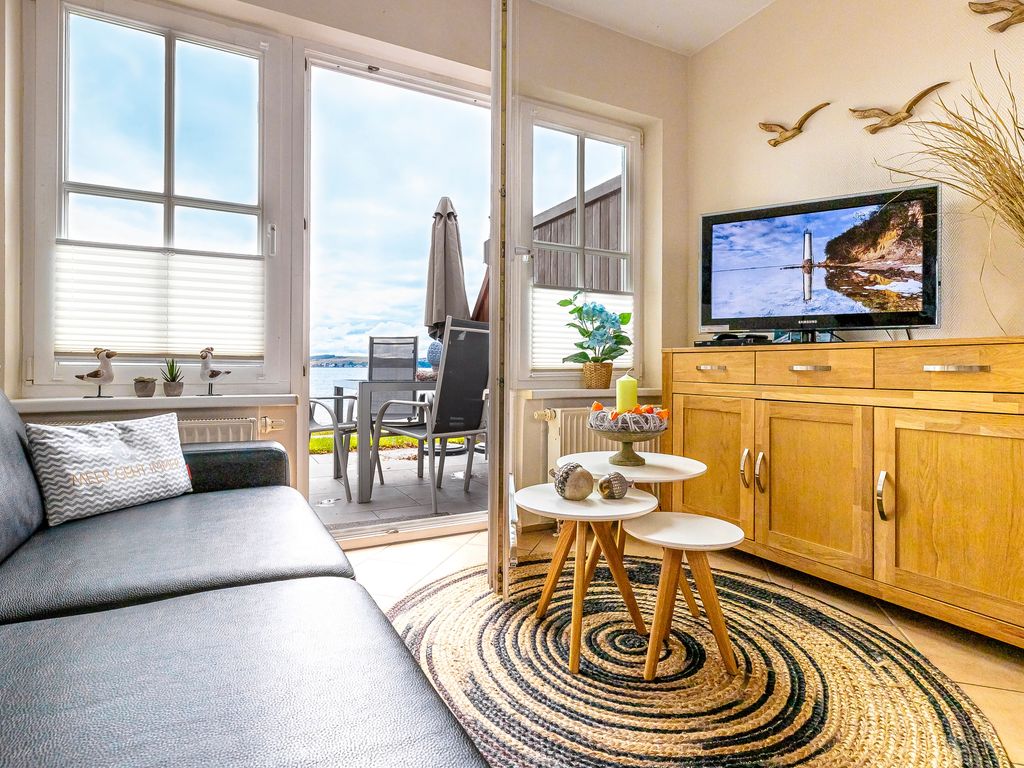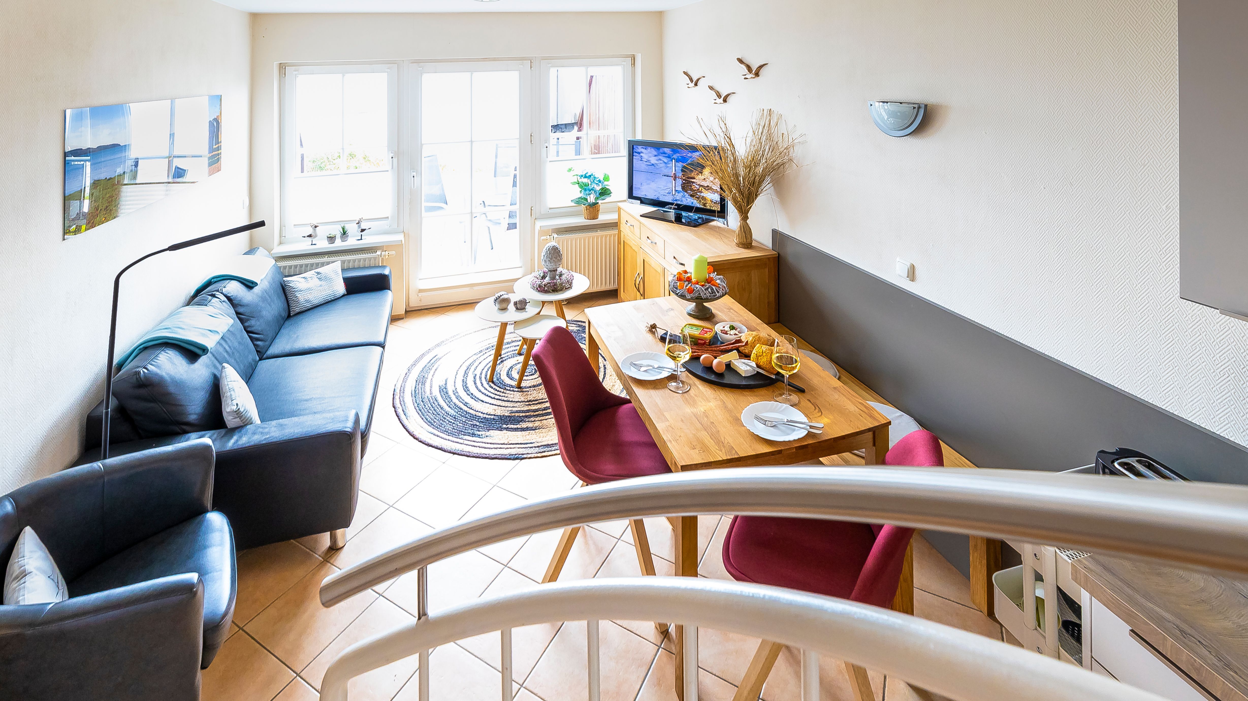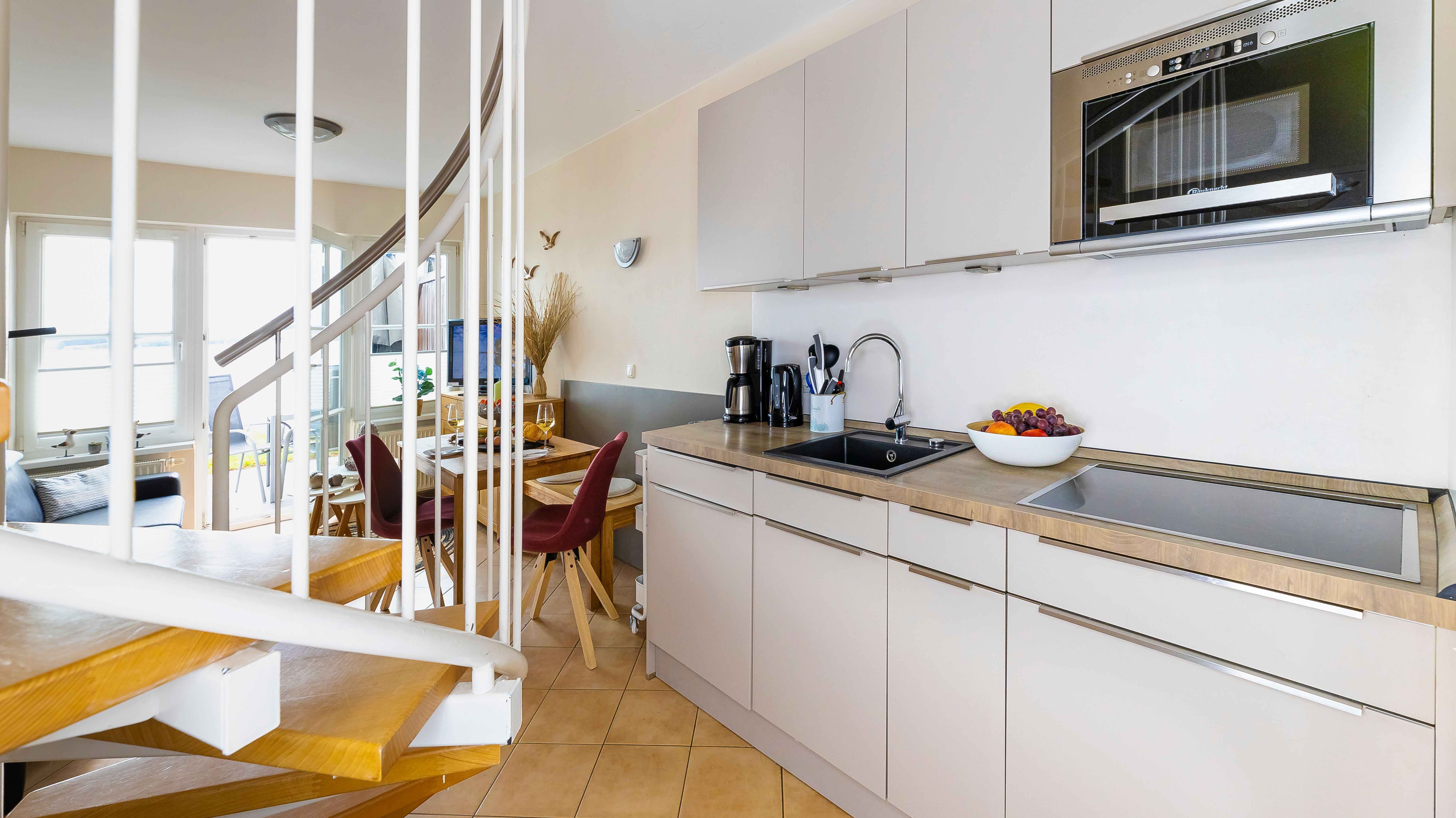 Die modern und liebevoll eingerichtete Wohnung 2 im Haus Seeblick im Maisonette-Stil verfügt über eine sonnige Terrasse mit offenem Seeblick, zwei separate Schlafbereichen im Obergeschoss, sowie einem hellen Wohnbereich mit offener Küchenzeile. Sie umfasst ca. 42qm. Genießen Sie einen unverwechselbaren Seeblick – direkt beim Aufstehen! Der komfortable Wohnbereich mit Couch + Couchtisch, einen Sessel, einer Stehlampe, eine Kommode mit Flachbild-TV sowie ein Regal bietet Ihnen einen gemütlichen Ort zum Ausklingen der erlebnisreichen Tage auf der Halbinsel Mönchgut. Von hier aus gelangen Sie auf die sonnige und bestuhlte Terrasse (Süden) mit Sonnenschirm und einem einzigartigen Seeblick. Angrenzend befindet sich eine offene und voll ausgestattete Küchenzeile mit Spülmaschine, Kühlschrank mit Eisfach, Dunstabzugshaube, Wasserkocher, Kaffeemaschine, Nespresso Maschine, Toaster, Induktionsfeld und Mikrowelle und ein Essplatz. Im Obergeschoss befinden sich die beiden Schlafräume, die jeweils mit einem komfortablen Doppelbett (1,80m x 2,00m) und Kleiderschrank ausgestattet sind. Auf der unteren Ebene befindet sich das freundliche Tageslicht-Bad mit einer ebenerdigen Dusche, ein WC, ein Fön sowie ein Waschplatz mit dazugehörigem Spiegel. Für unsere kleinen Gäste steht ein Hochstuhl sowie ein Kinderreisebett (ohne Bett Inlett/inkl. Matratze) zur Verfügung. Auch ein 4-Beiner ist mit seinem eigenen Schlafplatz gegen eine Gebühr ein gern gesehener Gast. Eine Fahrrad-Unterstellmöglichkeit steht Ihnen und allen Gästen des Hauses zur gemeinschaftlichen Nutzung kostenfrei zur Verfügung. Ihr PKW-Stellplatz befindet sich knapp 100m vom Haus entfernt und ist für Sie inklusive. Die Erstausstattung eines Wäschepaketes (komplette Bettwäsche, 1 Duschhandtuch, 2 kleine Handtücher) können Sie bis 14 Tage vor Anreise gegen einen Aufpreis dazu buchen oder durch eigene ergänzen. Ab 2 gebuchten Paketen erhalten Sie einmalig 1 Geschirrhandtuch und 1 Duschvorleger hinzu.