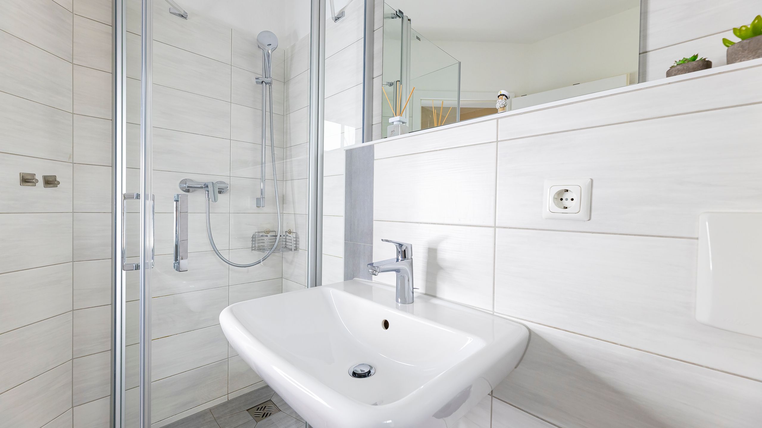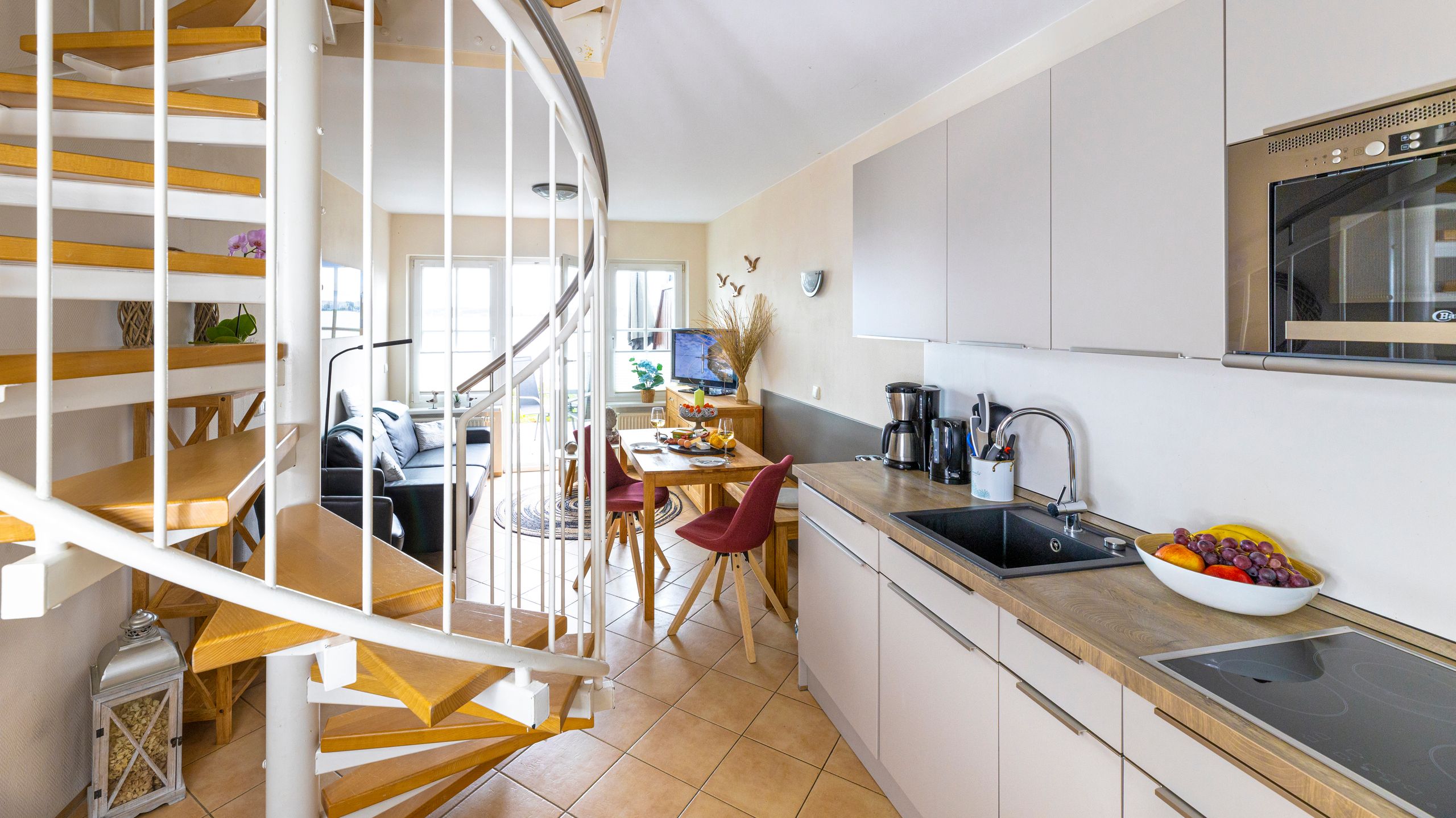Die modern und liebevoll eingerichtete Wohnung 2 im Haus Seeblick im Maisonette-Stil verfügt über eine sonnige Terrasse mit offenem Seeblick, zwei separate Schlafbereichen im Obergeschoss, sowie einem hellen Wohnbereich mit offener Küchenzeile. Sie umfasst ca. 42qm. Genießen Sie einen unverwechselbaren Seeblick direkt beim Aufstehen! Der komfortable Wohnbereich mit Couch + Couchtisch, einen Sessel, einer Stehlampe, eine Kommode mit Flachbild-TV sowie ein Regal bietet Ihnen einen gemütlichen Ort zum Ausklingen der erlebnisreichen Tage auf der Halbinsel Mönchgut. Von hier aus gelangen Sie auf die sonnige und bestuhlte Terrasse (Süden) mit Sonnenschirm und einem einzigartigen Seeblick. Angrenzend befindet sich eine offene und voll ausgestattete Küchenzeile mit Spülmaschine, Kühlschrank mit Eisfach, Dunstabzugshaube, Wasserkocher, Kaffeemaschine, Nespresso Maschine, Toaster, Induktionsfeld und Mikrowelle und ein Essplatz. Im Obergeschoss befinden sich die beiden Schlafräume, die jeweils mit einem komfortablen Doppelbett (1,80m x 2,00m) und Kleiderschrank ausgestattet sind. Auf der unteren Ebene befindet sich das freundliche Tageslicht-Bad mit einer ebenerdigen Dusche, ein WC, ein Fön sowie ein Waschplatz mit dazugehörigem Spiegel. Für unsere kleinen Gäste steht ein Hochstuhl sowie ein Kinderreisebett (ohne Bett Inlett/inkl. Matratze) zur Verfügung. Auch ein 4-Beiner ist mit seinem eigenen Schlafplatz gegen eine Gebühr ein gern gesehener Gast. Eine Fahrrad-Unterstellmöglichkeit steht Ihnen und allen Gästen des Hauses zur gemeinschaftlichen Nutzung kostenfrei zur Verfügung. Ihr PKW-Stellplatz befindet sich knapp 100m vom Haus entfernt und ist für Sie inklusive. Die Erstausstattung eines Wäschepaketes (komplette Bettwäsche, 1 Duschhandtuch, 2 kleine Handtücher) können Sie bis 14 Tage vor Anreise gegen einen Aufpreis dazu buchen oder durch eigene ergänzen. Ab 2 gebuchten Paketen erhalten Sie einmalig 1 Geschirrhandtuch und 1 Duschvorleger hinzu.