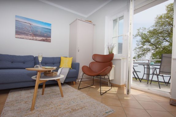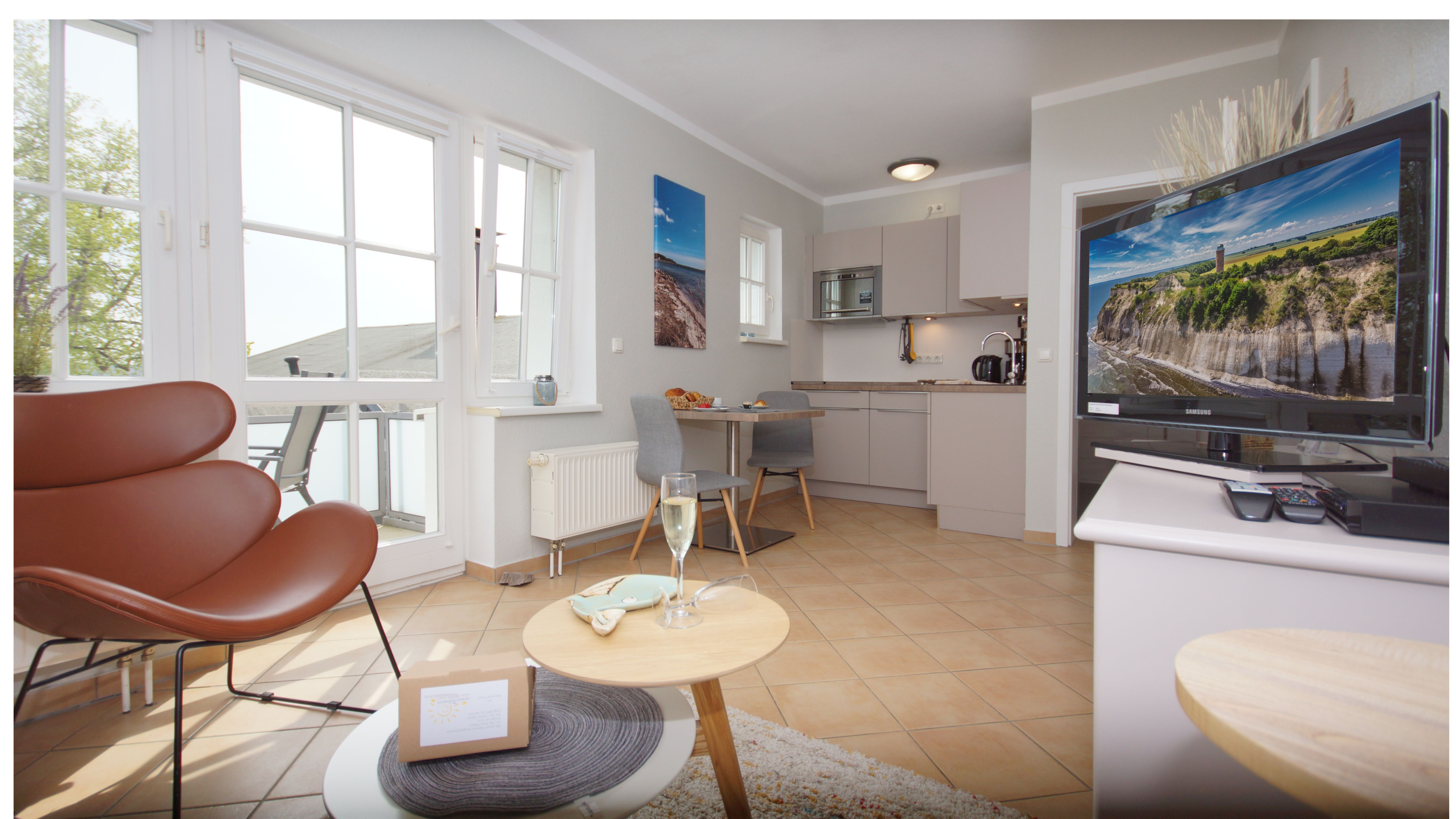 Die modern und liebevoll eingerichtete Wohnung 6 im Haus Seeblick verfügt über einen separaten Schlafbereich, einen hellen Wohnbereich mit offener Küchenzeile, sowie ein Badezimmer mit Dusche und WC. Sie umfasst ca. 37qm und bietet Ihnen Platz für max. 2 Erwachsene + 1 Kind bis 17 Jahre. Der komfortable Wohnbereich mit einer Schlafcouch (Aufbettungsmöglichkeit 1,40m x 1,90m) + Couchtisch, einer Stehlampe sowie einer Kommode mit Flachbild-TV bietet Ihnen einen gemütlichen Ort zum Ausklingen der erlebnisreichen Tage auf der Halbinsel Mönchgut. Von hier gelangen Sie auf den bestuhlten Balkon mit Sonnenschirm Richtung Süden und Seeblick. Angrenzend befindet sich eine offene, voll ausgestattete Küchenzeile mit Spülmaschine, Kühlschrank mit Eisfach, Dunstabzugshaube, Wasserkocher, Kaffeemaschine, Nespresso Maschine, Toaster, Induktionsfeld, Mikrowelle und Essplatz. Direkt nebenan befindet sich das geräumige Schlafzimmer mit Doppelbett (1,80m x 2,00m), Insektenschutzgitter und Kleiderschrank. Das innenliegende und freundliche Badezimmer bietet Ihnen eine Dusche, ein WC, ein Fön, ein Kosmetikspiegel und ein Waschplatz mit dazugehörigem Spiegel. Für unsere kleinen Gäste steht ein Hochstuhl sowie ein Kinderreisebett (ohne Bett Inlett/inkl. Matratze) zur Verfügung. Auch ein 4-Beiner ist mit seinem eigenen Schlafplatz gegen eine Gebühr ein gern gesehener Gast. Eine Fahrrad-Unterstellmöglichkeit steht Ihnen und allen Gästen des Hauses zur gemeinschaftlichen Nutzung kostenfrei zur Verfügung. Ihr PKW-Stellplatz befindet sich knapp 100m vom Haus entfernt und ist für Sie inklusive. Die Erstausstattung eines Wäschepaketes (komplette Bettwäsche, 1 Duschhandtuch, 2 kleine Handtücher) können Sie bis 14 Tage vor Anreise gegen einen Aufpreis dazu buchen oder durch eigene ergänzen. Ab 2 gebuchten Paketen erhalten Sie einmalig 1 Geschirrhandtuch und 1 Duschvorleger hinzu.