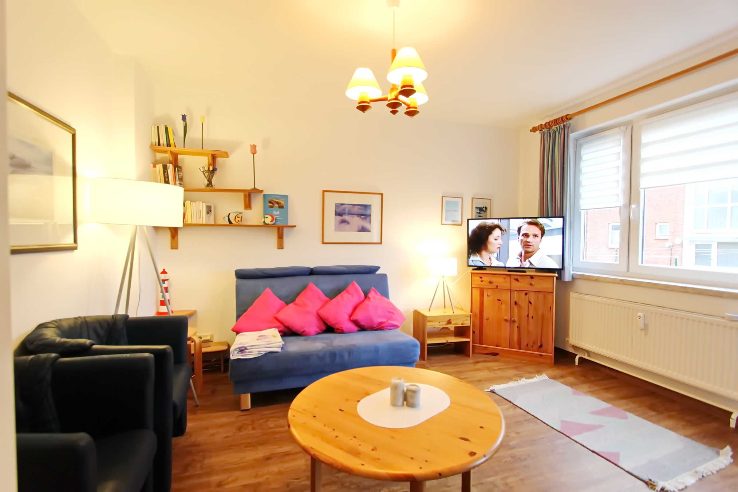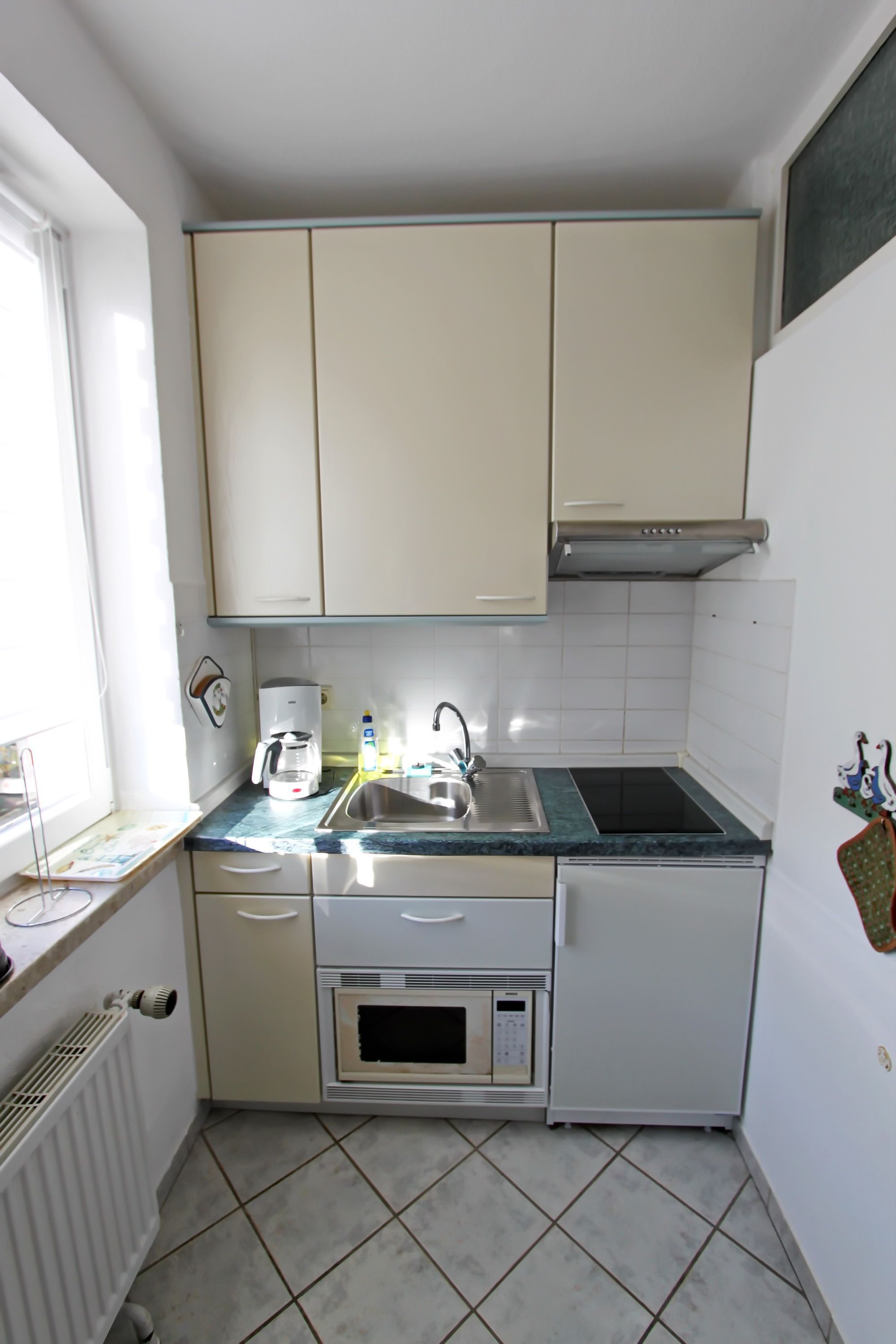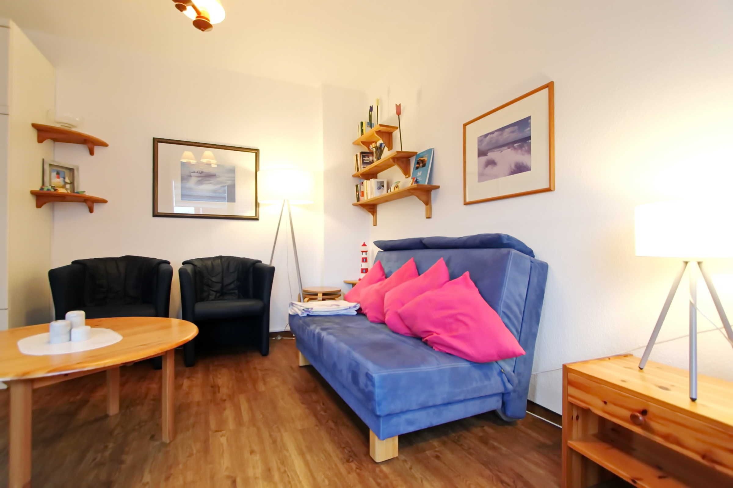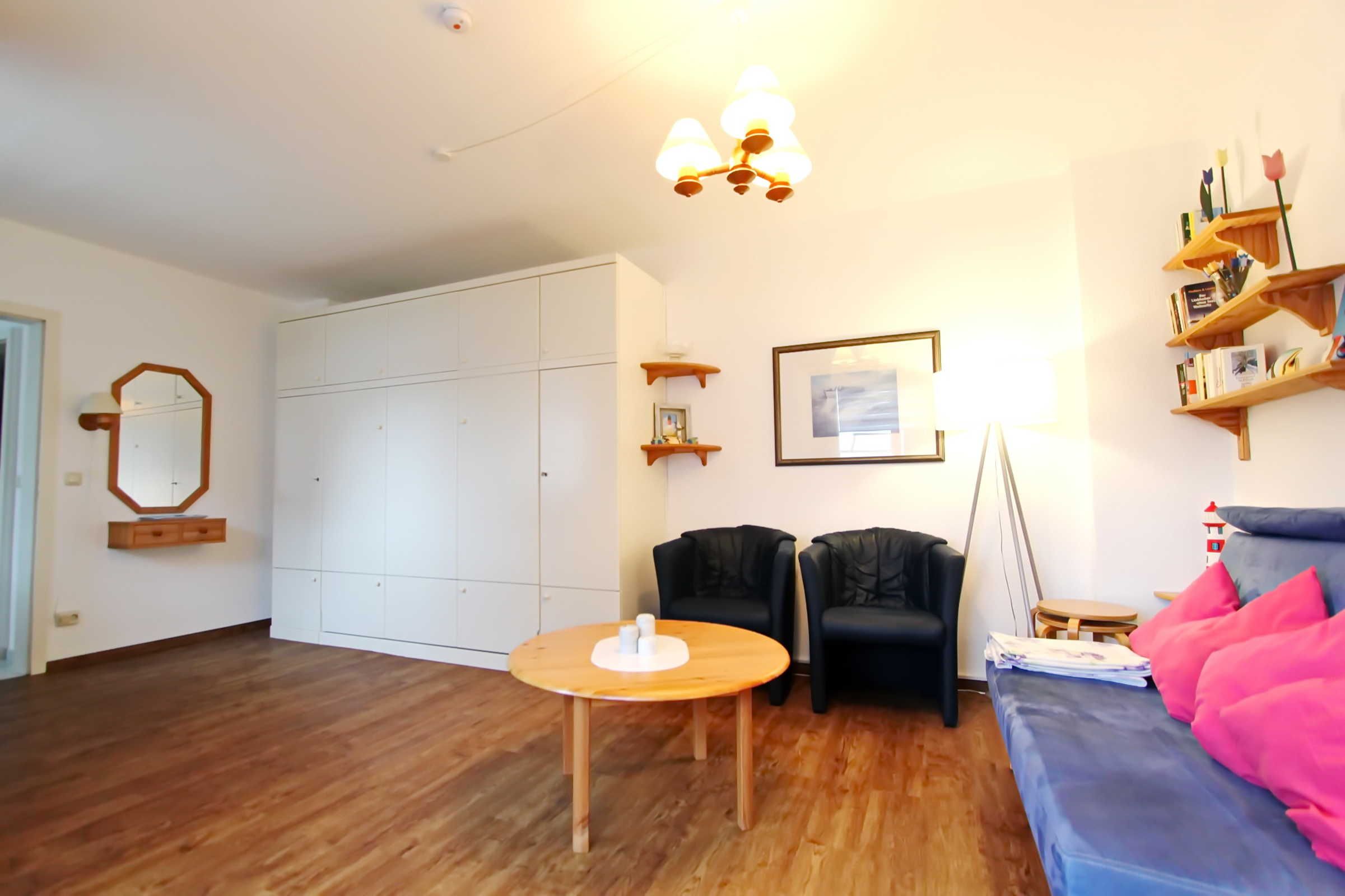 modernes 1 Zimmer Appartement mit ca. 32m² unweit des Hörnumer Golfplatzes; ein Wohn-/Schlafraum mit Doppelschrankbett, Zweisitzer-Couch, 2 Sessel, Tisch, Kommode, Schrank, Sat-TV, Radio mit CD-Player, Zugang zum Westbalkon mit Bestuhlung; kleine separate Pantryküche mit neuem Cerankochfeld (2 Platten), neuer Dunstabzugshaube, Mikrowelle und neuem Kühlschrank mit Gefrierfach; Esstisch für 2 Personen; Flur mit Garderobe und Abstellkammer; neues Duschbad/WC.