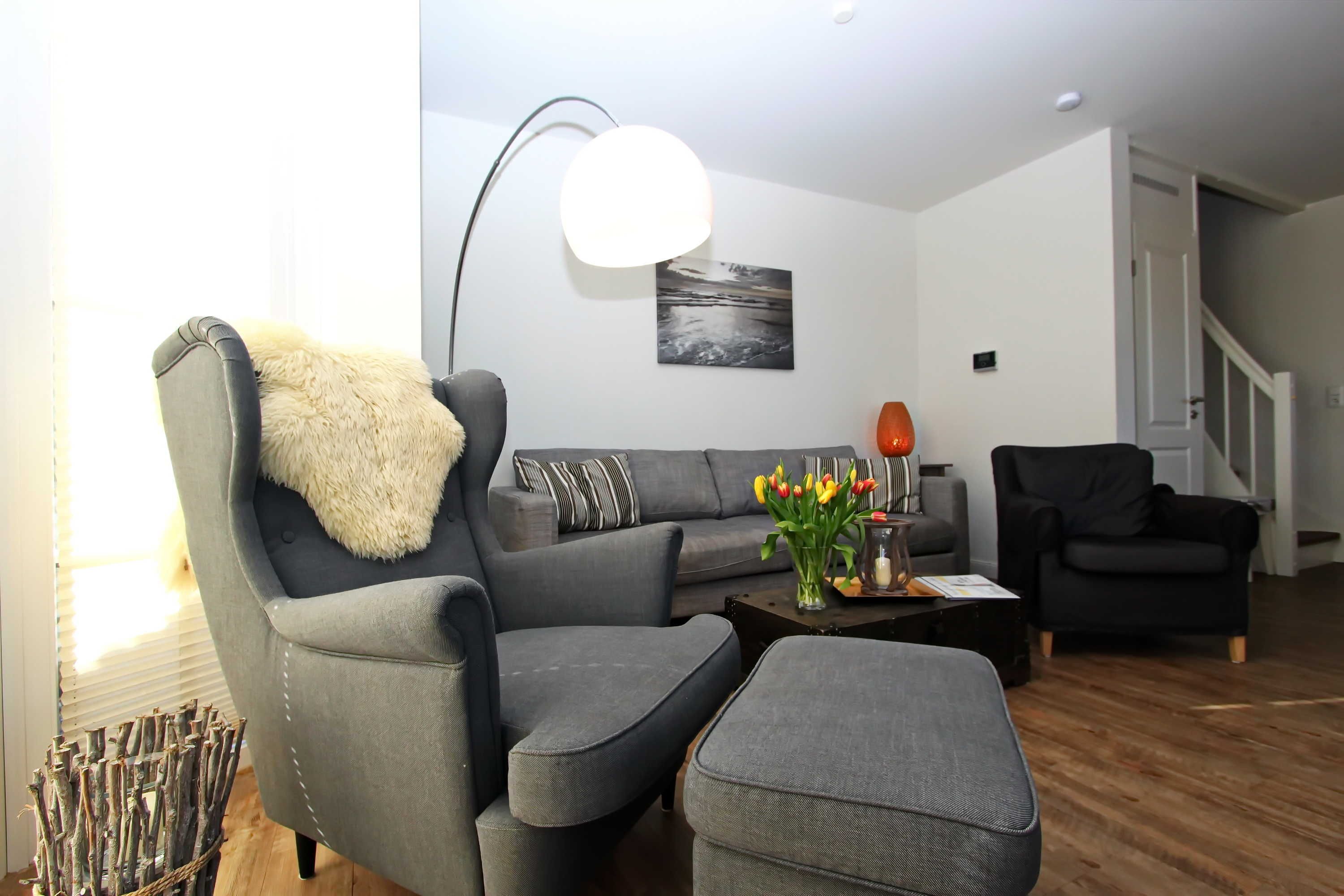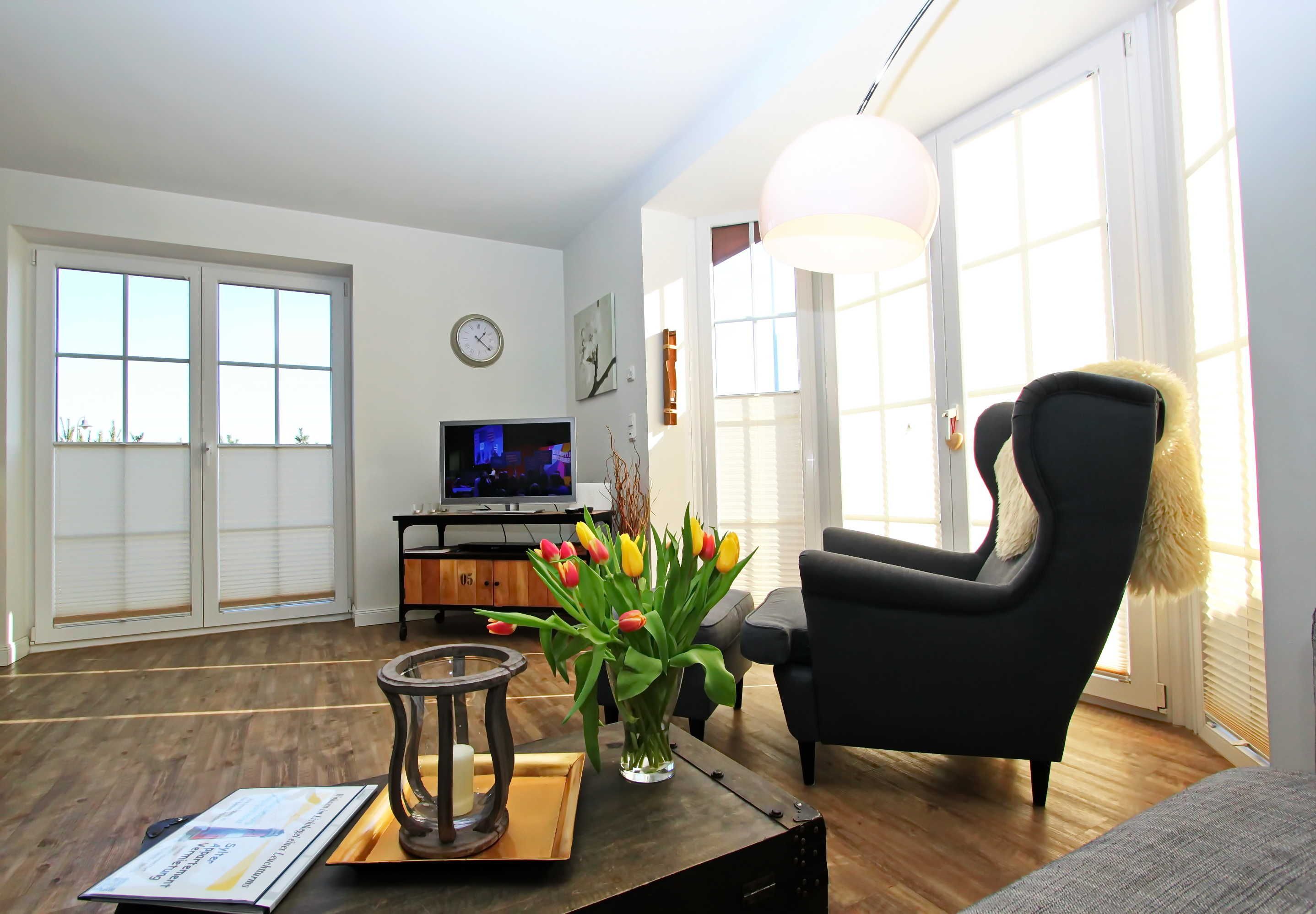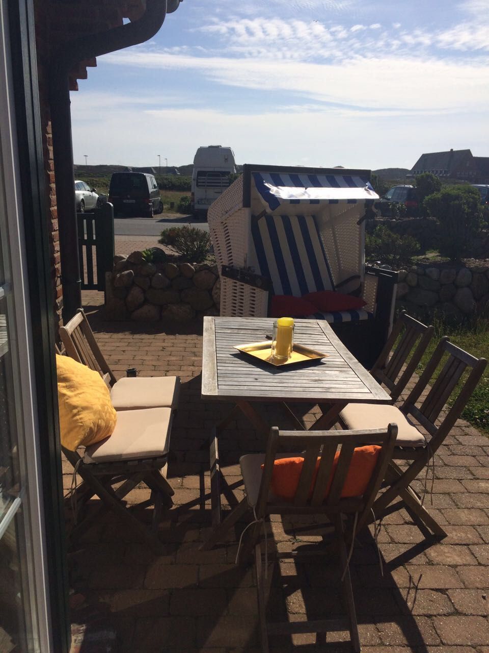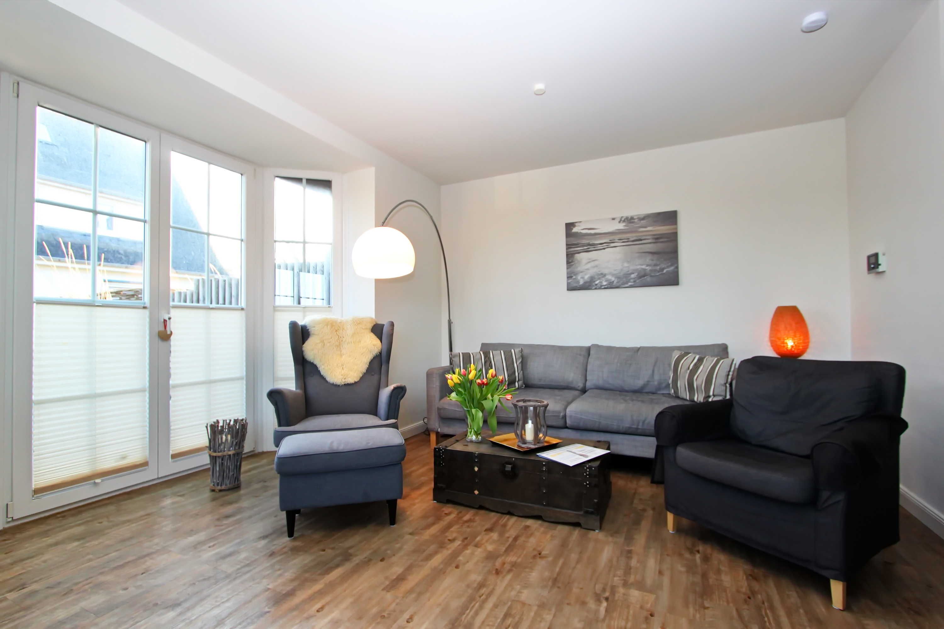 Das Endhausteil hat eine Größe von ca. 84 m² und bietet Platz für bis zu 8 Personen. Im EG befindet sich ein großer Wohnraum mit offener Einbauküche und Essplatz. Die gemütliche Couch (ausklappbar) lädt zum Verweilen ein. In der Einbauküche befindet sich ein Backofen, Geschirrspüler, Kühlschrank mit Gefrierfach, Cerankochfeld, etc. Vom Wohnraum können Sie auf die beiden Terrassen (Ost- und Südterrasse) gehen. Dort sind Terrassenmöbel und auch ein Strandkorb in dem Sie die Sonnenstunden genießen können. Eine Abseite unter der Treppe bietet ausreichend Stauraum für Ihr Gepäck. Im oberen Teil des Hauses befinden sich drei Schlafräume mit je einem französischen Doppelbett, sowie Einbauschränke die ausreichend Platz bieten. Duschbad/WC. Alle Schlafräume haben einen TV-Anschluss. Im EG befindet sich noch ein Gäste-WC. Ein PKW-Stellplatz befindet sich direkt vor dem Haus. Die Tierhaltung ist auf Anfrage gestattet. Das Rauchen ist verboten!