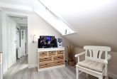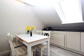 in 2016 kernsaniertes 2 Zimmer DG Appartement im Ortskern von Hörnum mit ca. 35m² für bis 3-4 Personen; Ein Wohnraum mit einer neuen Schlafcouch, Tisch, Relax-Sessel zum Entspannen, Esstisch mit 4 Stühlen, offene Einbauküche mit Cerankochfeld, Backofen, Kühlschrank mit Gefrierfach und Geschirrspüler, Sat-Flat-TV, Sideboard, Kommode, separater Schlafraum mit Doppelbett und Regalschrank; Flur mir Garderobe und Bank, Duschbad/WC. Das Rauchen ist nicht gestattet! Die Tierhaltung ist gestattet! Ein PKW-Stellplatz (Nr. 9) gehört zum Appartement. WLAN und Festnetzanschluss kostenlos vorhanden. Das Appartement wurde Anfang 2016 komplett renoviert.