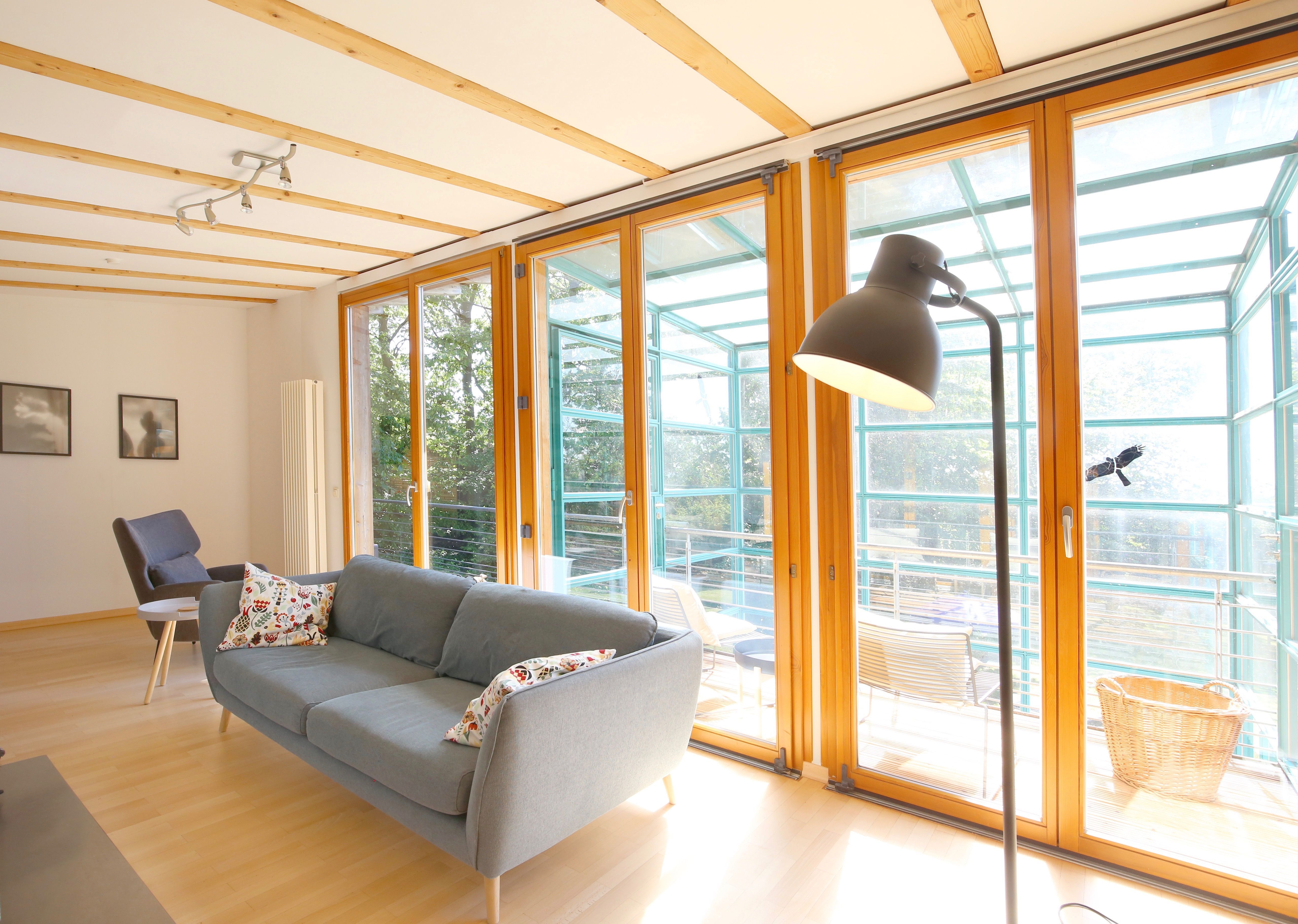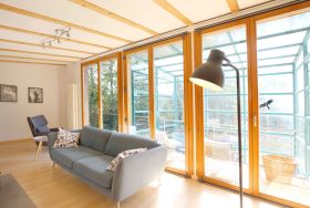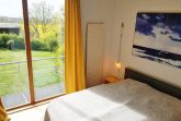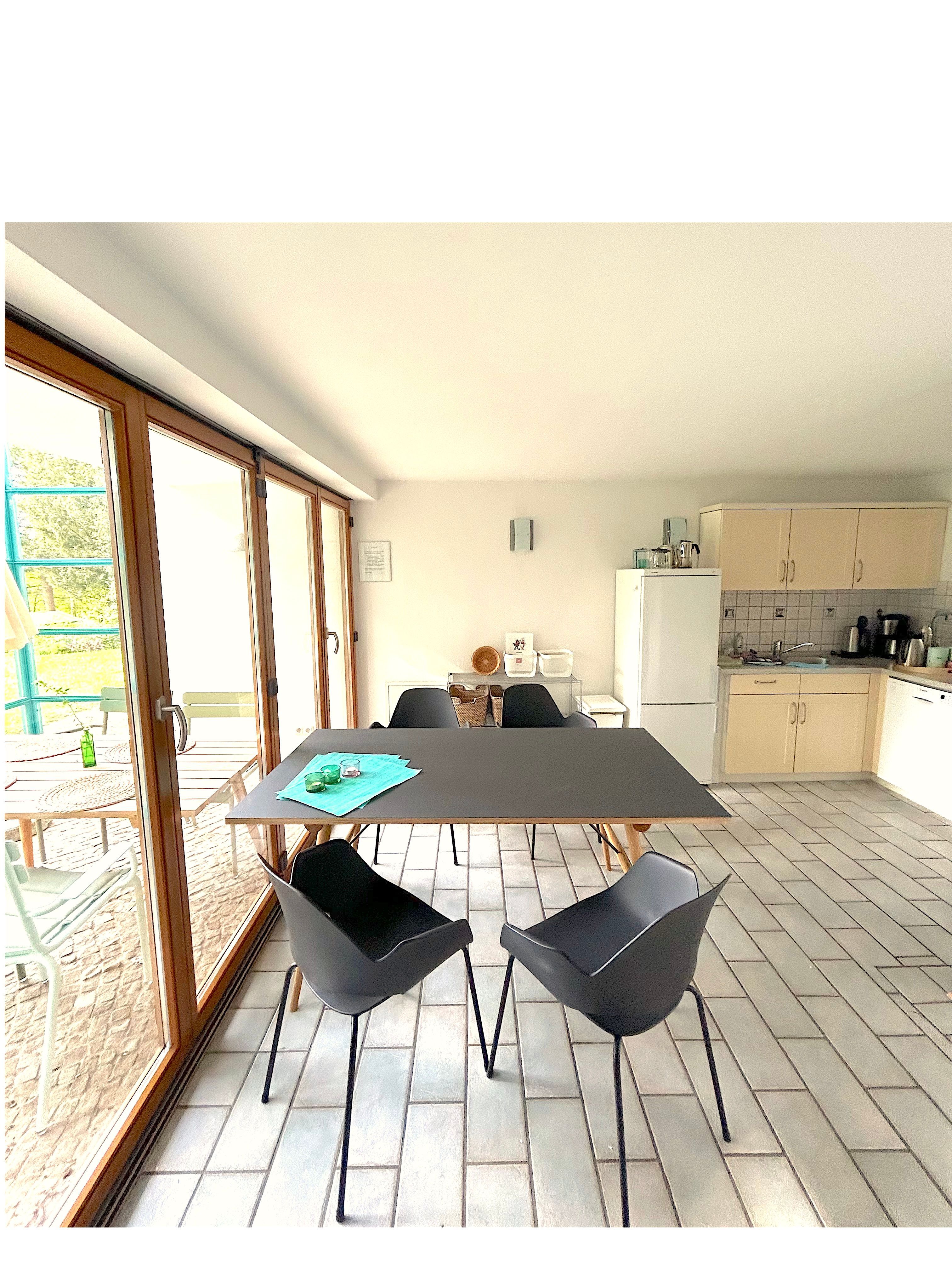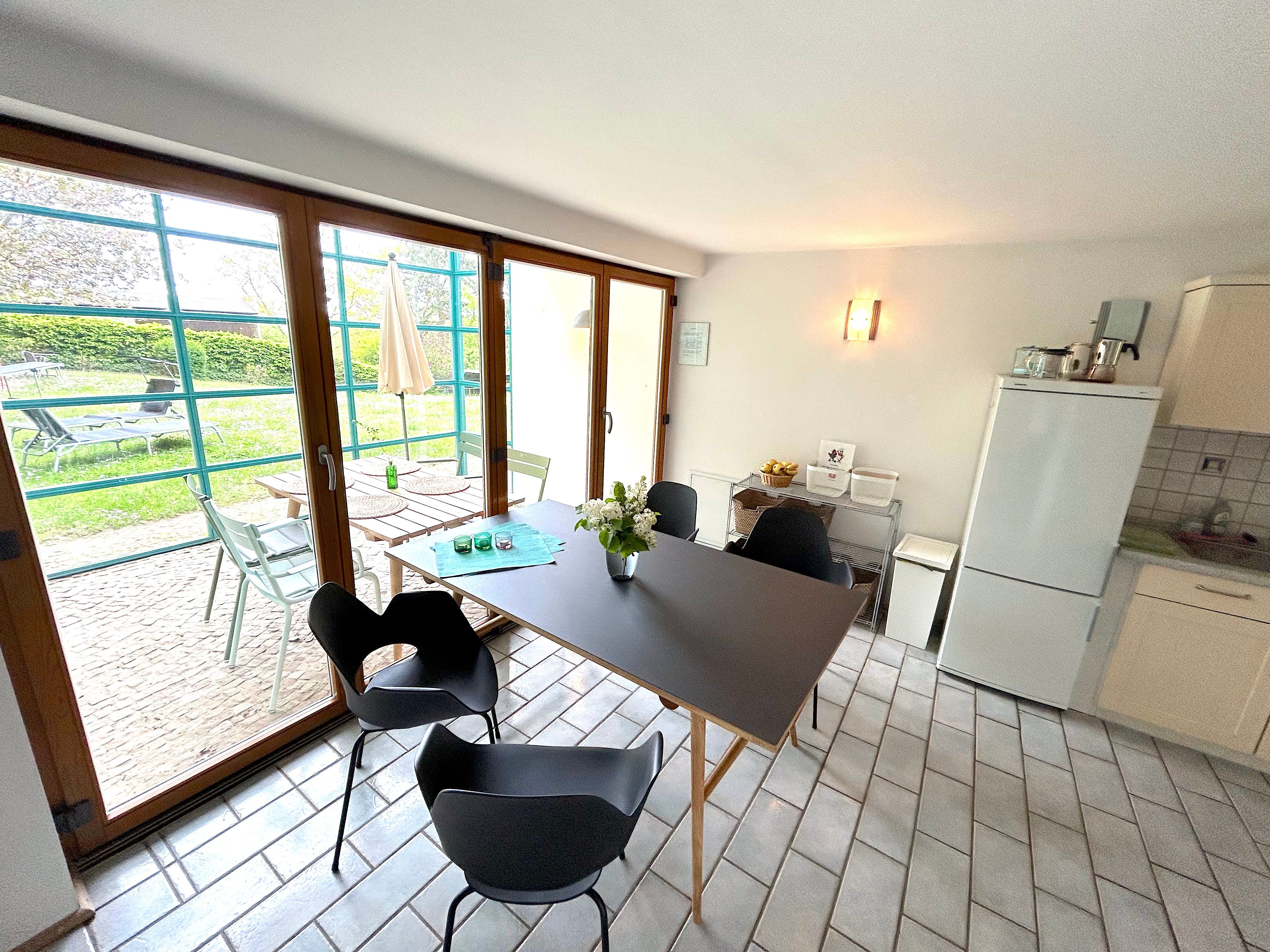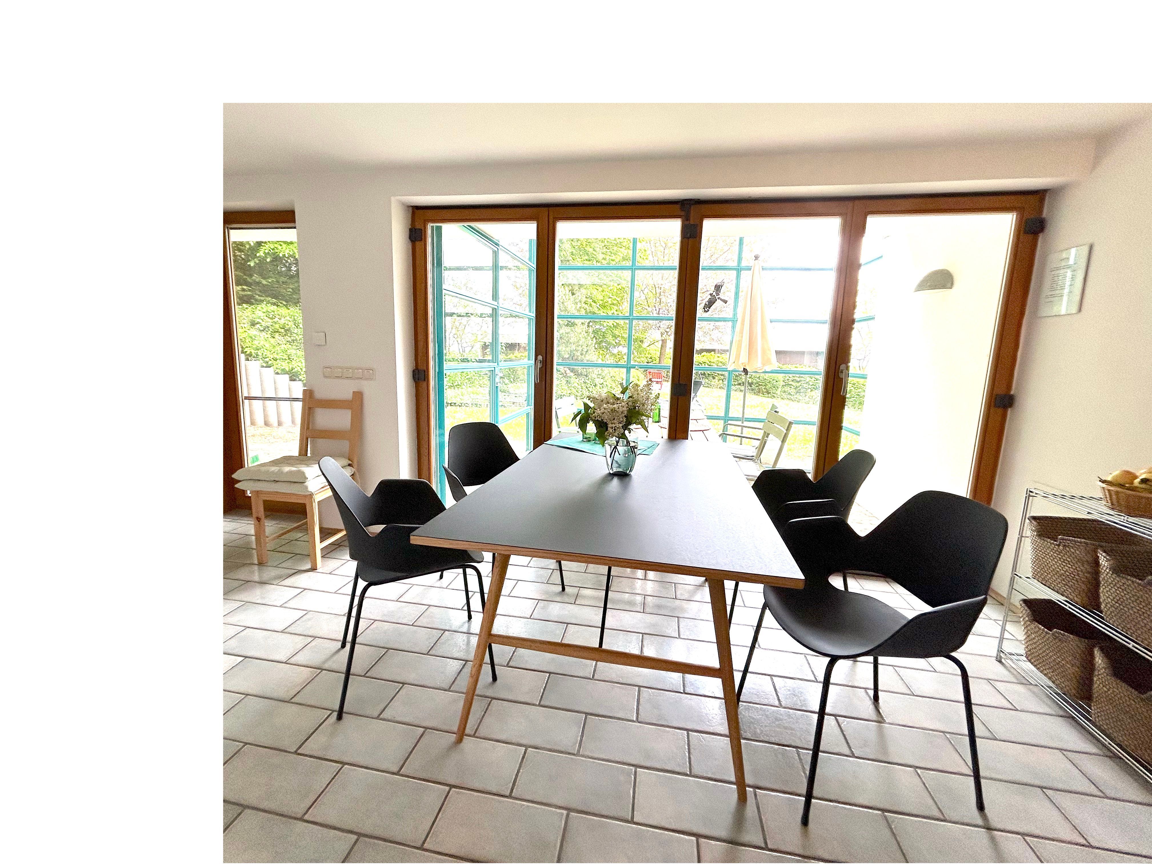 Im Erdgeschoß liegt die komplett eingerichtete Küche mit Geschirrspüler, Mikrowelle, Backofen und Kombikühlschrank sowie ein Gäste-WC. Hier befindet sich auch der Essbereich und weiterhin eine Sitzgelegenheit im Wintergarten, welcher durch die Glasschiebetüren betreten werden kann. Die Küche wird mit einer Fußbodenheizung beheizt. Von hier aus geht es hinaus auf die kleine Terrasse und die große Wiese davor. Sonnenliegen, Sonnenschirm, Grillmöglichkeit und PKW-Stellplatz sind vorhanden. Bettwäsche und Handtücher (exklusive Saunahandtücher) sind mit der Wohnung zu mieten.