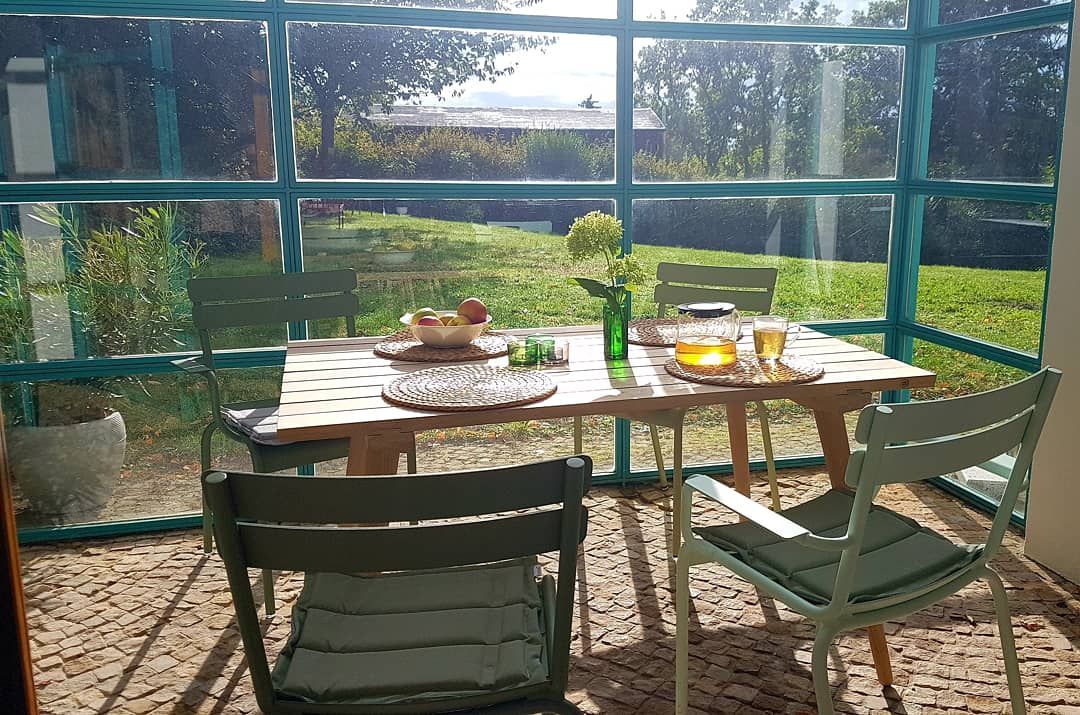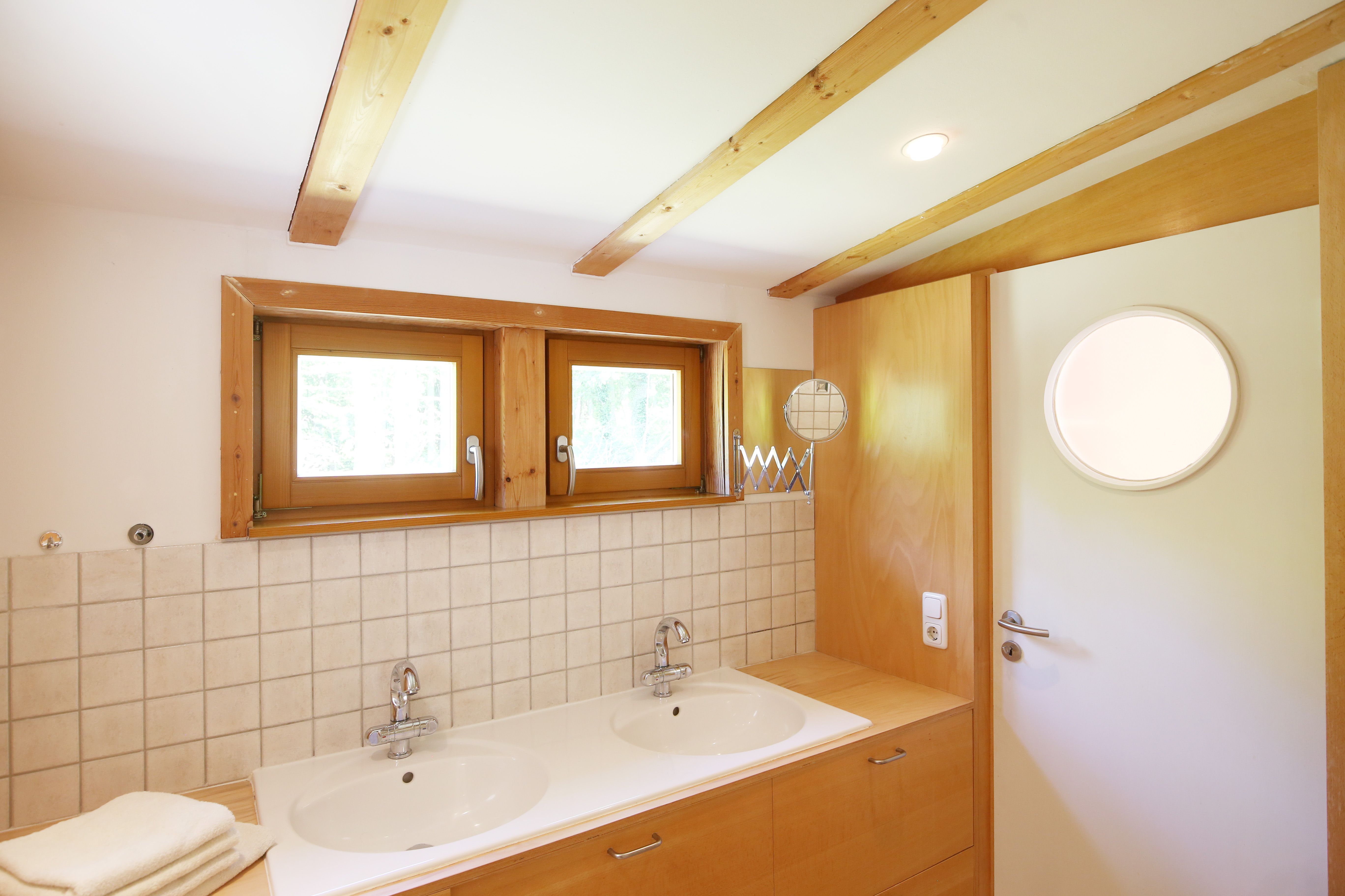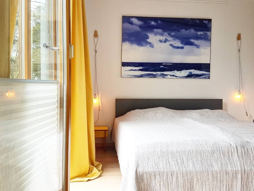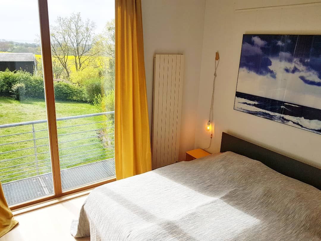 Im Erdgeschoß liegt die komplett eingerichtete Küche mit Geschirrspüler, Mikrowelle, Backofen und Kombikühlschrank sowie ein Gäste-WC. Hier befindet sich auch der Essbereich und weiterhin eine Sitzgelegenheit im Wintergarten, welcher durch die Glasschiebetüren betreten werden kann. Die Küche wird mit einer Fußbodenheizung beheizt. Von hier aus geht es hinaus auf die kleine Terrasse und die große Wiese davor. Sonnenliegen, Sonnenschirm, Grillmöglichkeit und PKW-Stellplatz sind vorhanden. Bettwäsche und Handtücher (exklusive Saunahandtücher) sind mit der Wohnung zu mieten.